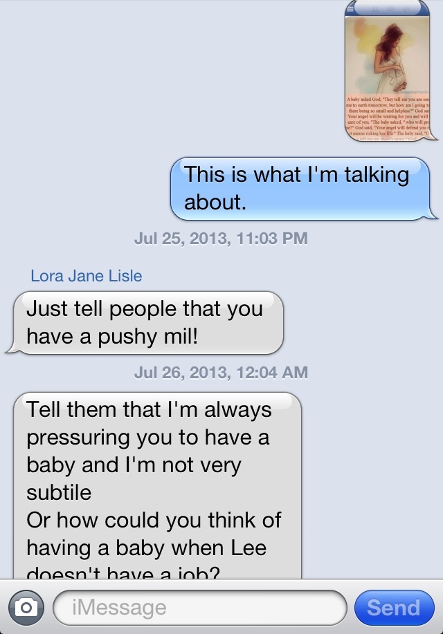 Fast forward less than a week. I have people coming out of the woodwork calling and texting and asking if I was pregnant. I asked them what makes you think that? Their response was my MIL had posted a drawing of a pregnant woman with a superimposed poem about an unborn child and God having a conversation. WTF!?! She did the one thing we SPECIFICALLY told her not to do. Then, she didnt see why it was a big deal when I confronted her, and told me to just lie to the people asking me. Seriously. Then she added a zinger in to tell people how could we possibly think if having a baby when hubby doesnt have a job? ughhhhhhhhh!!!! So I've deactivated my Facebook but will reactivate to post the announcement.