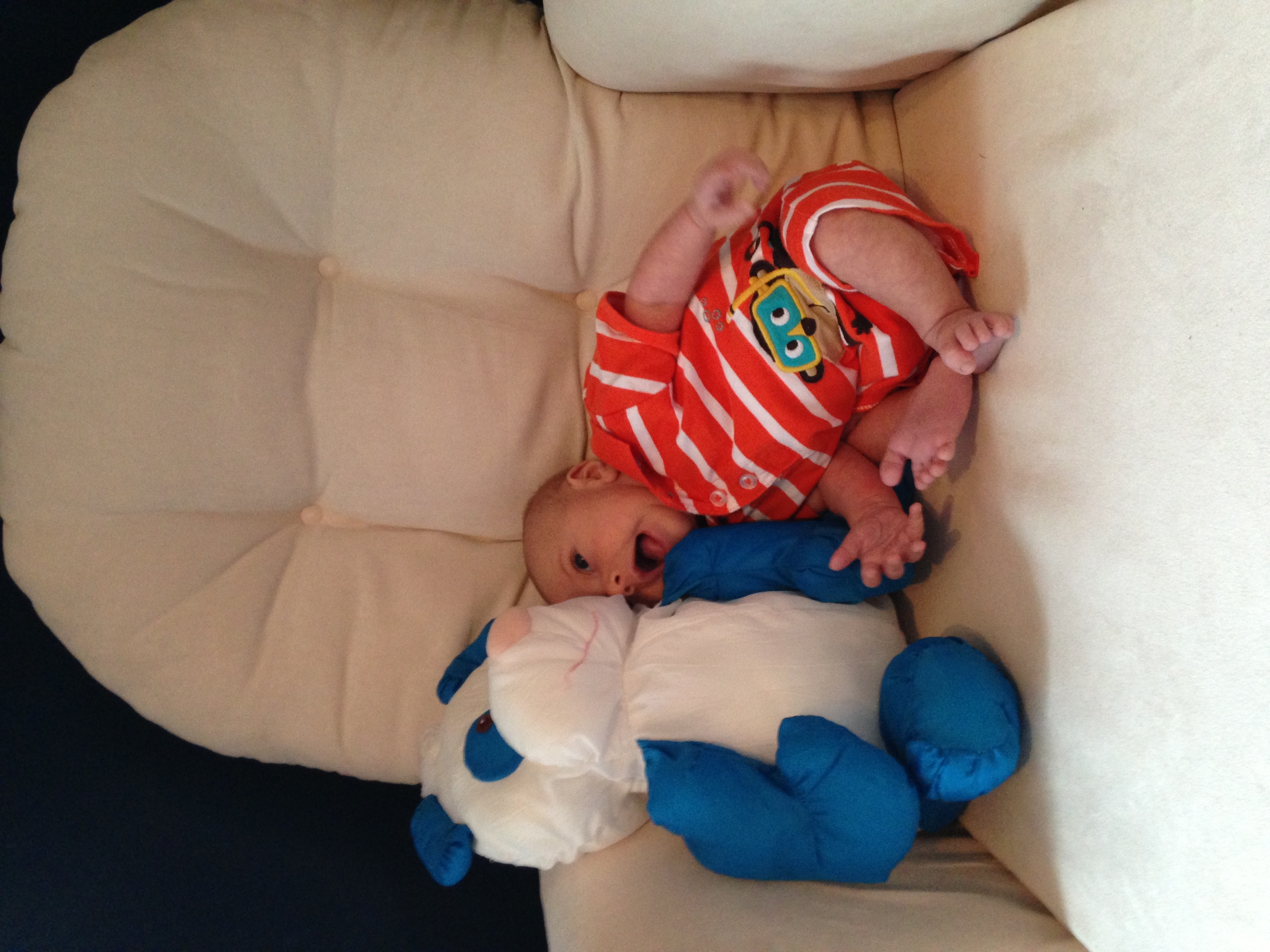 I finally took some pics. They were adorable but for some reason the card reader isn't working on my computer and I can't find the cord. Lame. But since he still had his sticker on I took a quick one while sleeping. Do you see how chubby this kid is?!