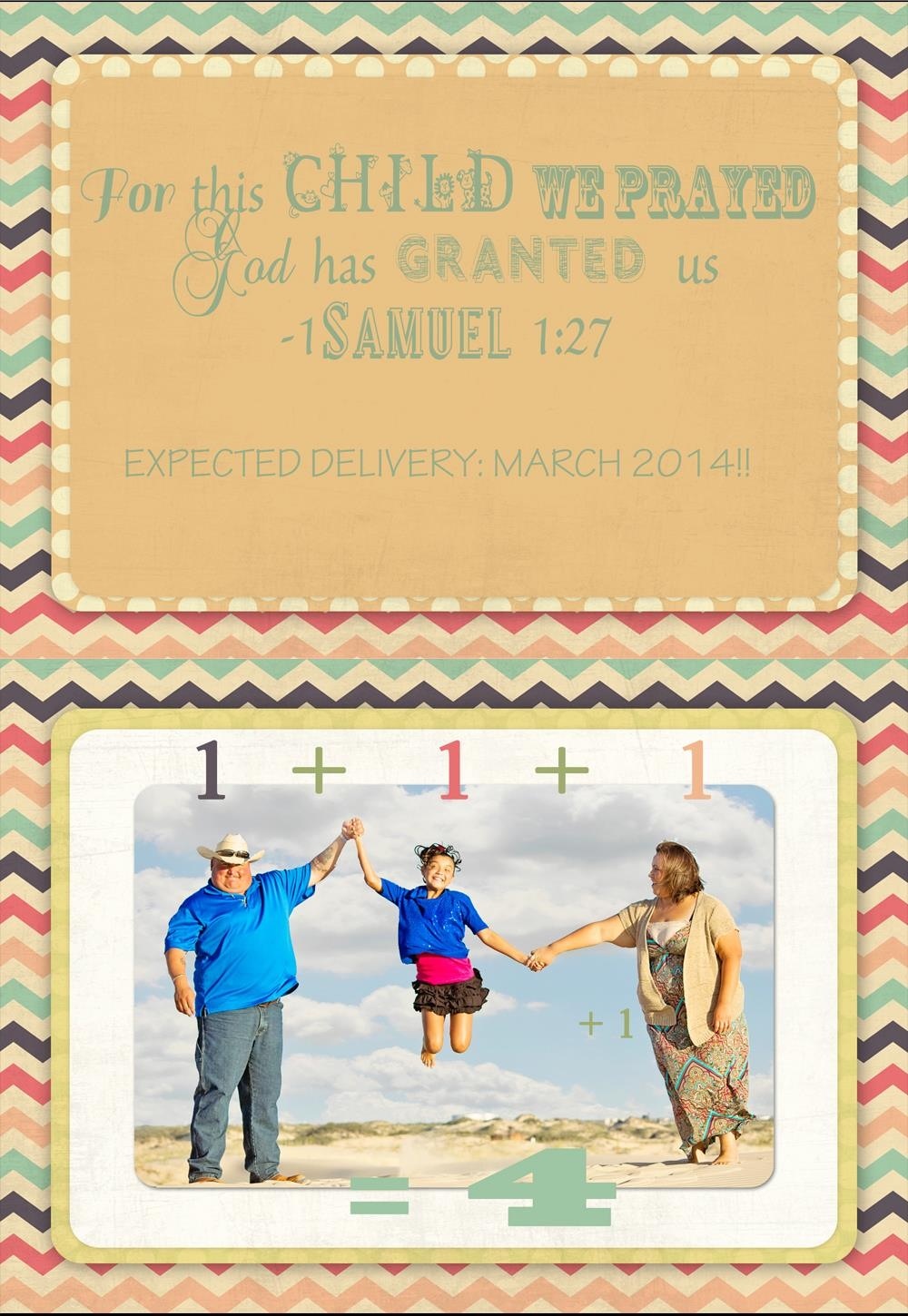 I am currently 11 1/2 weeks along. This is our 2nd pregnancy. Our first was in 2011 after a successful fertility treatment but we found out was ectopic at 6 weeks. I found out I was pregnant at the beginning of August which was exactly one year since my mom passed away! We had tried other fertility treatments and had no luck and we decided to take a break and here we are now! I had my first ob appointment today and we could not hear the heartbeat but it did register at 150! I will go for an ultrasound on the 10th. So we do have a baby hopefully growing fast and healthy! We are super nervous and super excited! This is our moment I just feel it!! My stepdaughter has already filled her room with welcome signs for the baby and even though she wants a sister she has also been making some for a brother just in case! Here are the 2 FB announcements we used. I used one and my husband the other