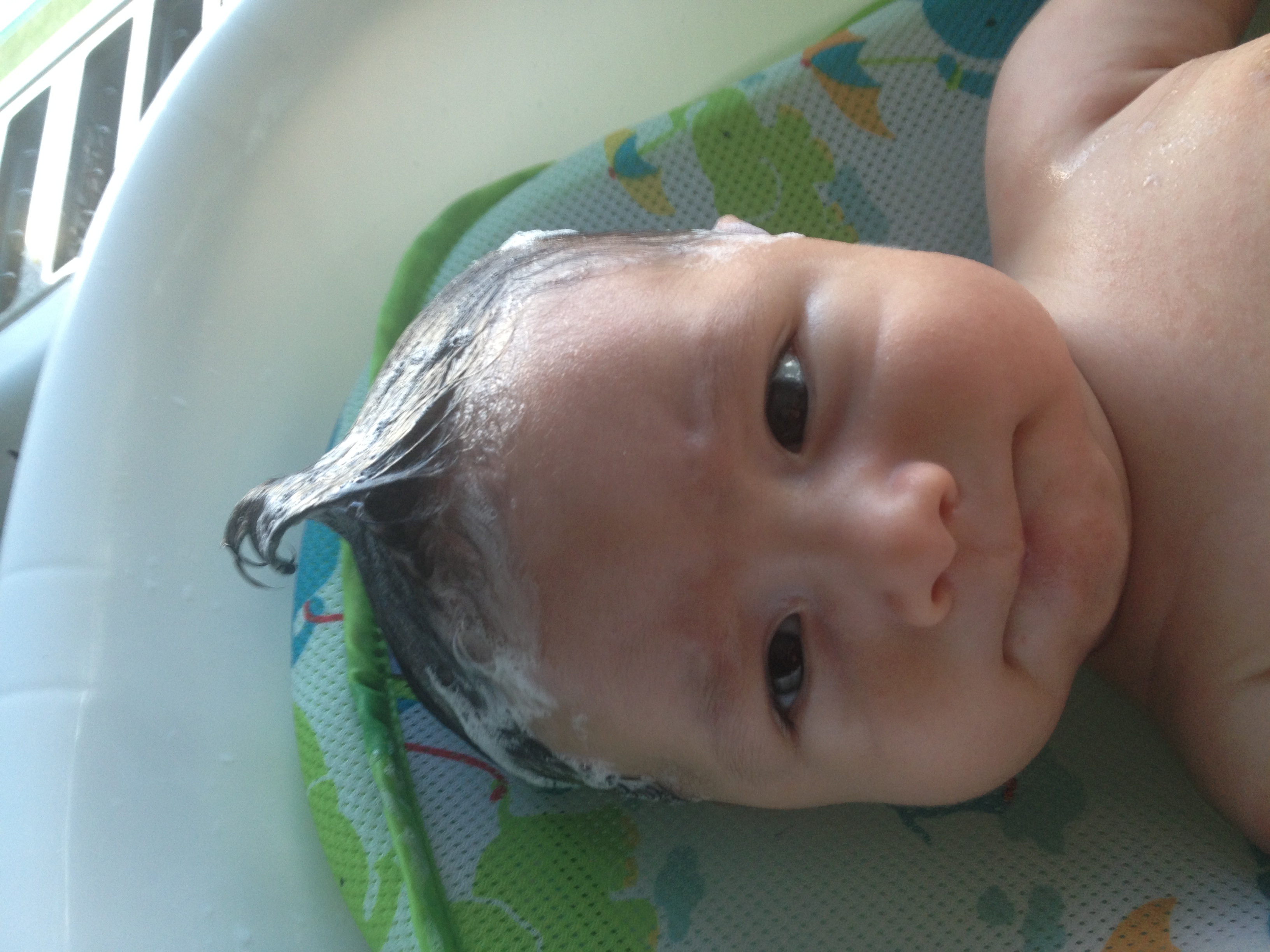 Javi just started making this face yesterday and apparently it is now his favorite face! Hilarious!! I call it "the incredible disappearing bottom lip" lol (also, yes I make him soapy Mohawks)