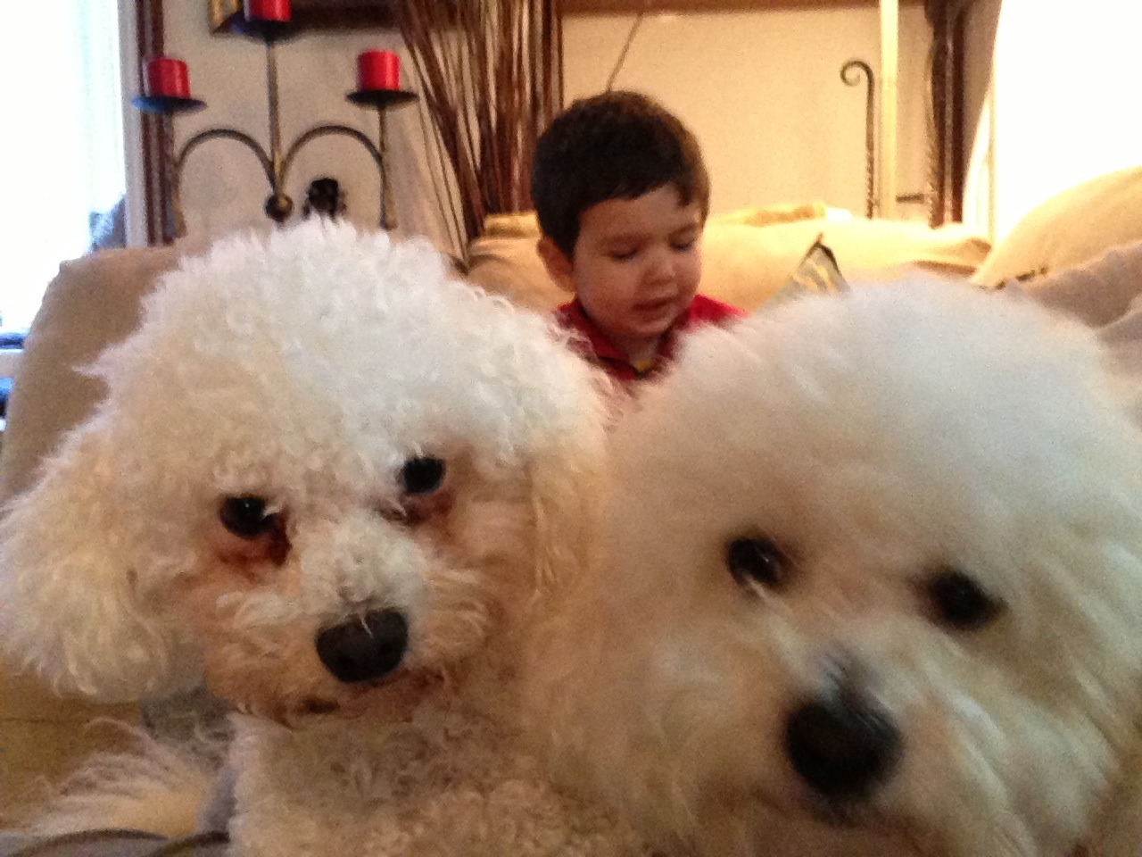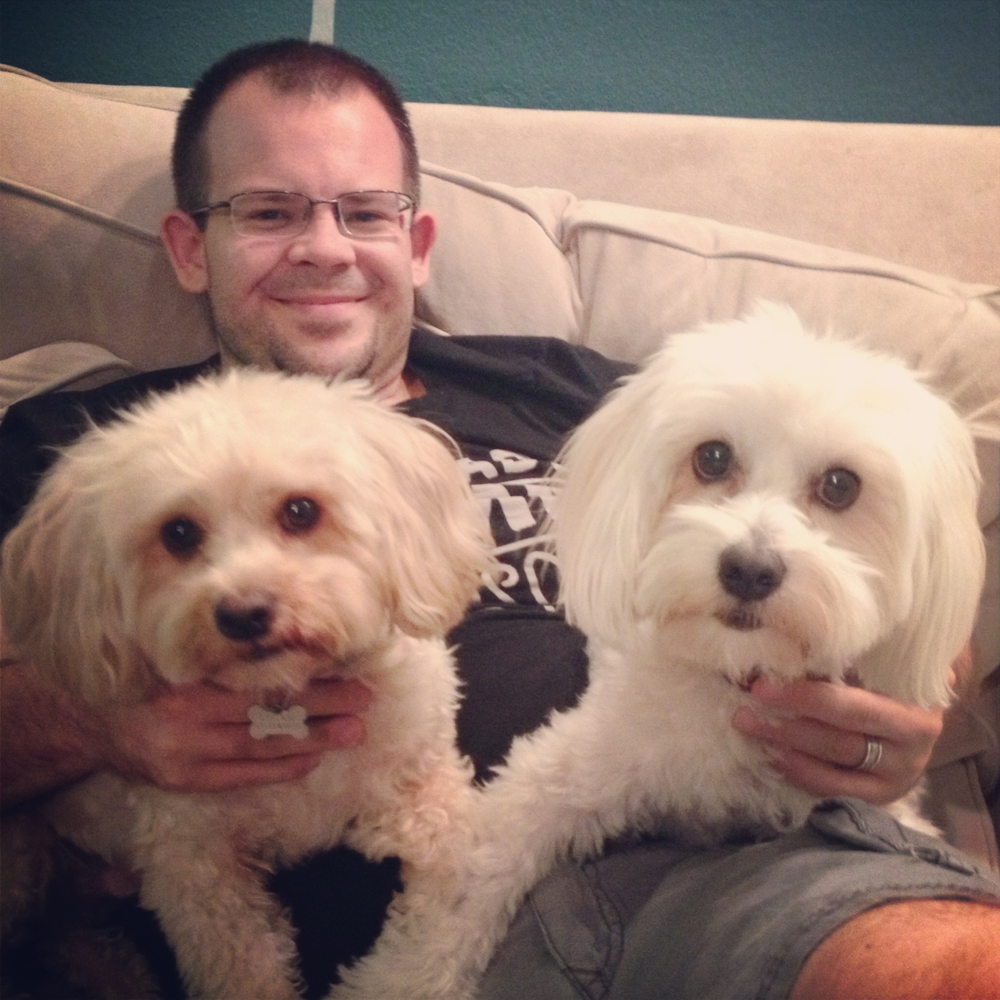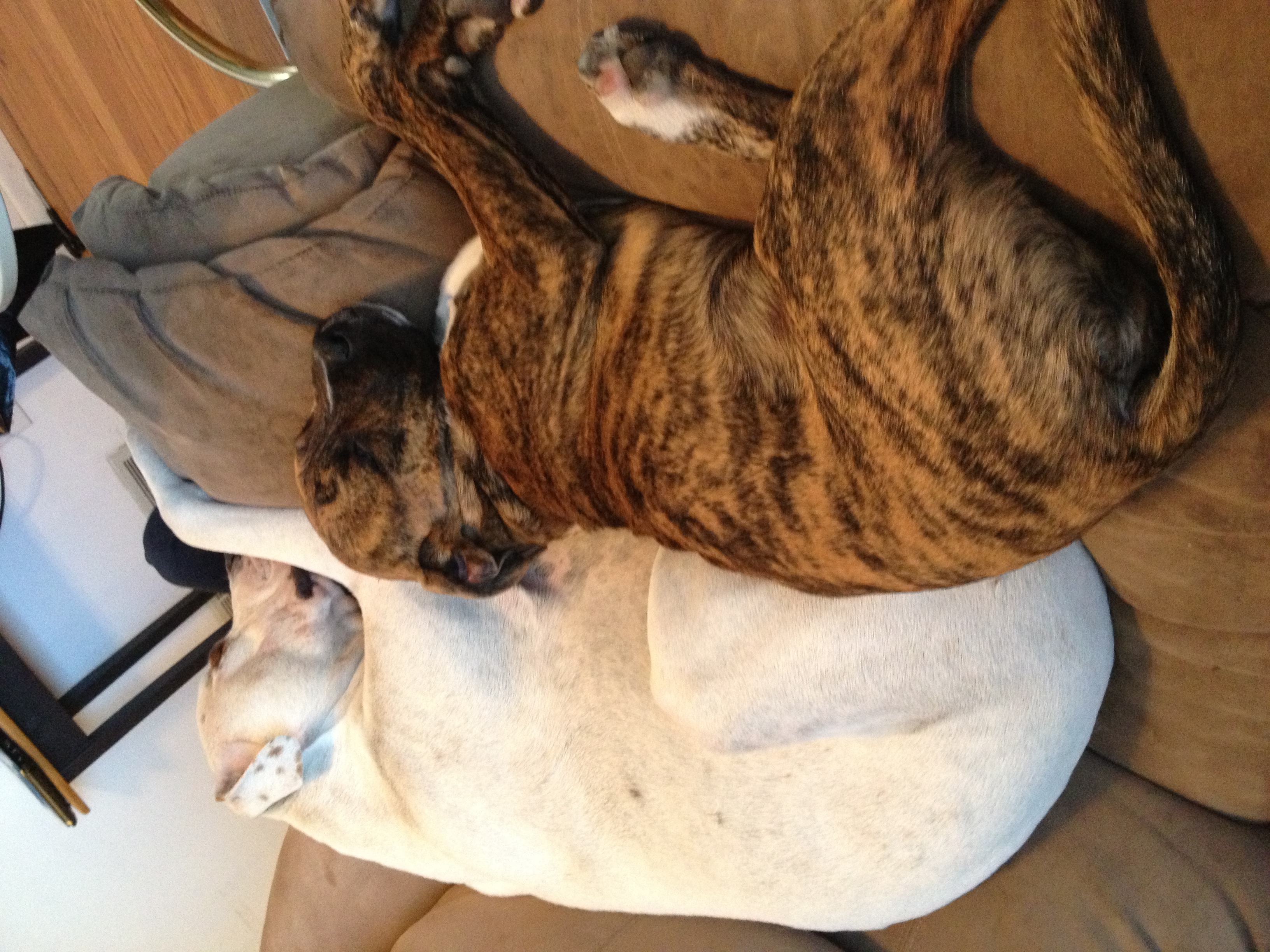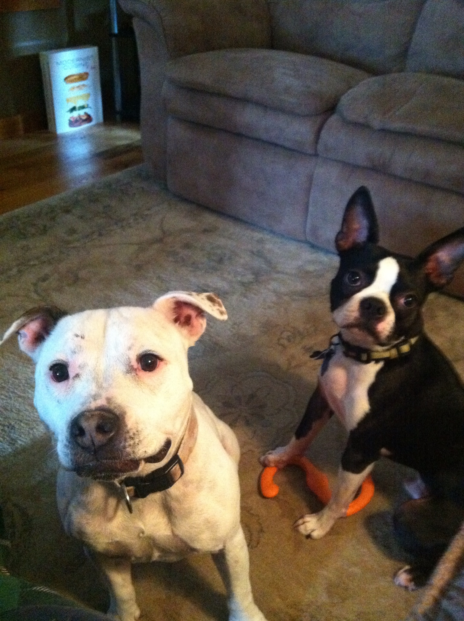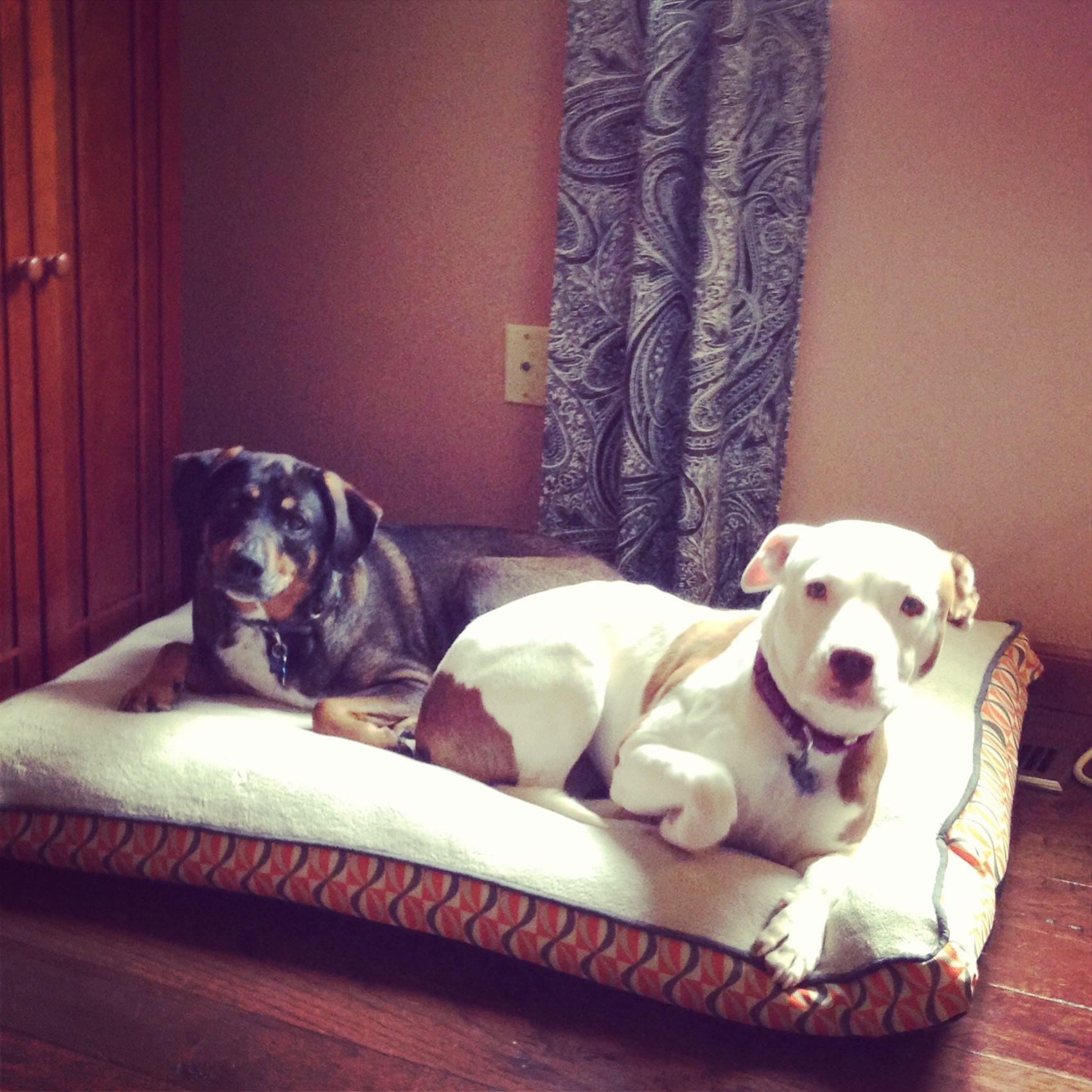 The white one is Martigan. He's three and a half, and we got him two years ago in November. He was our baby after we lost an 8-week rescue puppy to parvo. He's not usually a cuddler, but since I got pregnant, he sure is now. He also gets upset when I cry and tries to lick my tears. He's my comfort dog.