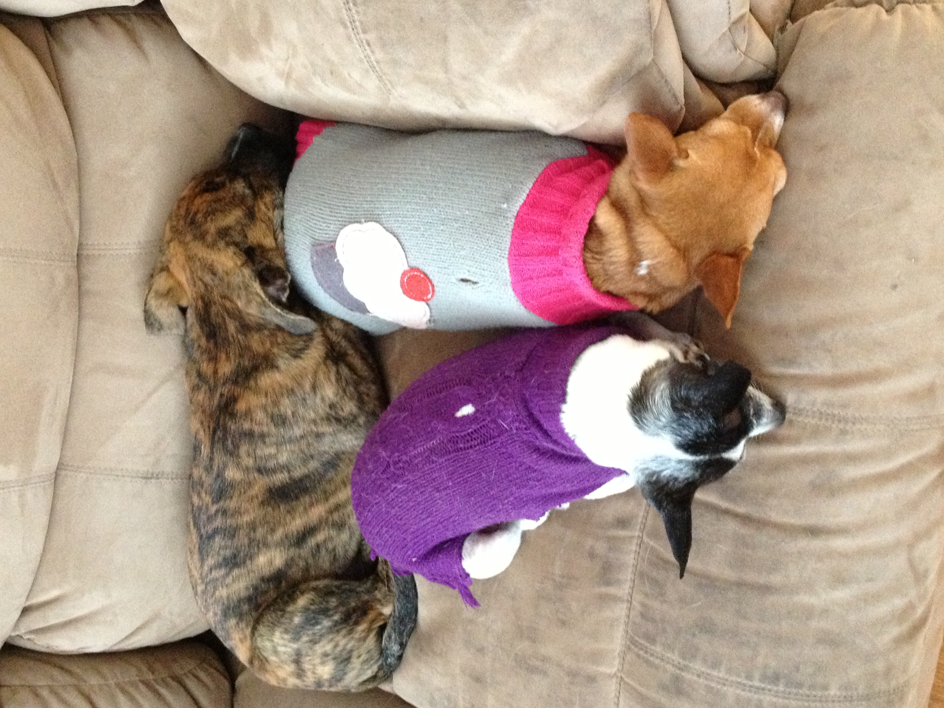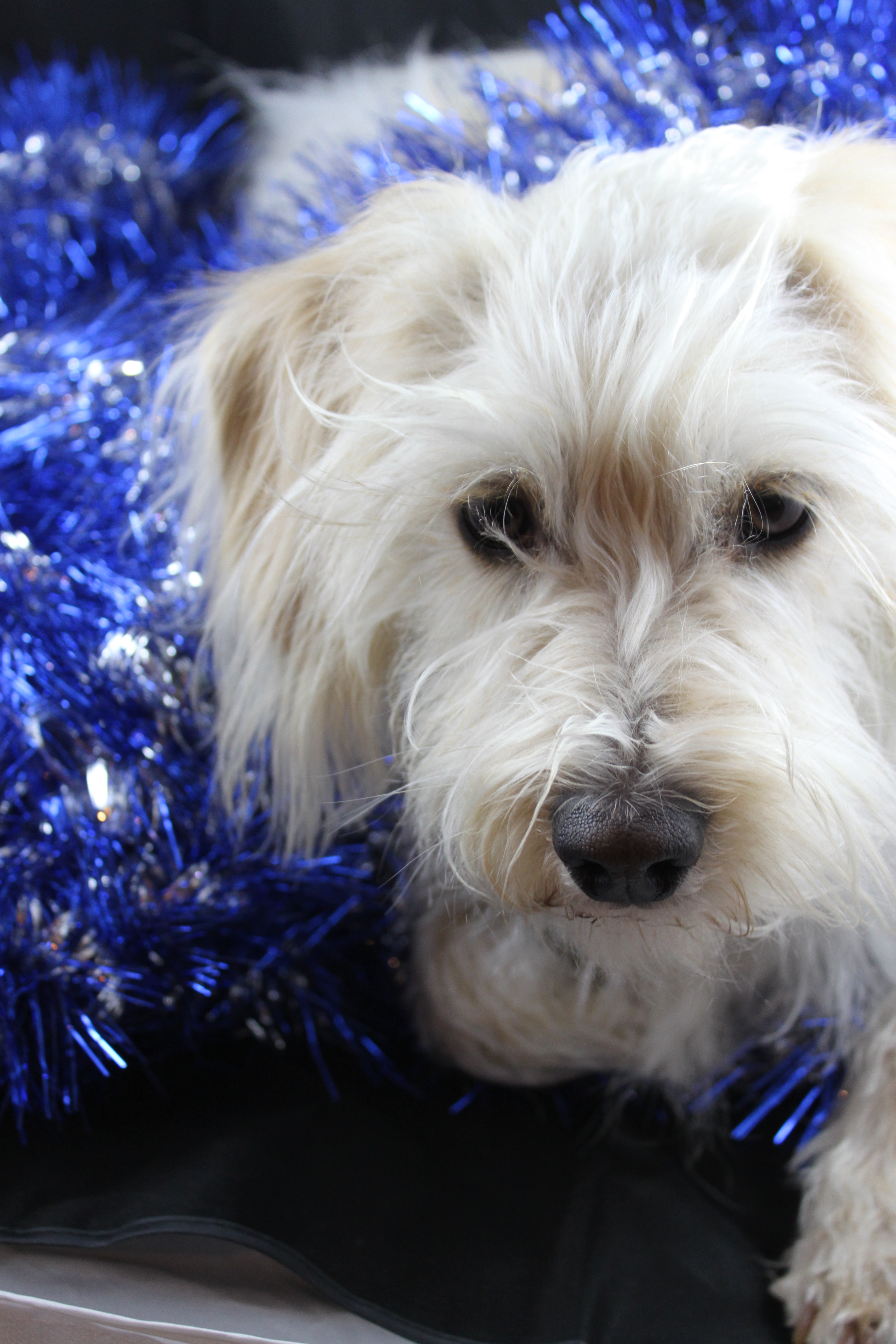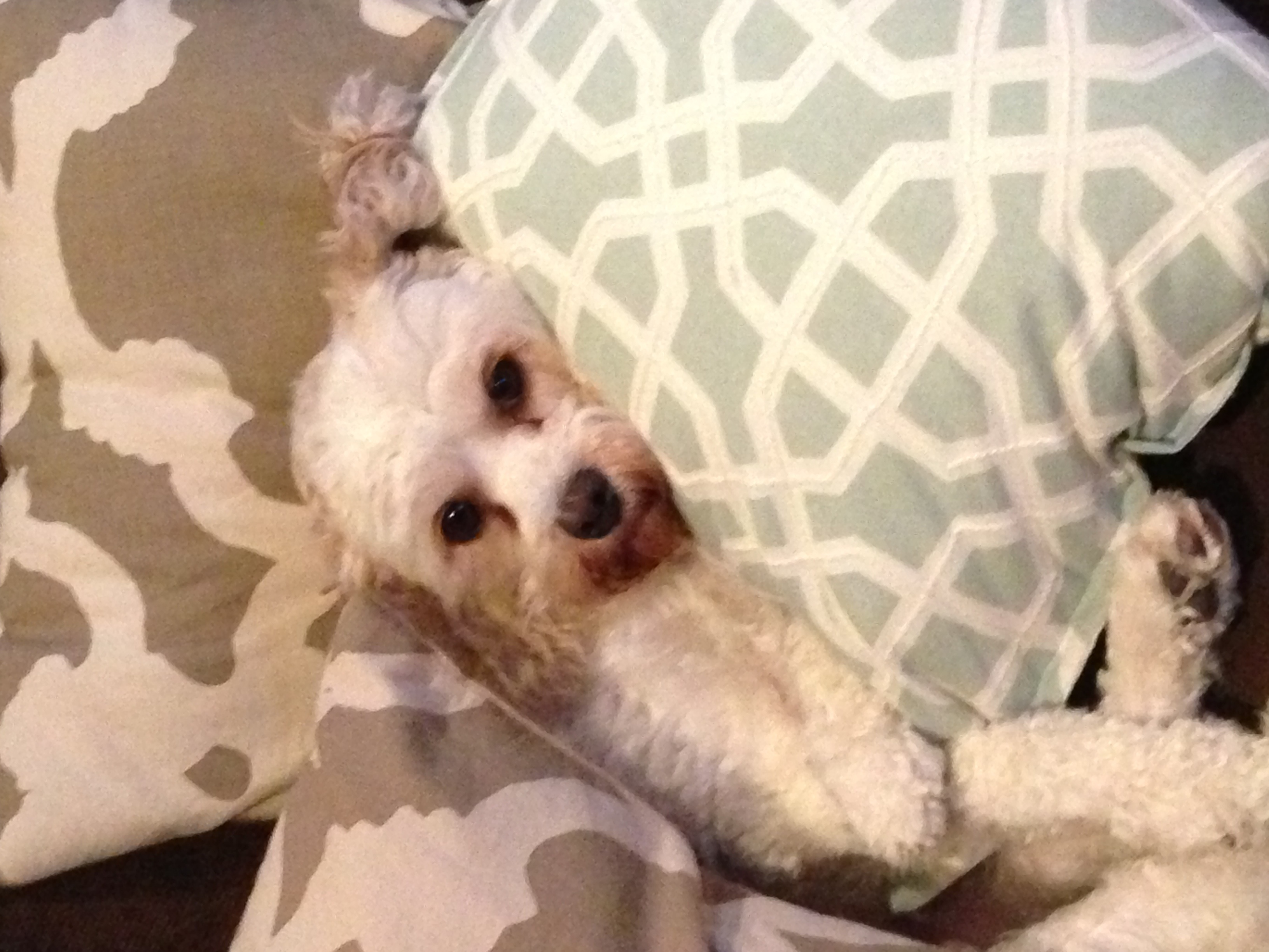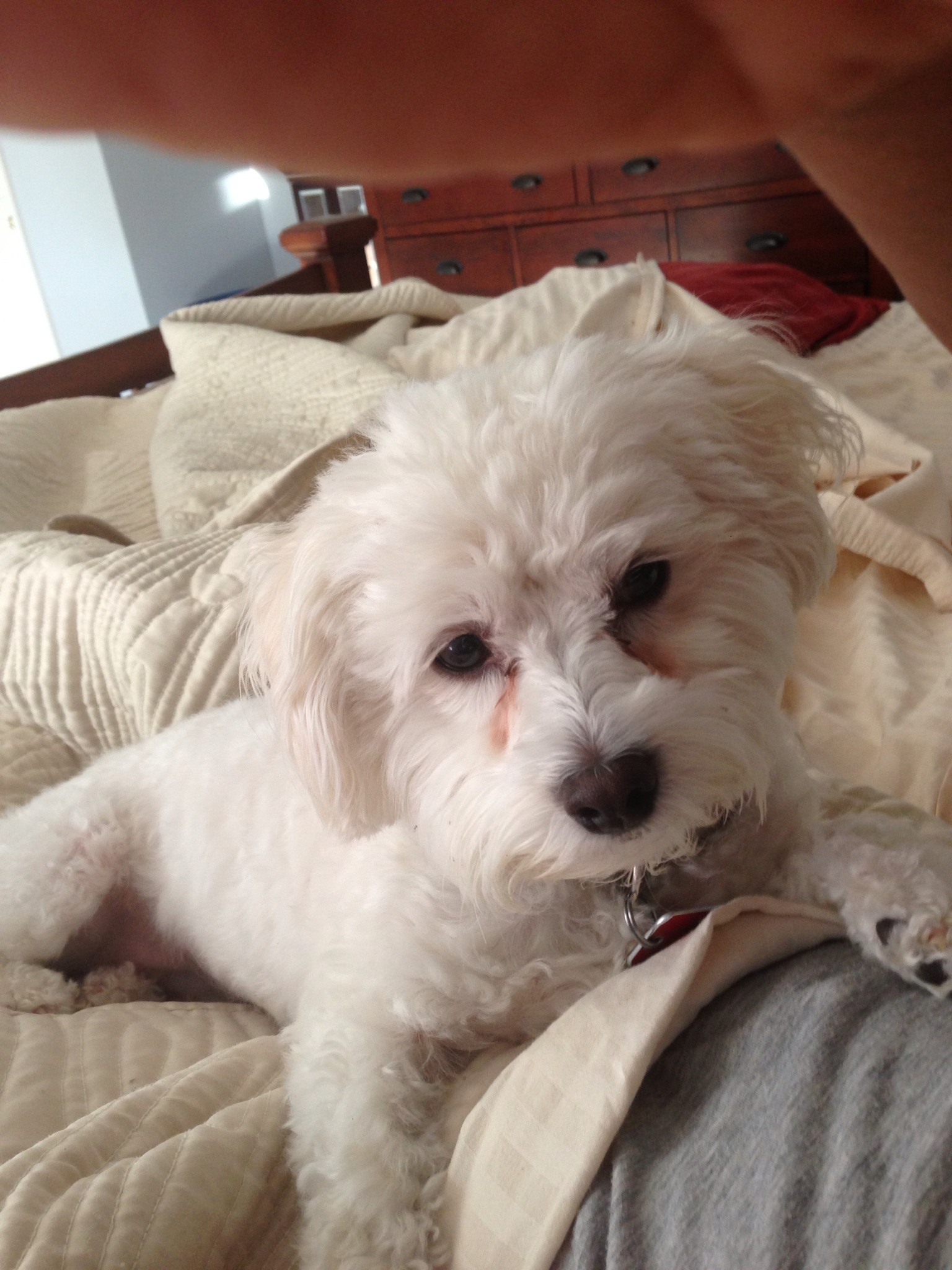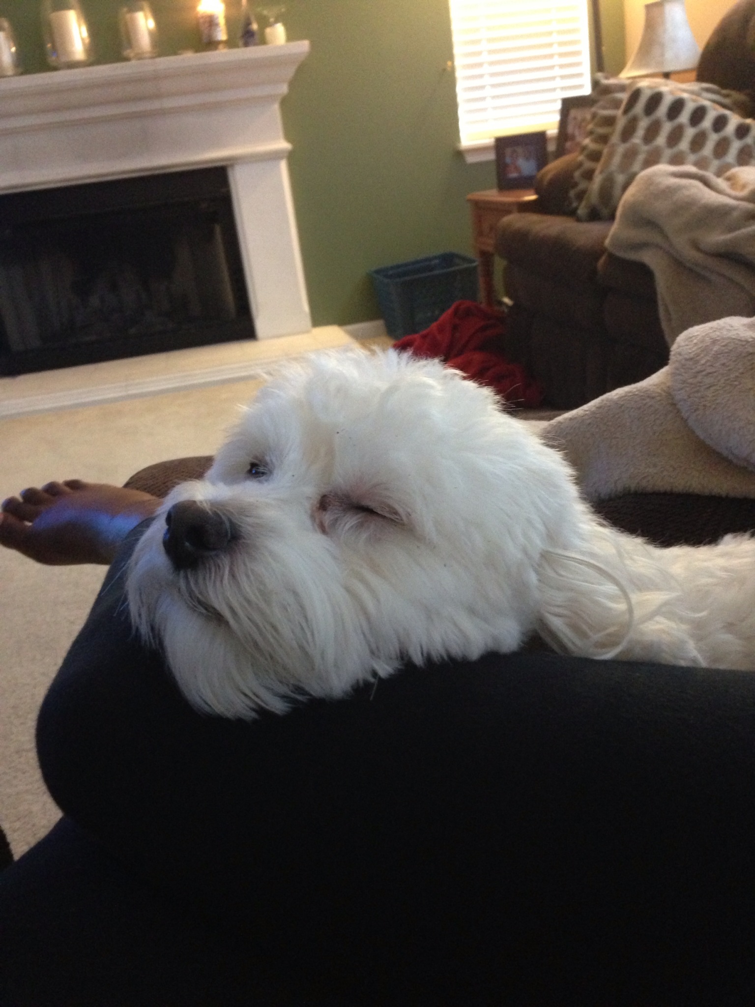 The white one is Martigan. He's three and a half, and we got him two years ago in November. He was our baby after we lost an 8-week rescue puppy to parvo. He's not usually a cuddler, but since I got pregnant, he sure is now. He also gets upset when I cry and tries to lick my tears. He's my comfort dog.