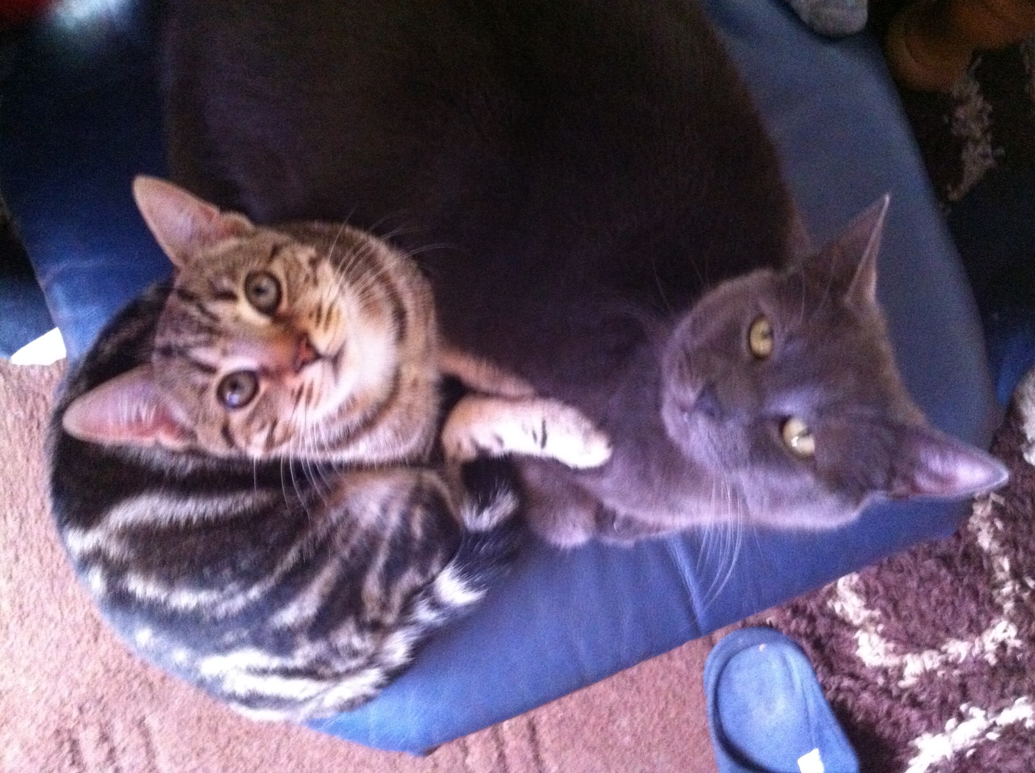 The big black mass of fur is named Teddy-Bungle, the dogs are Mylo and Mika and the grey kitty is Pushkins and the tabby is Pudsey