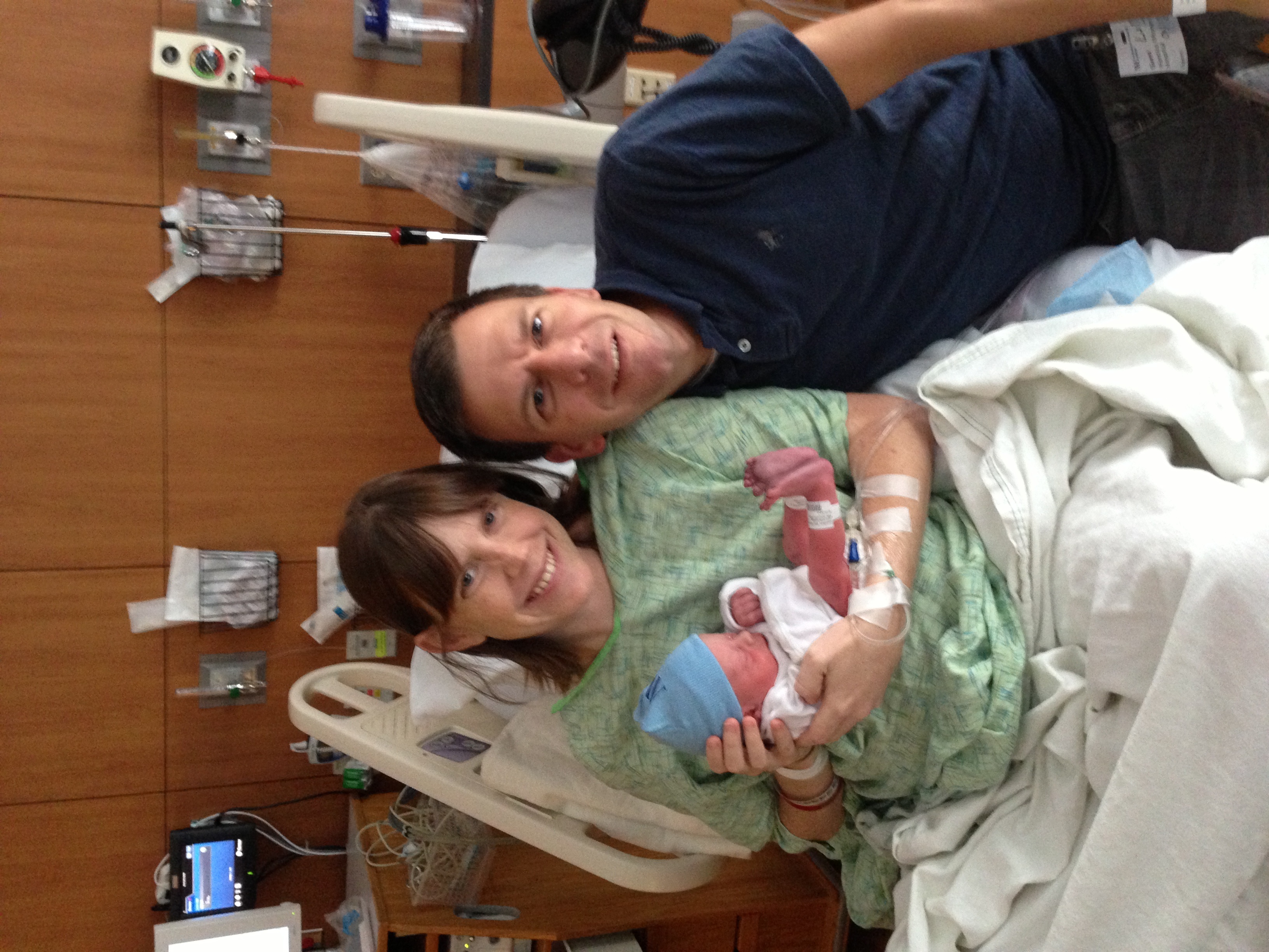 Long version: It's really not that long! My water broke at home around 3am. Not a huge gush - just constant trickles. Called my OB andy BFF to come stay with DD and headed to the hospital. We got checked into a triage room around 4:30 where they confirmed it was indeed my water that broke, so we were moved up to a L&D room around 7:00am. I got hooked up to the IV and started receiving pitocin around 7:30am. My OB checked and I was about 3 cm dilated. I started feeling some painful contractions around 8:30am, so I asked for the epidural and got that around 9:00am. At about 9:45, my OB checked again and I was completely dilated! They called to have a pediatrician come (standard practice for preemies) and I was told I could start pushing. After one push I was told to stop. Baby was right there ready to come out and no pediatrician yet. As soon as that doc was in the room, I pushed again and Samuel Eliot was born at 10:07am! 5 lbs, 9 oz, 19 inches. It was crazy how fast he was born! No NICU time has been needed. My milk hasn't come in yet, so we are obviously supplementing with formula, but for the most part he latches well, so hoping BF'ing will go well.
