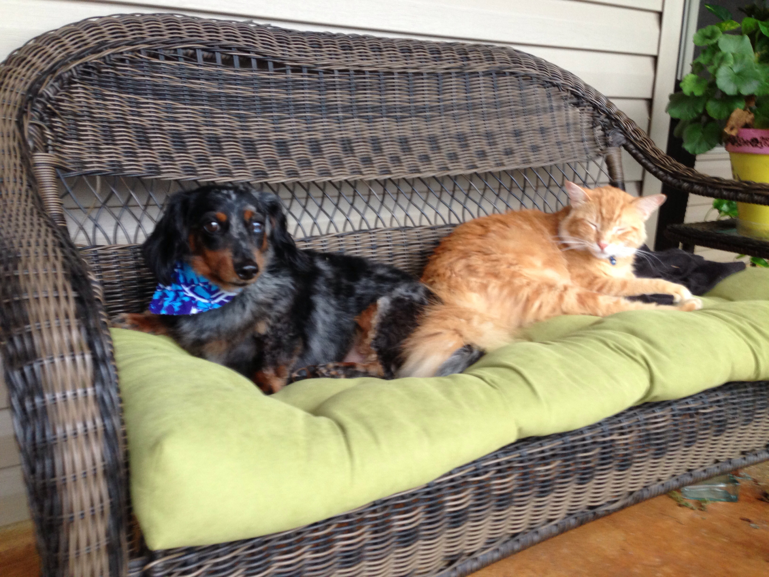 One is a pic from last year during a hurricane .... I call it the wind blown look. The other is a rare occasion that our dog and cat actually getting along.