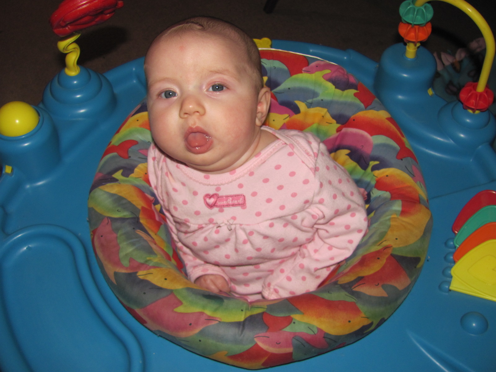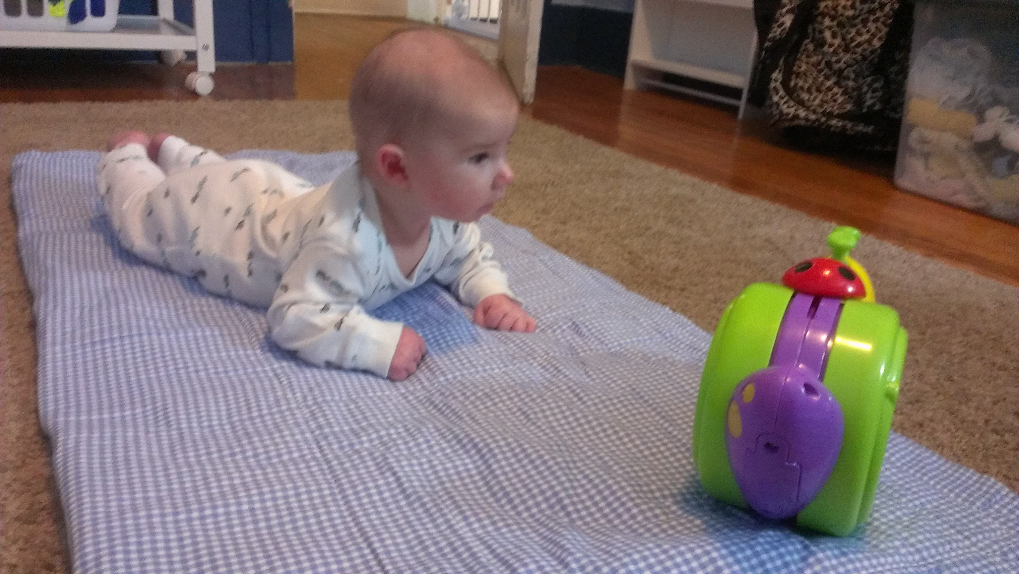 Heres Zoe doing some tummy time and trying out the exersaucer!