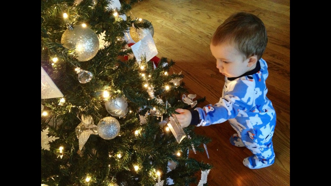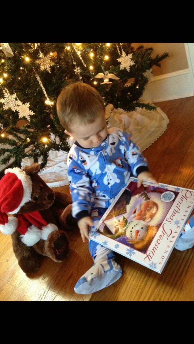 My son doesn't like to hold still but he loves looking at books so last year (he was about 14 mo) I took pics of him in his pjs under the tree looking at Christmas books and him looking st the tree