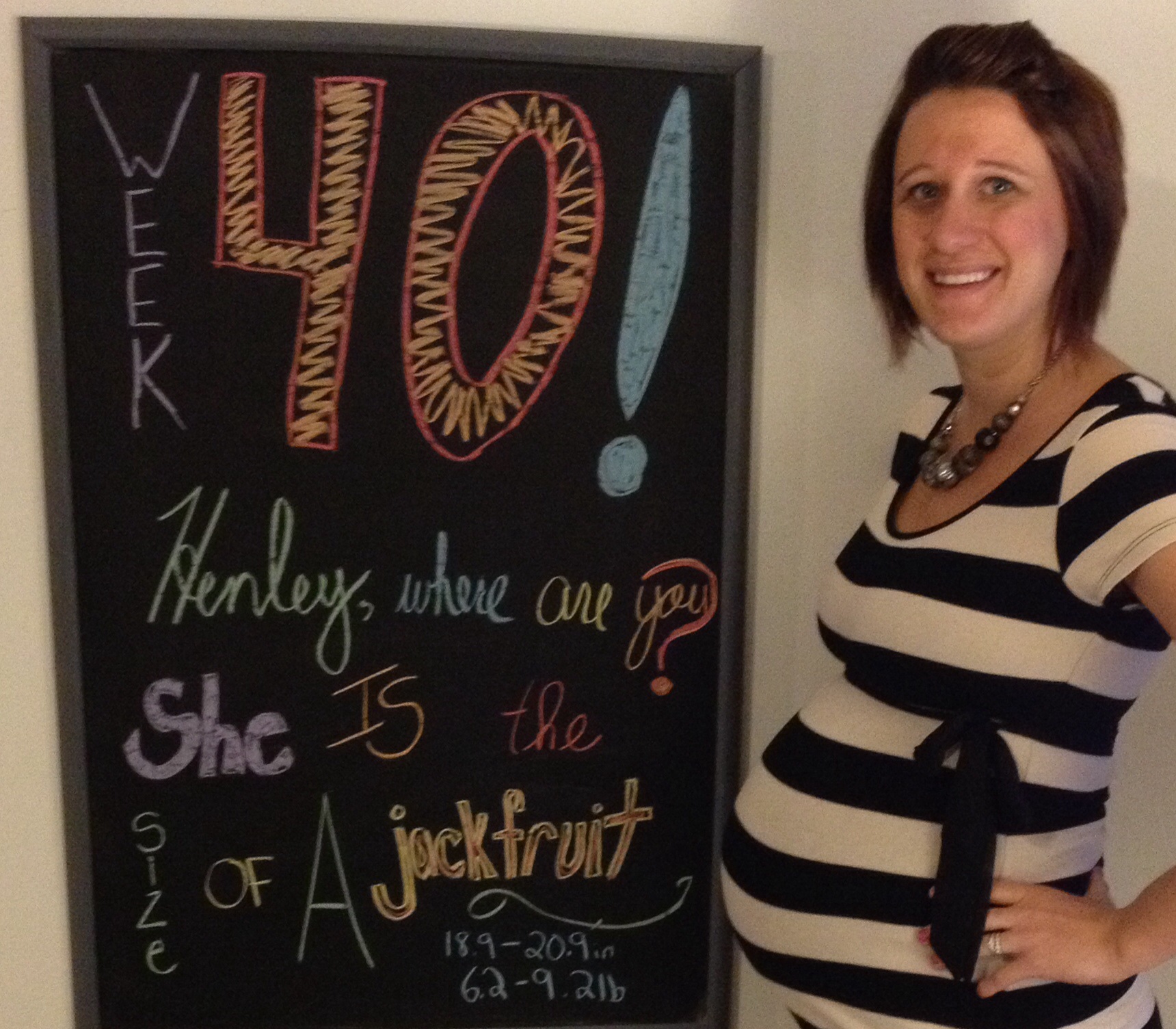 Yesterday at 40 weeks. I am officially 1 day overdue but maybe not for long, I woke up this morning leaking not sure if it's urine or my water so I'm gonna see if anymore comes out before I go in