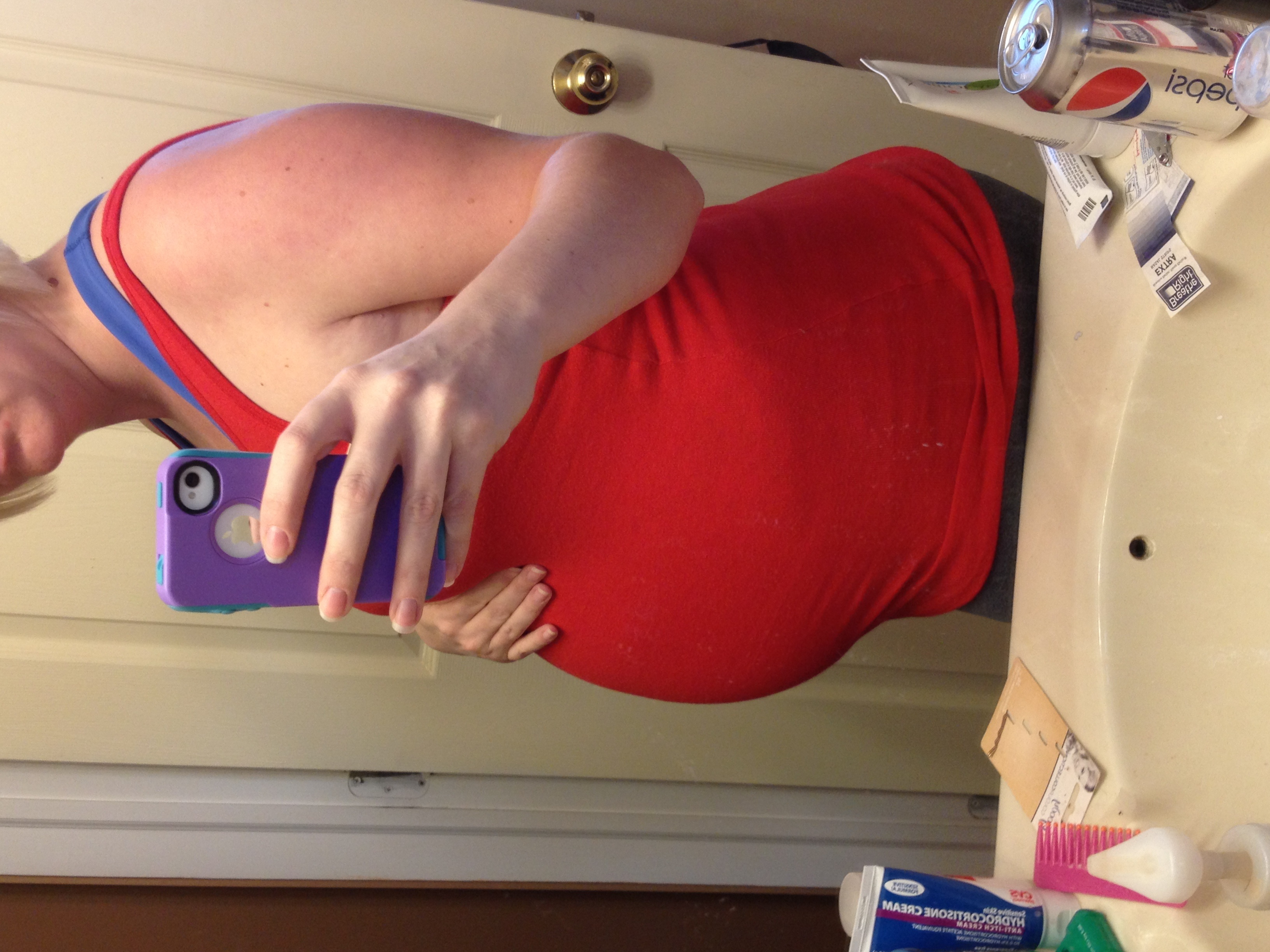 24 weeks here, looking like a red blob after a long night at work! Taking some Benadryl and hitting the sack