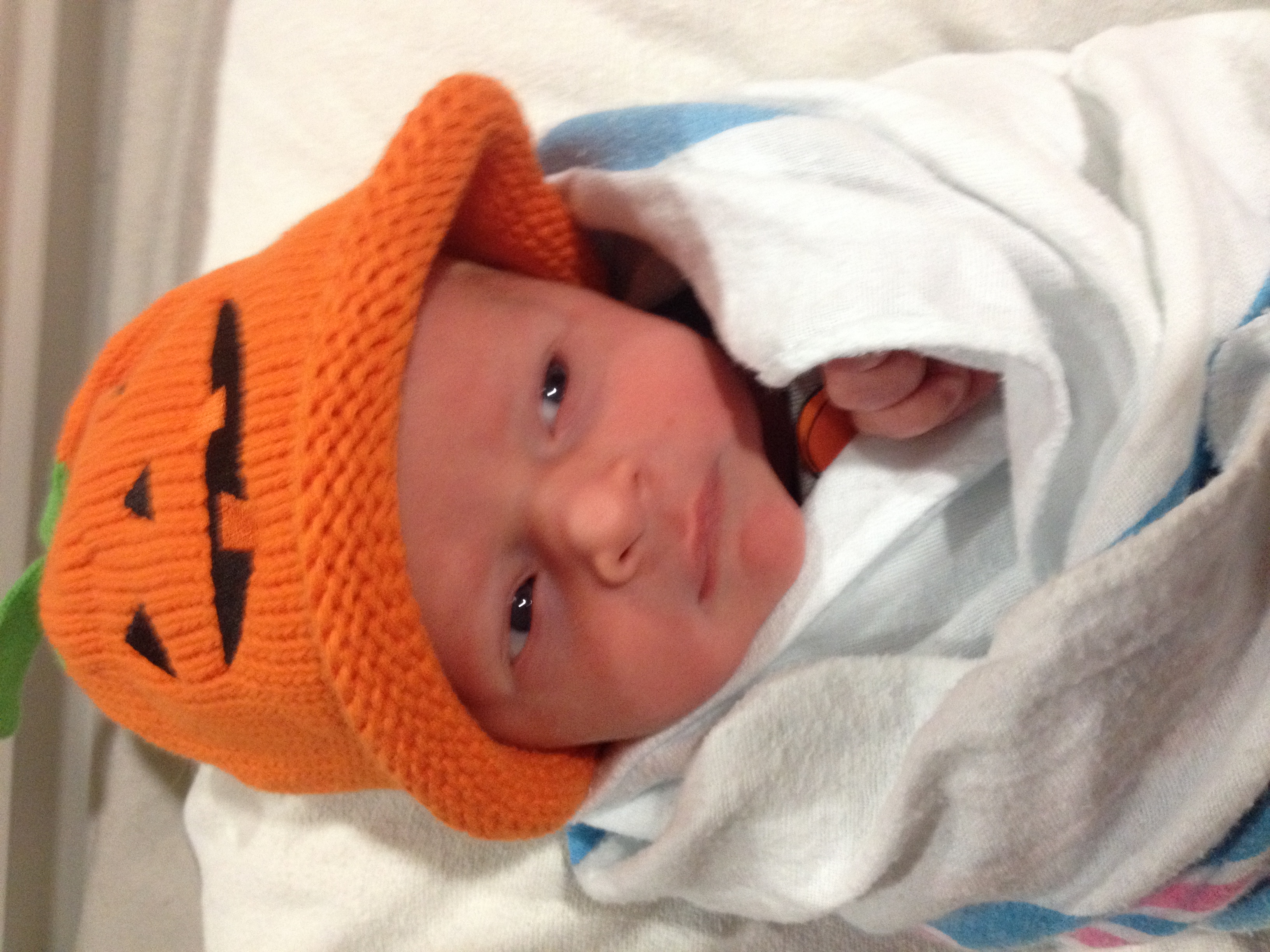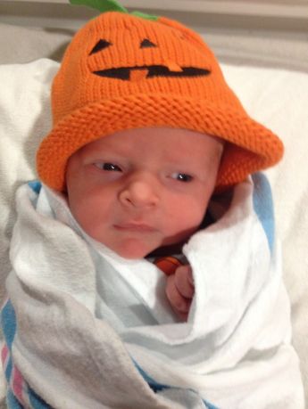 Declan James was born on Halloween at 3:43am at 38w3d.  I had been having contractions on and off for weeks.  On 10/29 I was having contractions 10 min apart for two hours and then they faded.  Then on 10/30 I had my 38w appointment, I was 100% effaced, 3-4cm dilated and considered "favorable".  I went to DS1's school fall festival immediately after my appt and began to have contractions again.  We started timing the contractions at 6pm, by 8:30pm they were 5 minutes apart.  We waited for my ILs to show up to watch DS1 before heading to L&D.  My doctor decided to break my water at 1am, my epidural was in and and working by 1:45am and he was born two hours later after about 7 pushes.  We are so in love with our special Halloween treat!!