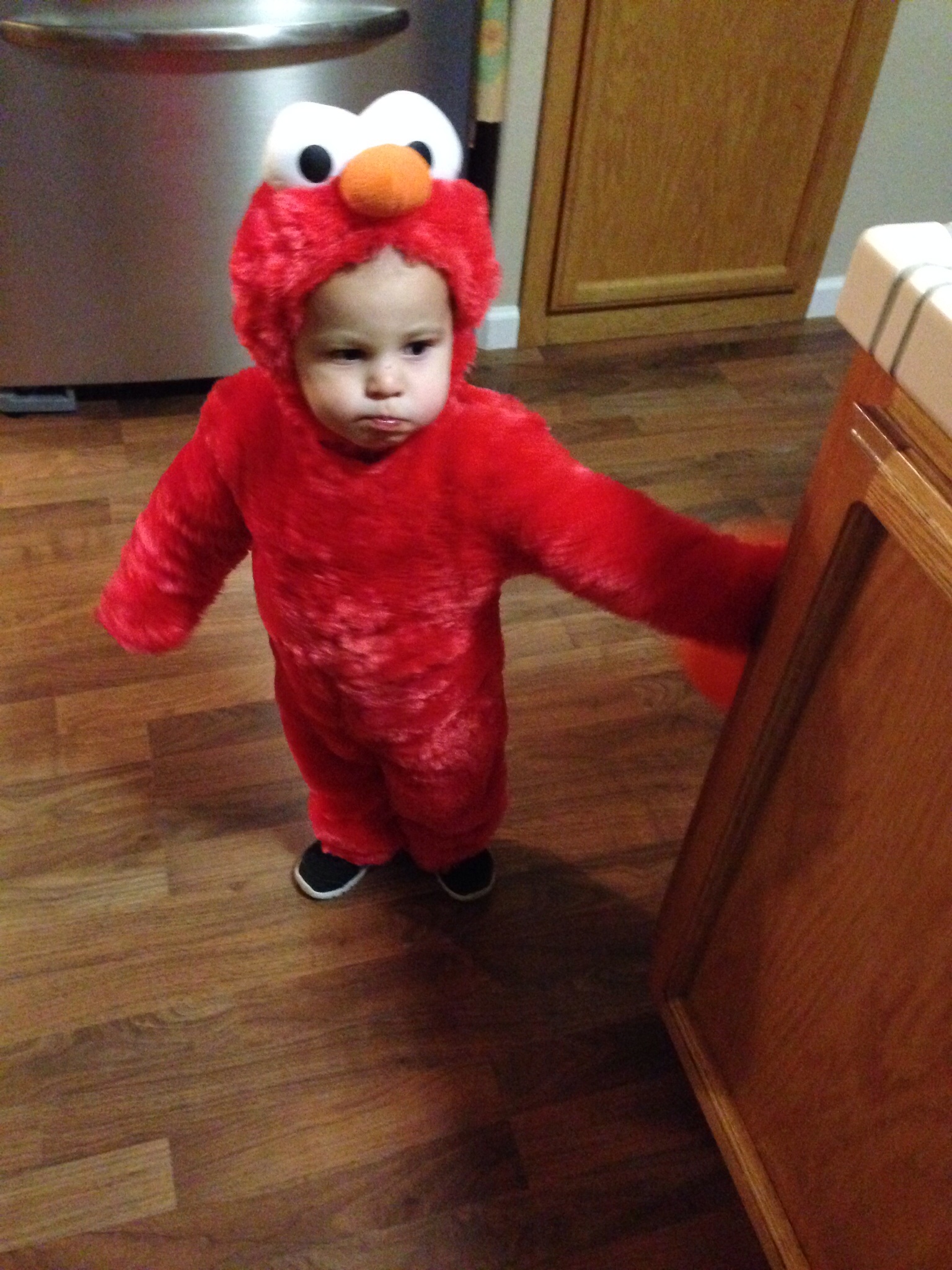 Another Elmo here! He actually wore the hat the whole night, I was surprised, but he actually loved it! He got into trick or treating too, and had a great time playing with his candy and jack-o-lantern: