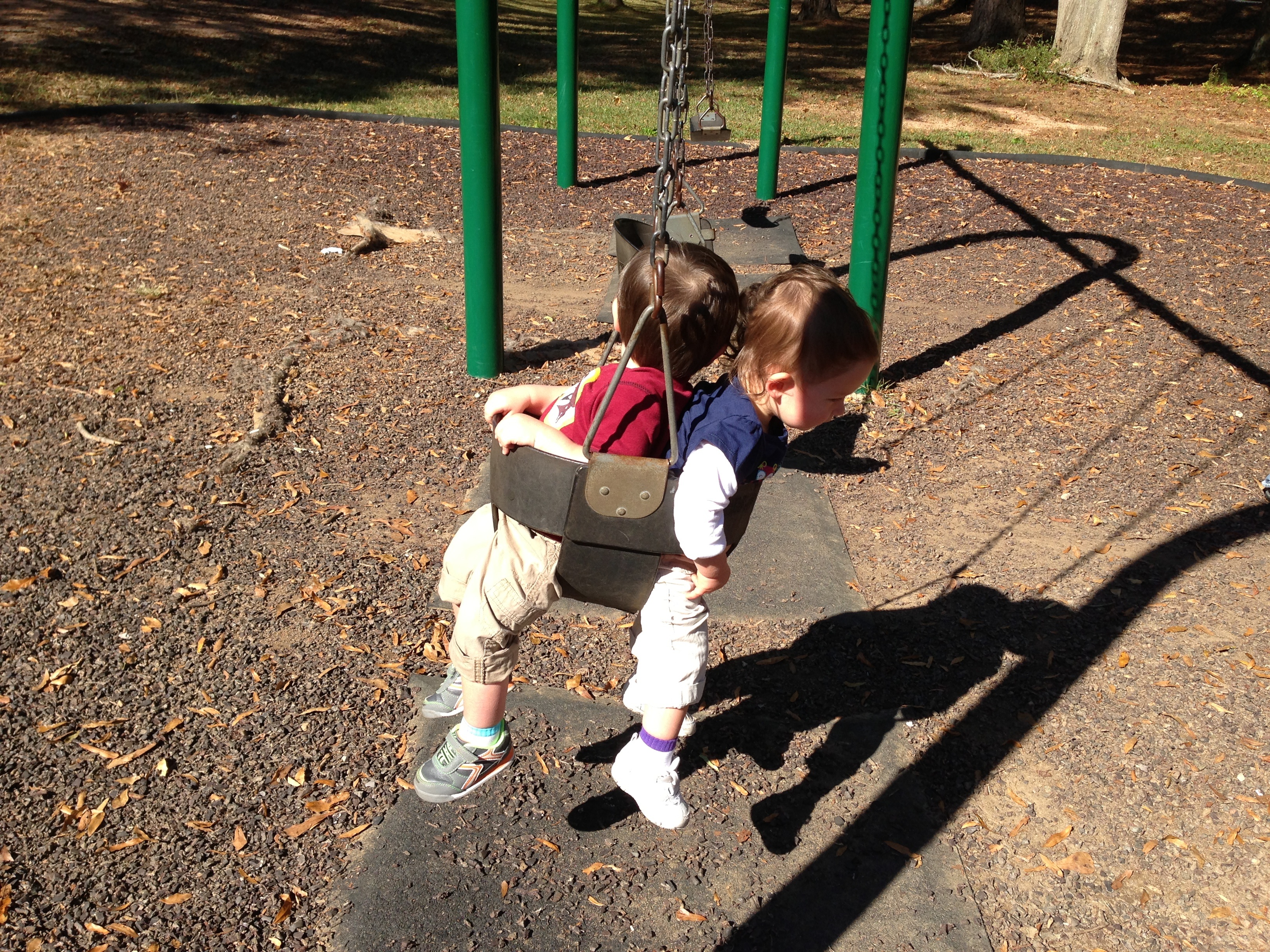 And here are my babies, sharing a swing at the park this weekend. ;-)