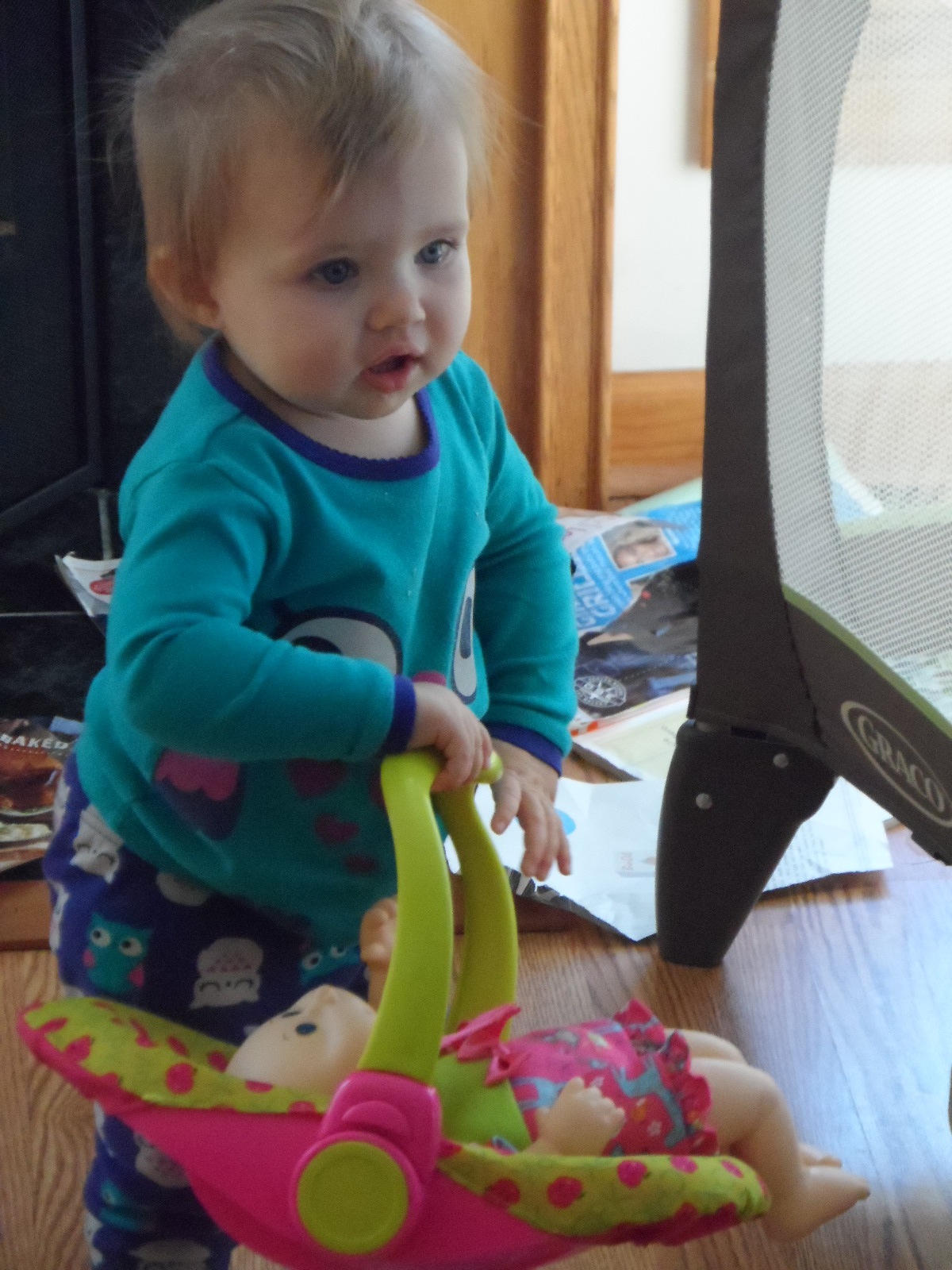 HA we have the same pack n play.. well ours is packed up now she never really liked it. I was wondering when to introduce dolls... I don't have any right now.. hmm maybe for christmas