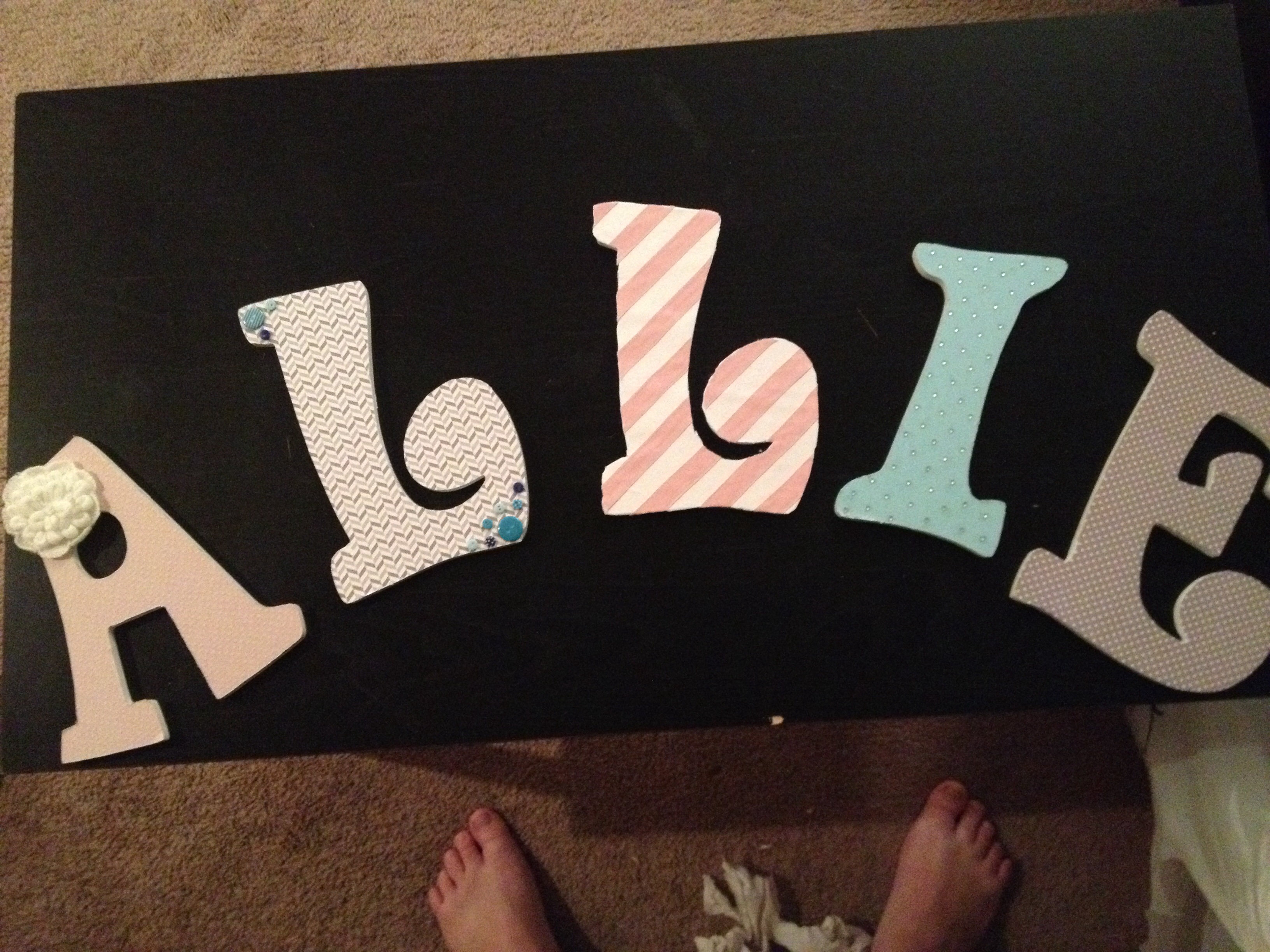 I attached the letters I made to show the colors we are using @pixieonboard! (Light pink, blue, white and grey!) And another with a grey letter against it that hopefully shows the wall color better.