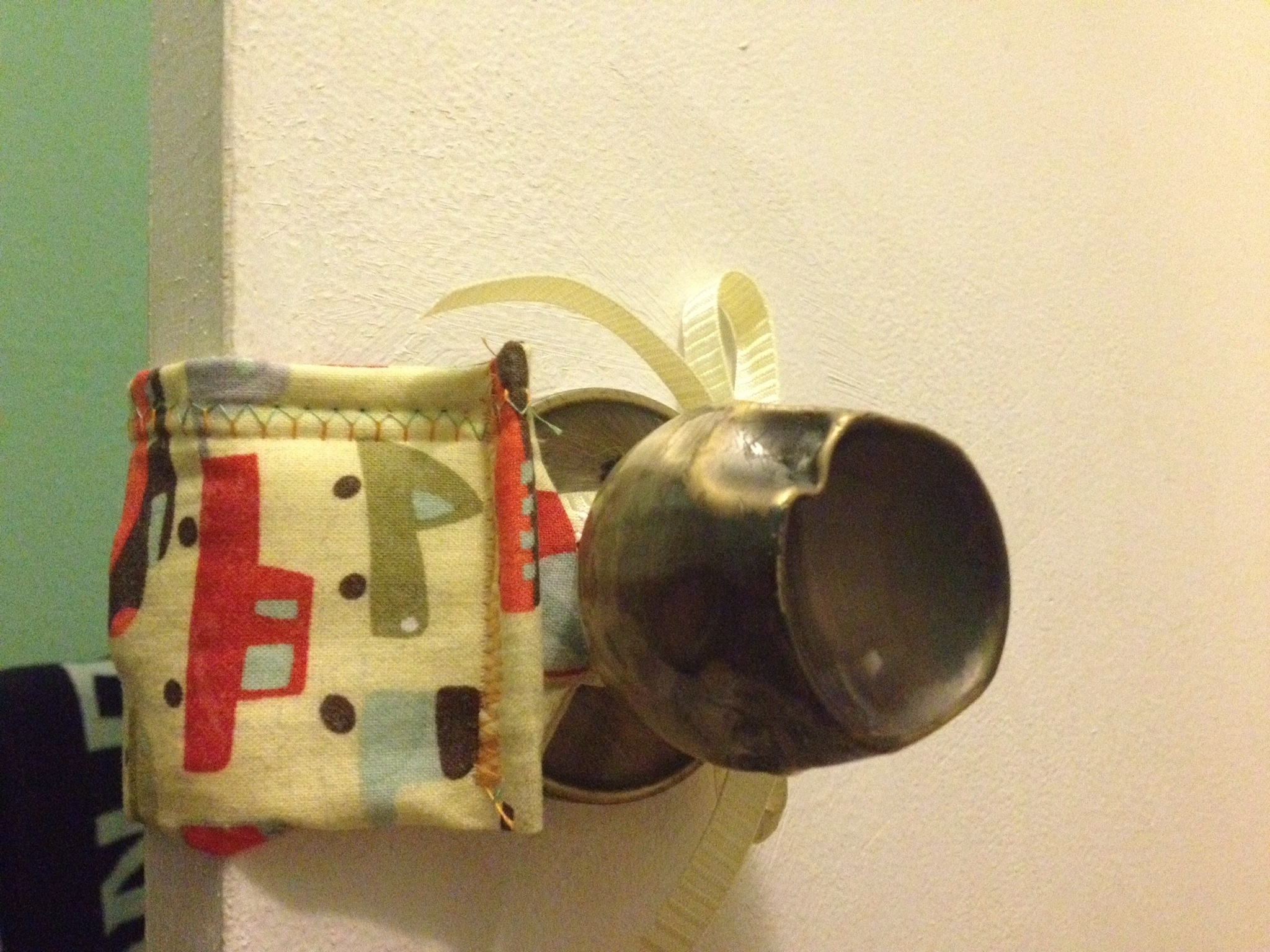 Here's a car seat arm protector - it wraps around the top handle. (I didn't want to get the seat out of storage to model it - hopefully it fits!) And one of those door jam thingamaboppers so the nursery door can be opened quietly (Don't mind the busted door knob; our dog was a chewer!)