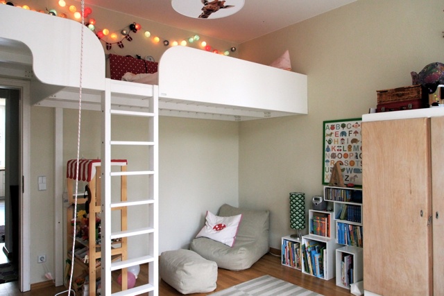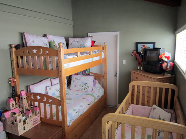 I posted this pic in my intro but I'll add it again here, just so anyone who is nervous about space will know how 3 kids in one small room can work! I'm hoping to figure out how to fit 4. I'm thinking maybe loft over crib. Another friend of mine sent me the attached photo of a cool bunk bed set up. We'd have to get a carpenter to make it happen though. And, it would totally block that back door which I don't want to do.