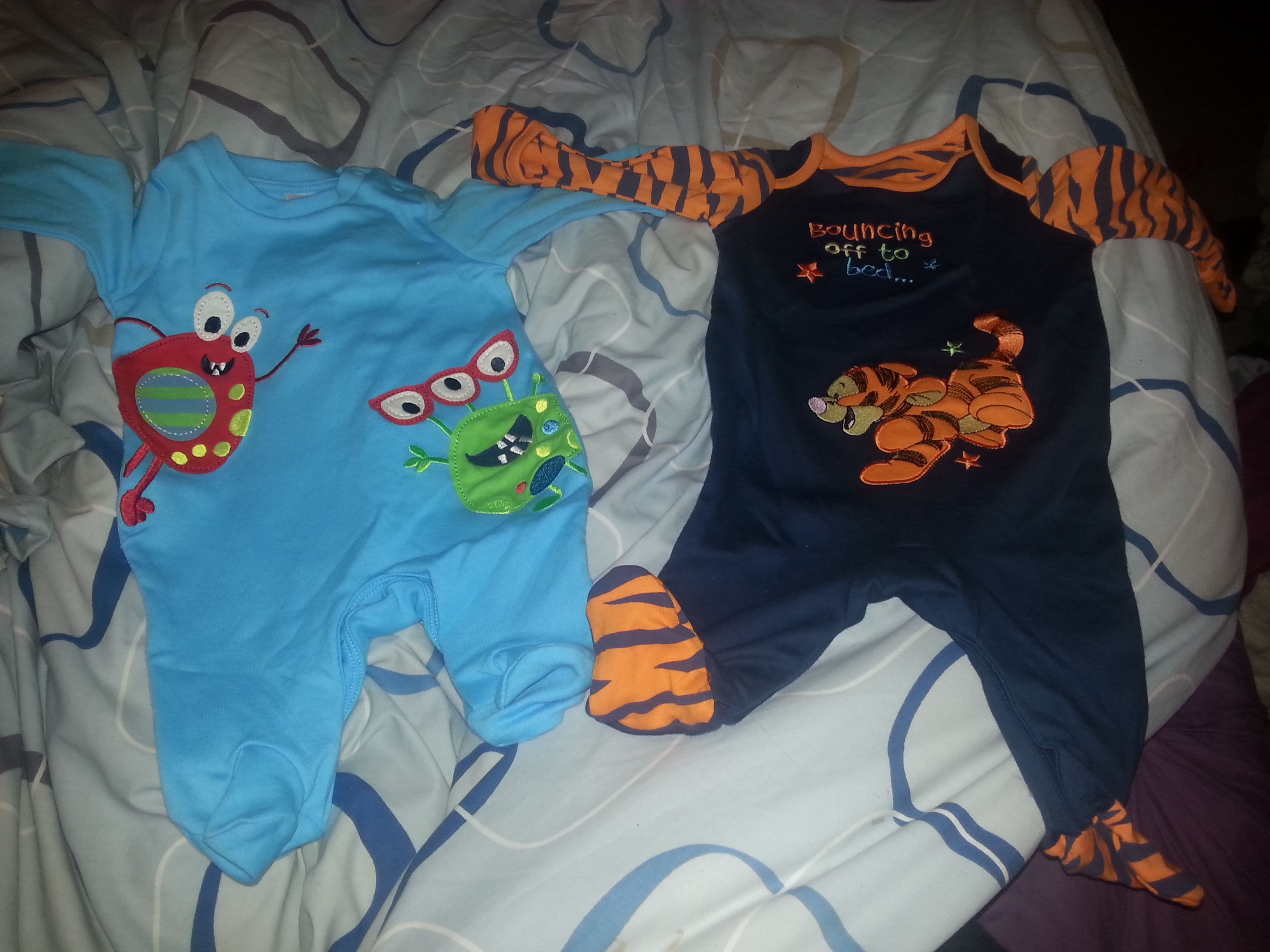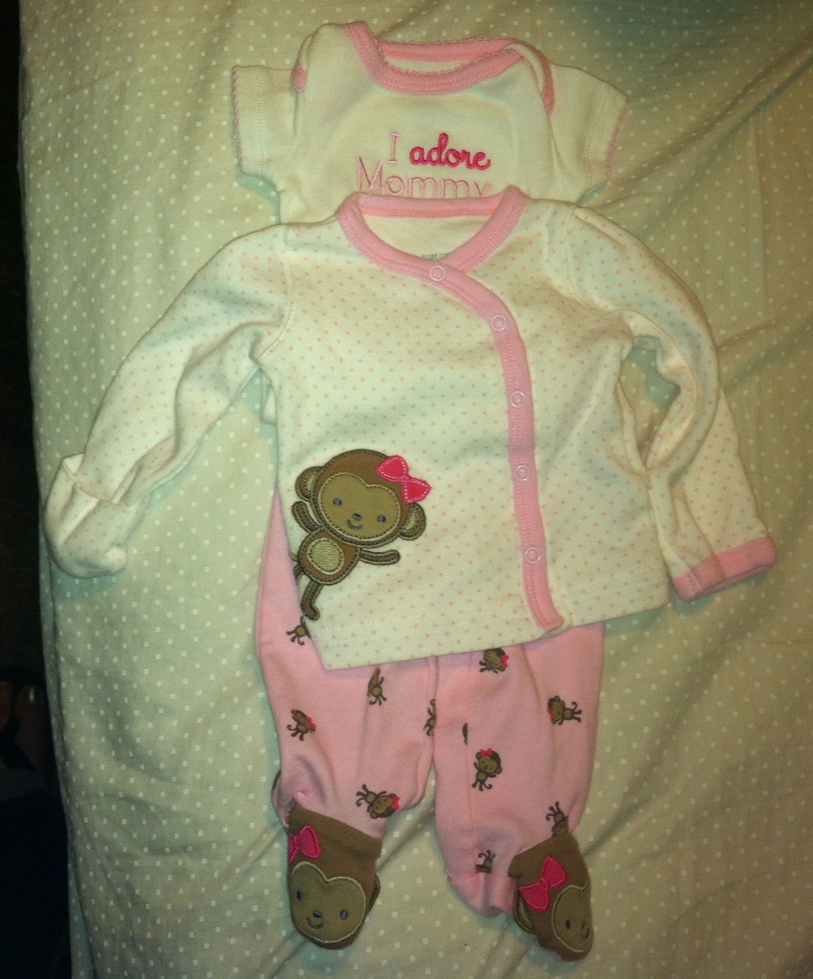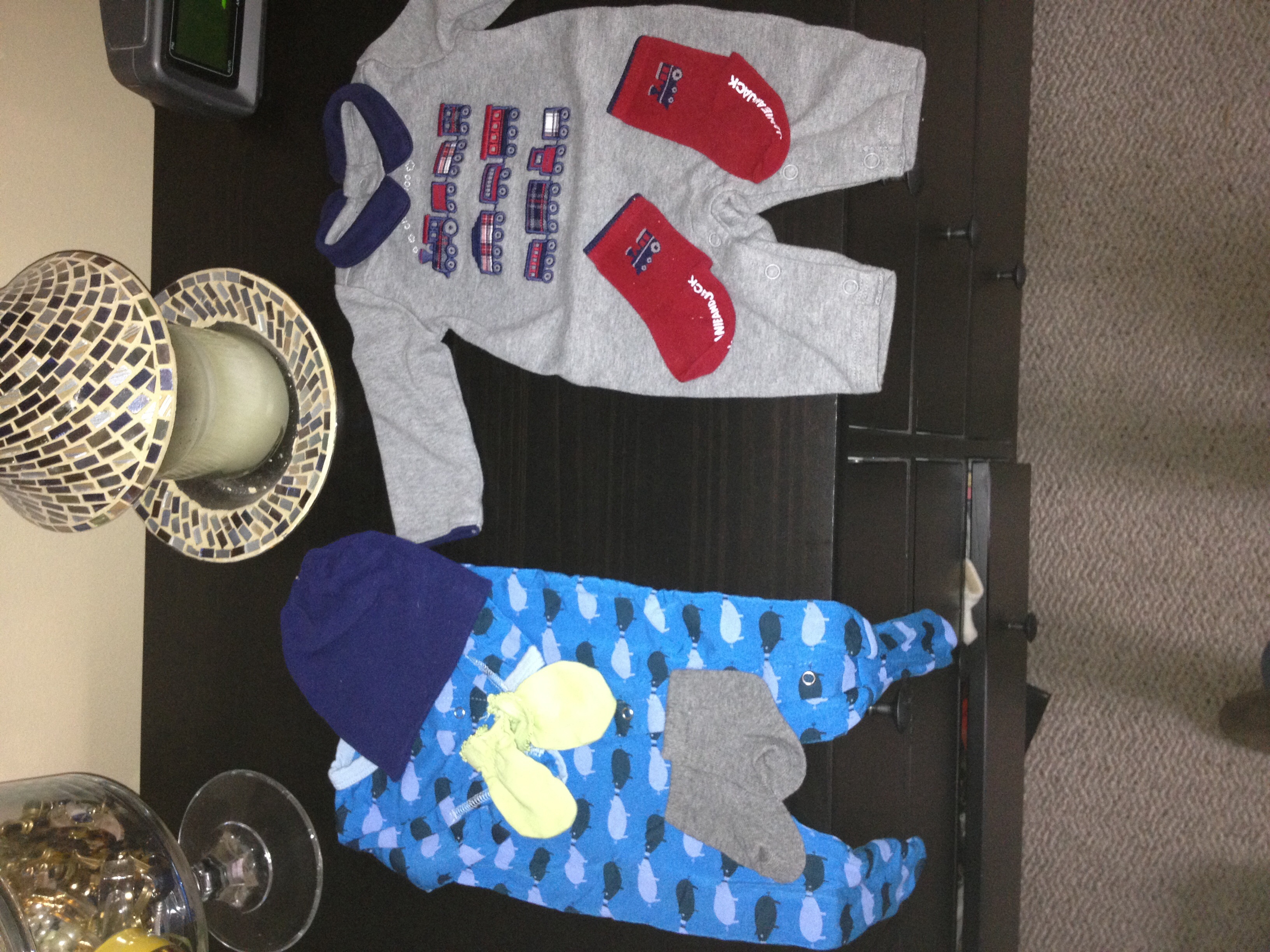 I have a little blue monkey outfit from Carters-it has monkeys on the feet! Of that outfit is too big, I have a little blue gown that converts to a footless sleeper covered with little puppy paw prints.