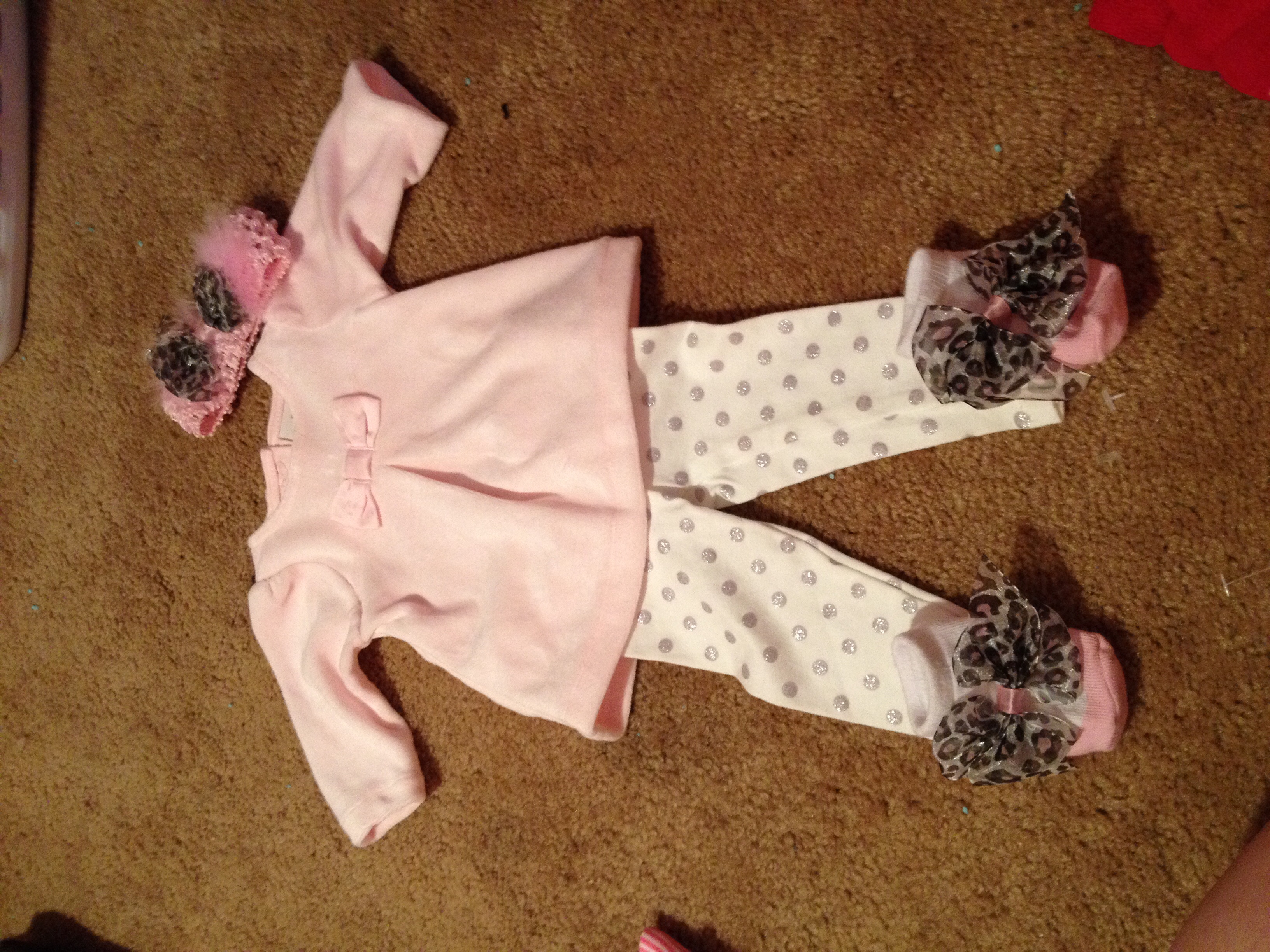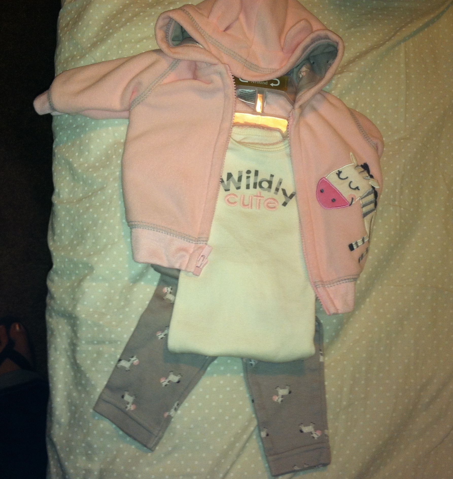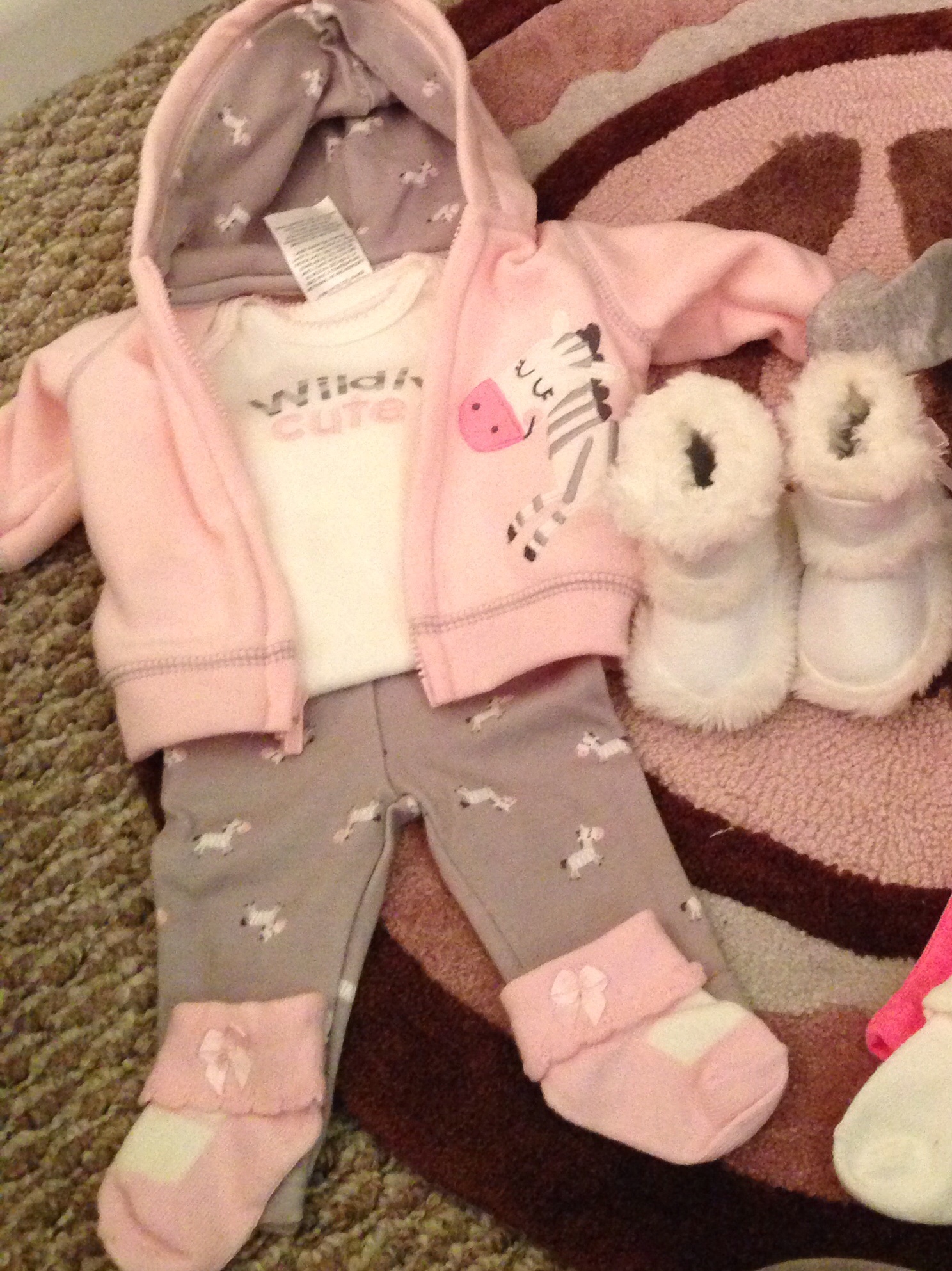 I have a little blue monkey outfit from Carters-it has monkeys on the feet! Of that outfit is too big, I have a little blue gown that converts to a footless sleeper covered with little puppy paw prints.