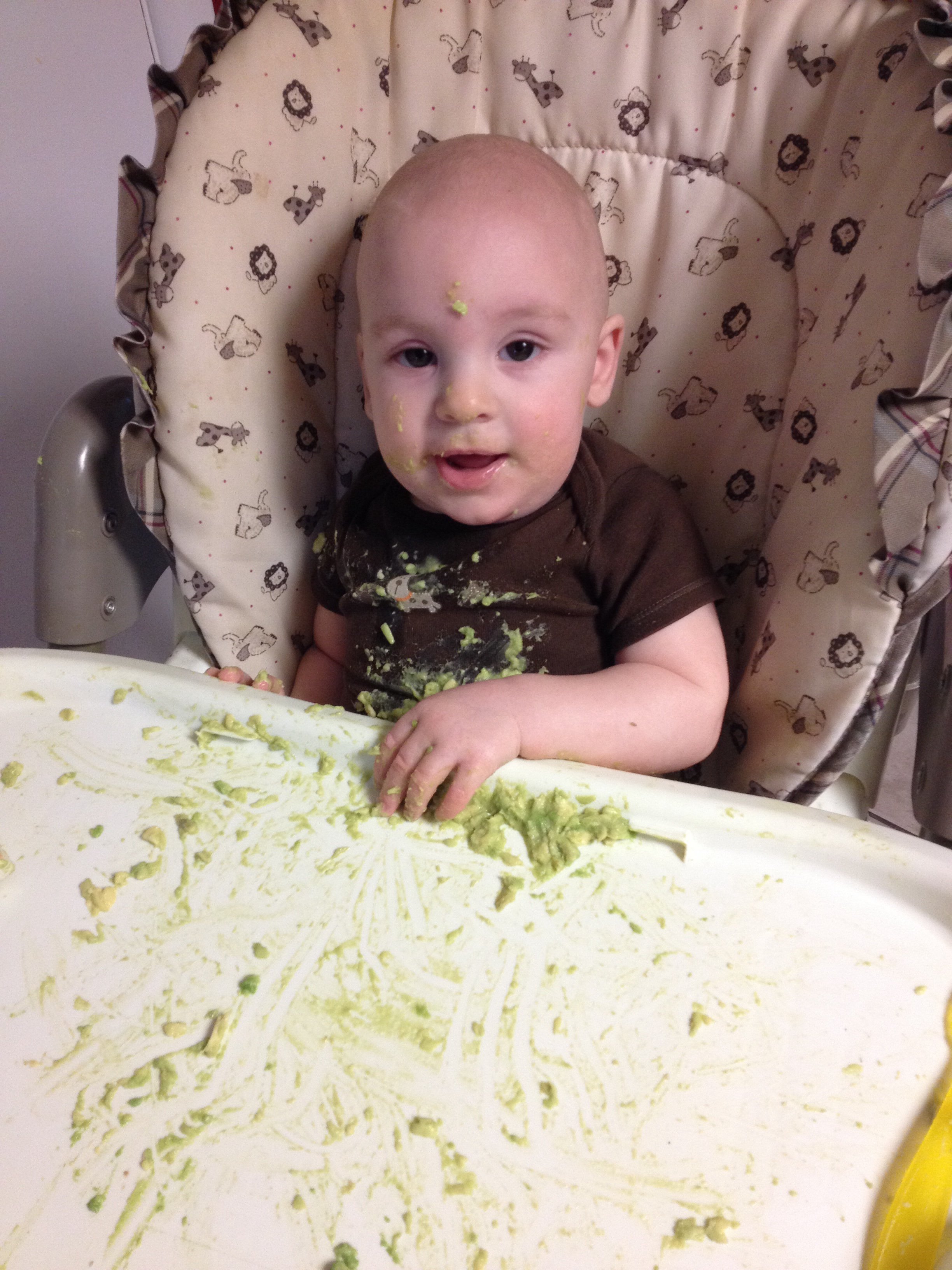 Normally I spoon feed him purées but I was busy in the kitchen so I just put mashed up avocado on his tray. It was more fun to play with than to eat for sure!