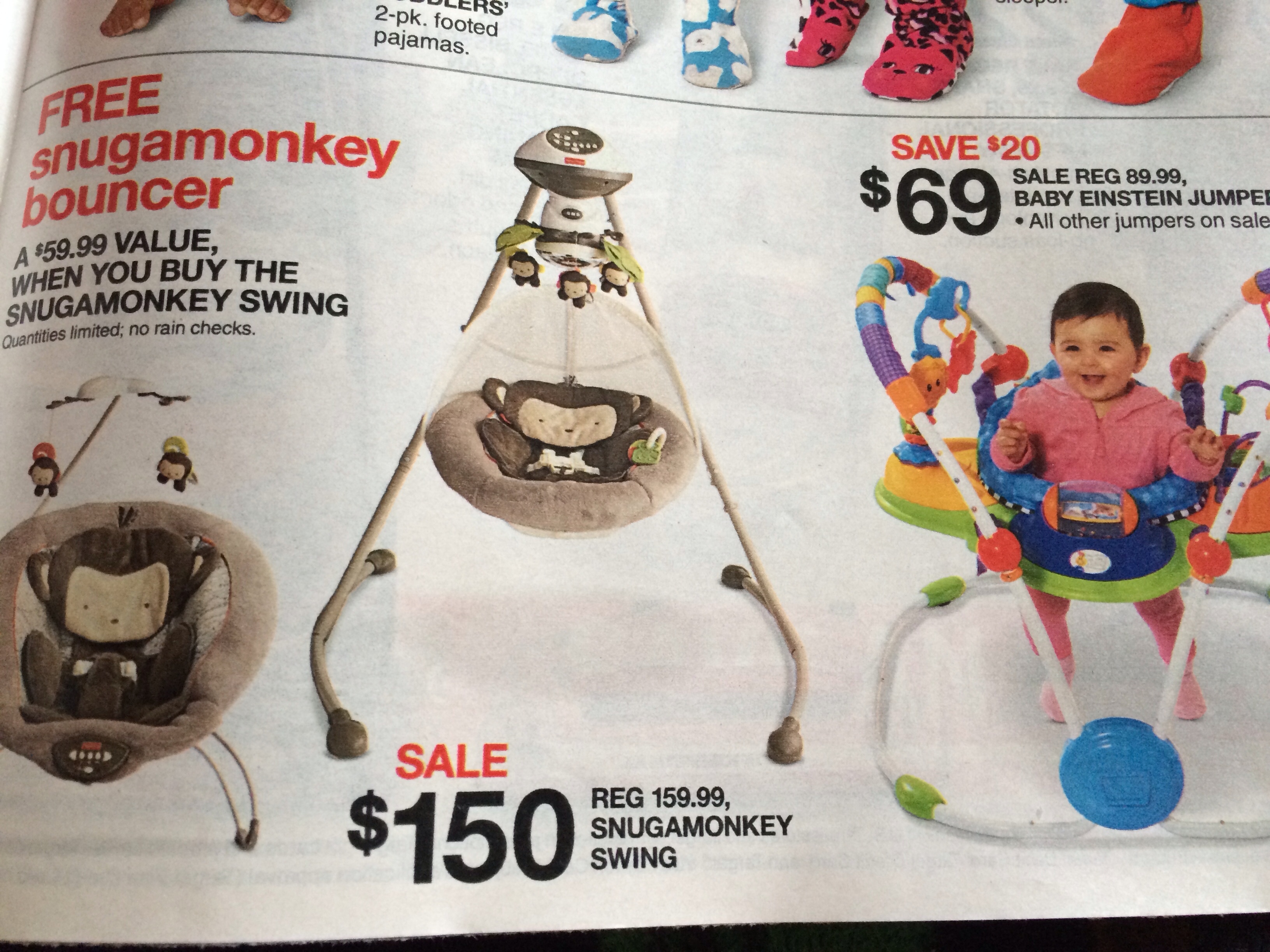 I just got them online and the deal was good there as well I also checked out retailmenot and there was a deal/link there for Target for $5 off of $50 site wide + free shipping. I actually picked up the snugamonkey RNP & the FP rainforest friends jumper too. Both were on sale for almost $20 off the normal price as well. I did 3 separate transactions online buying each item separately (adding the swing to your cart automatically adds the bouncer for $0.00) & used the retailmenot promo for each transaction. That's $5 off each item/transaction, free shipping, plus the target sale prices!