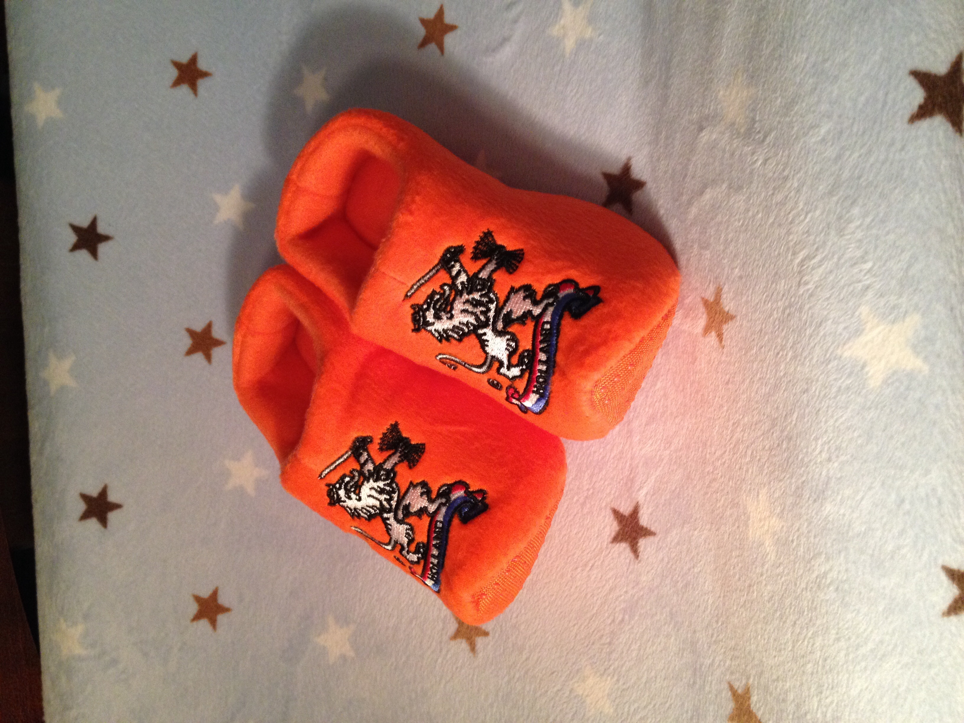 Stripes, with leopard print, grandma bib, and socks over the pants? You are styling Baby E.