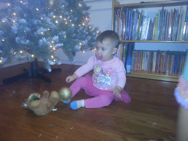 • She loved the glitter bulbs. I am very proud of K for not going after the tree at all today. Last night was a different story.