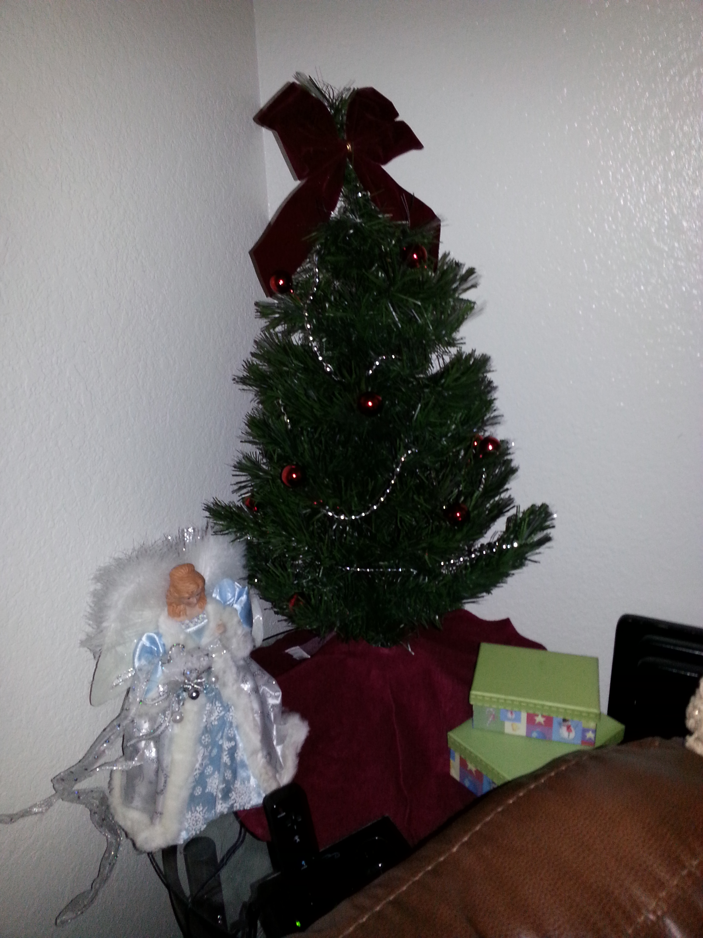 • This is my small tree corner :). It's behind the couch cause that's where it's always gone since I got the little tree. Apartment living does not make for a good Christmas tree area. It is fiber optic I just don't have it on :)