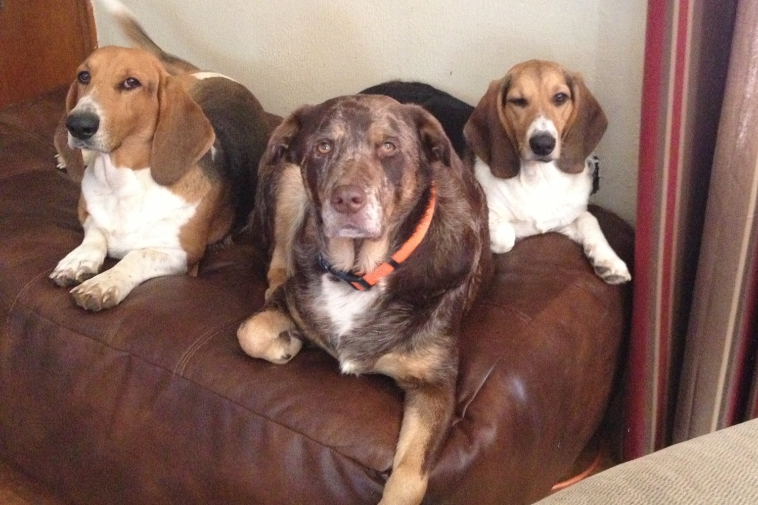 I have a chocolate lab/Aussie. She was indifferent toward me until she ran into the street when we were moving and was grazed by a truck and I was her caretaker after her vet visit. Luckily she had very minimal injuries. Now she follows me room to room. Here's a pic because I love her coloring. Her name is Cammie and she's pictured with Fred on the left and his son Jack. (We also have a yellow lab and a hairy white mutt.)