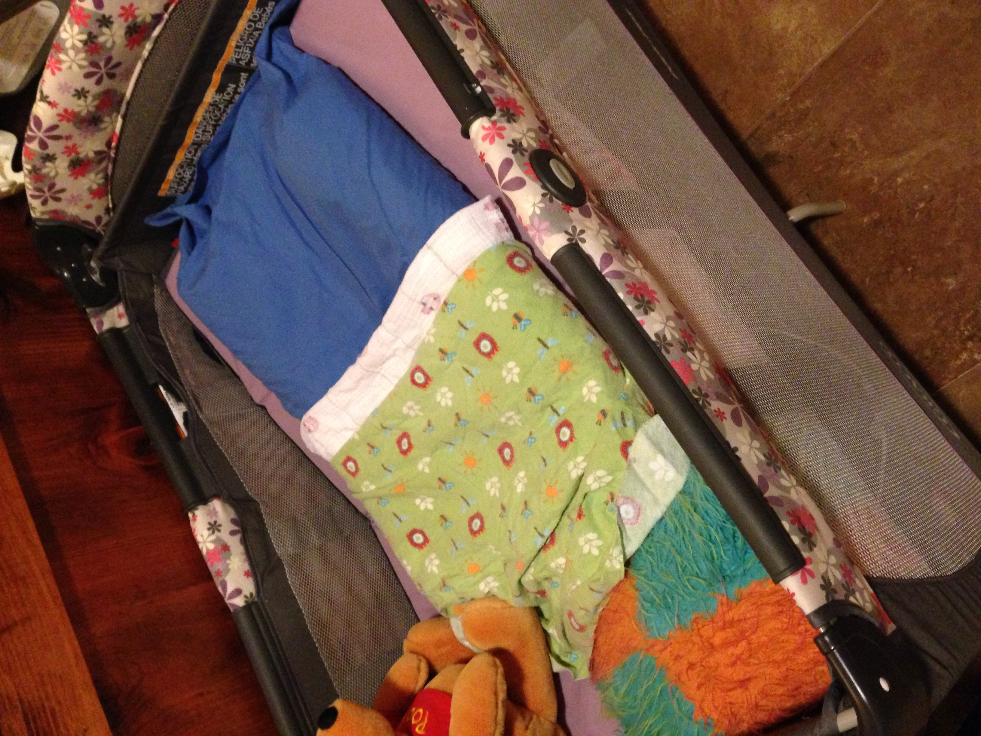 This is a pic of how the PNP was set up. Ignore the pillow and Pooh and receiving blanket (we just use the muslin), I had been cleaning for company.