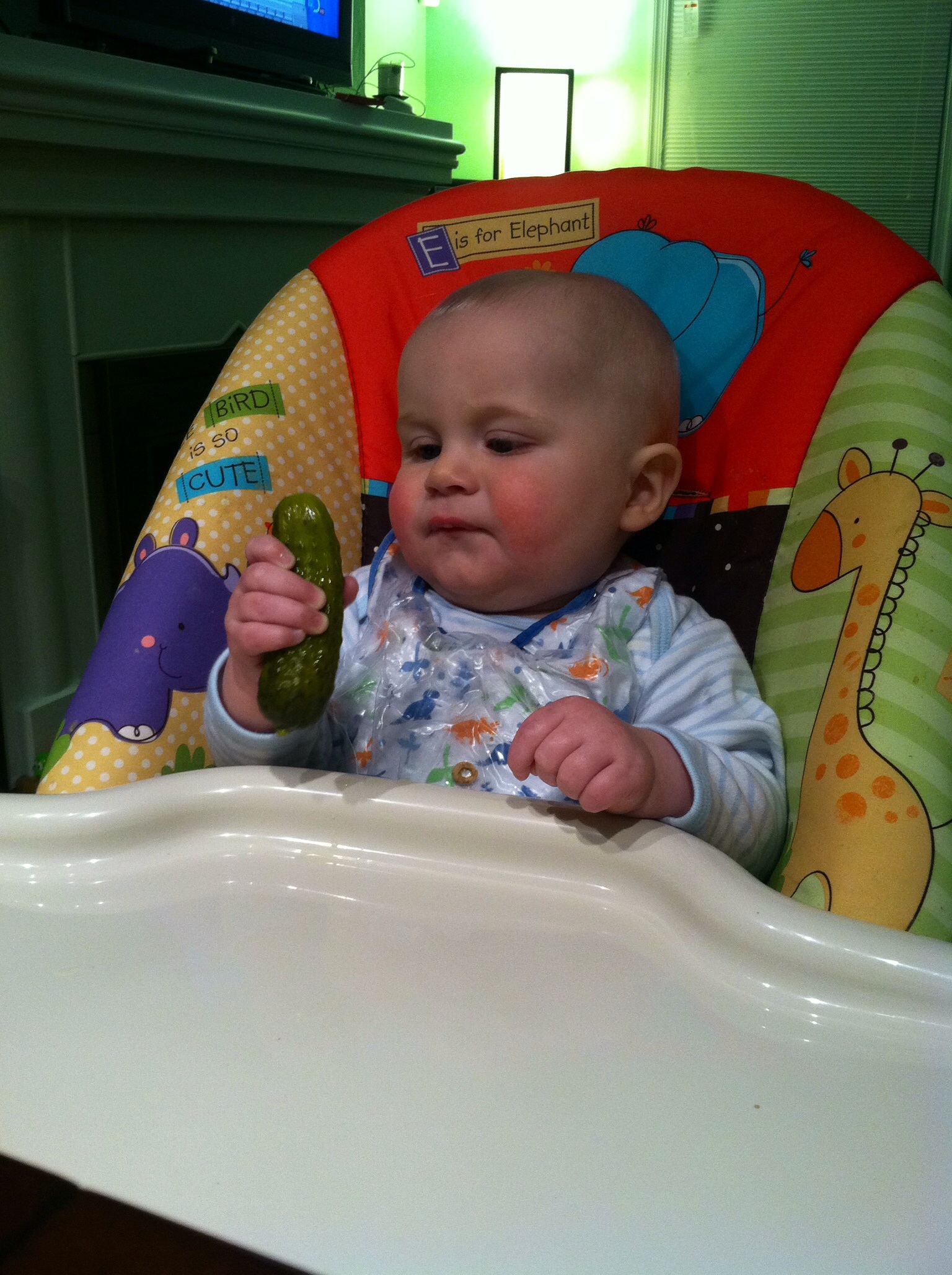 • When they get a little older cold celery and whole pickles were a hit at our house for gnawing. Also yonanas, frozen bananas with the consistency of frozen yoghurt, is something to try after solids have been introduced. Pic if DS1 with a pickle.