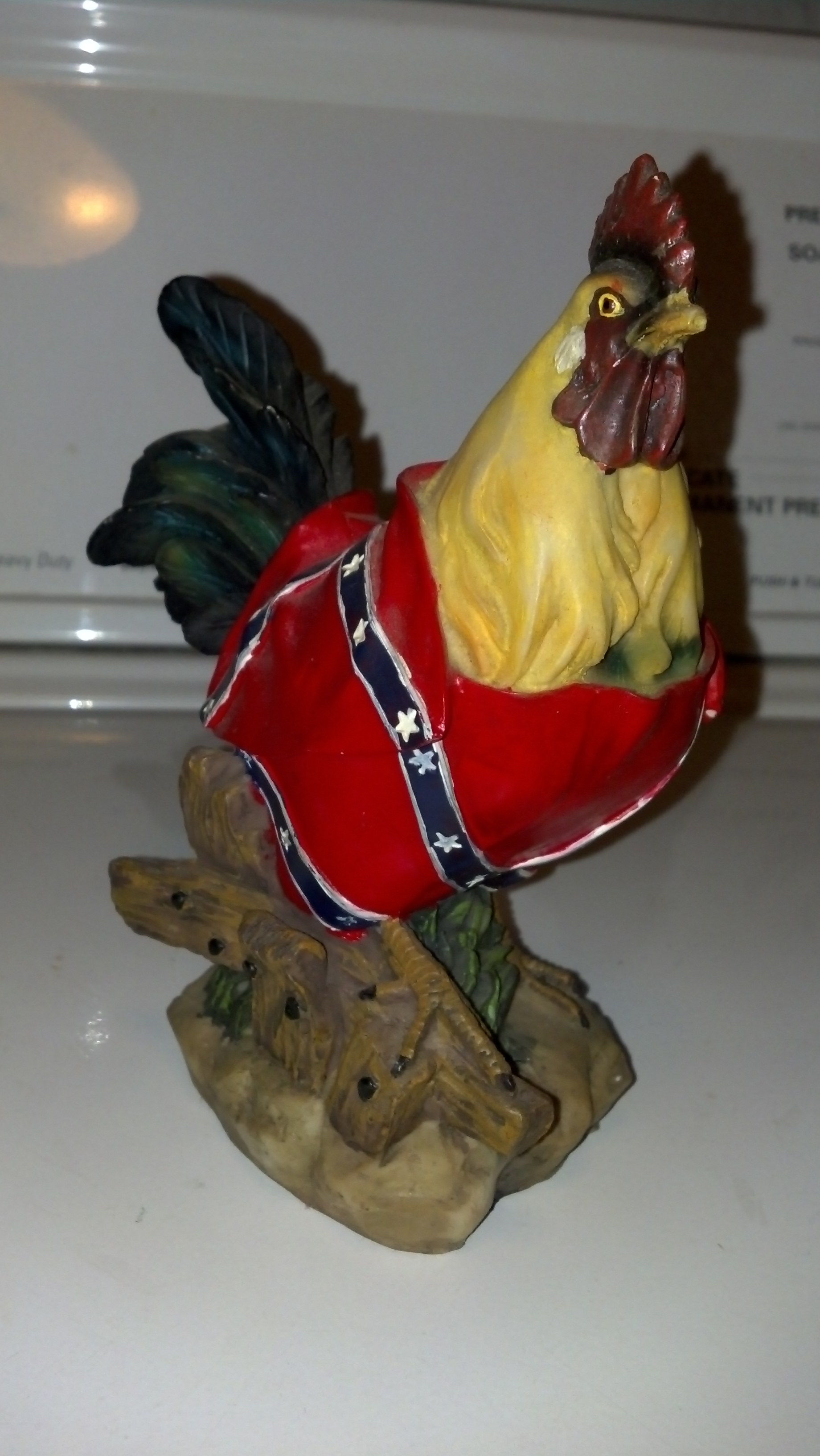 Does it have to do with a KU thing? I can't remember if your a fan or not. And I know Jayhawks are not Chickens. It's just a really weird gift. Maybe if you kept chickens or confederate flags around great.