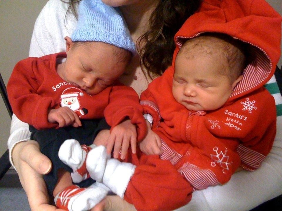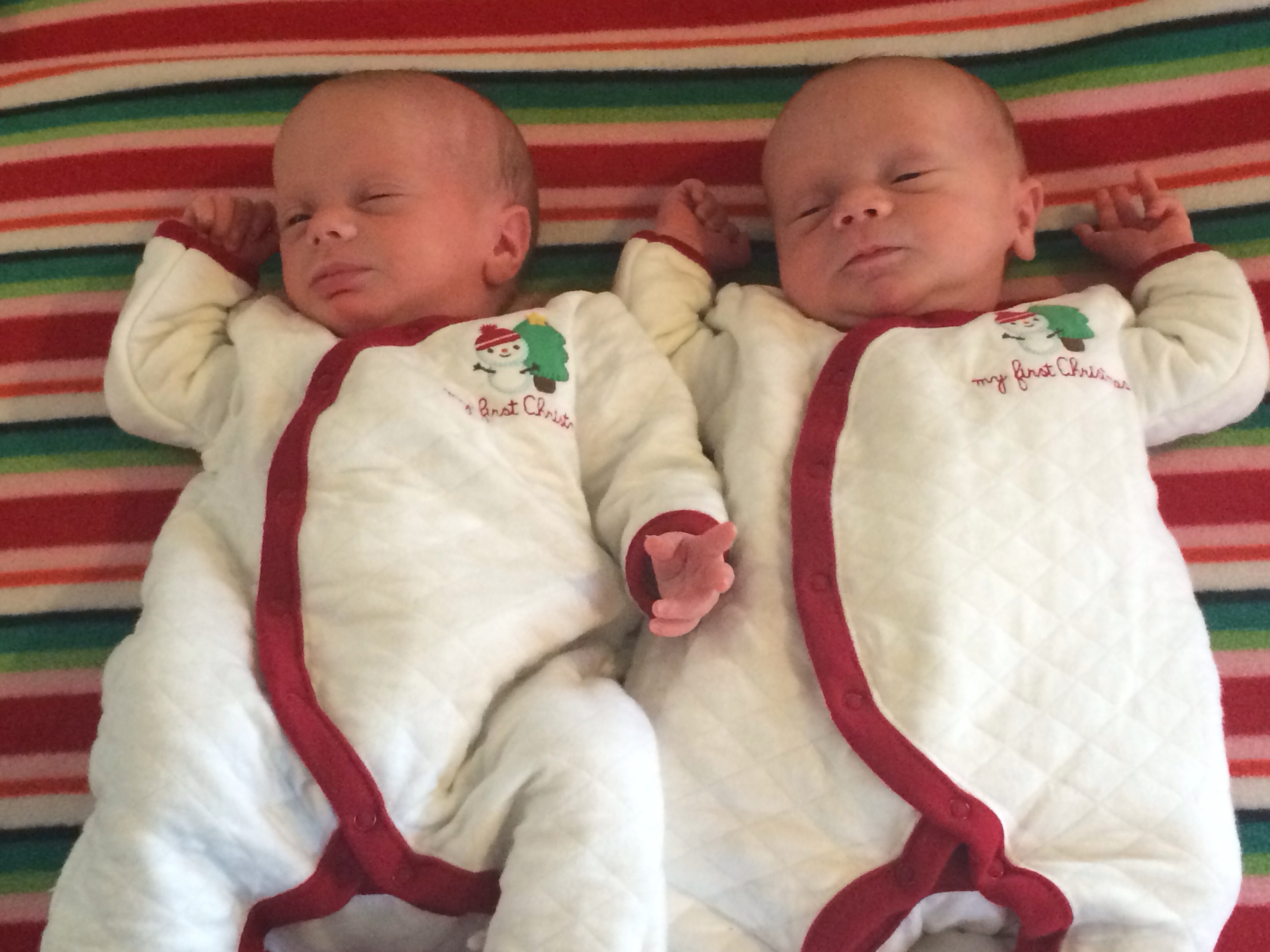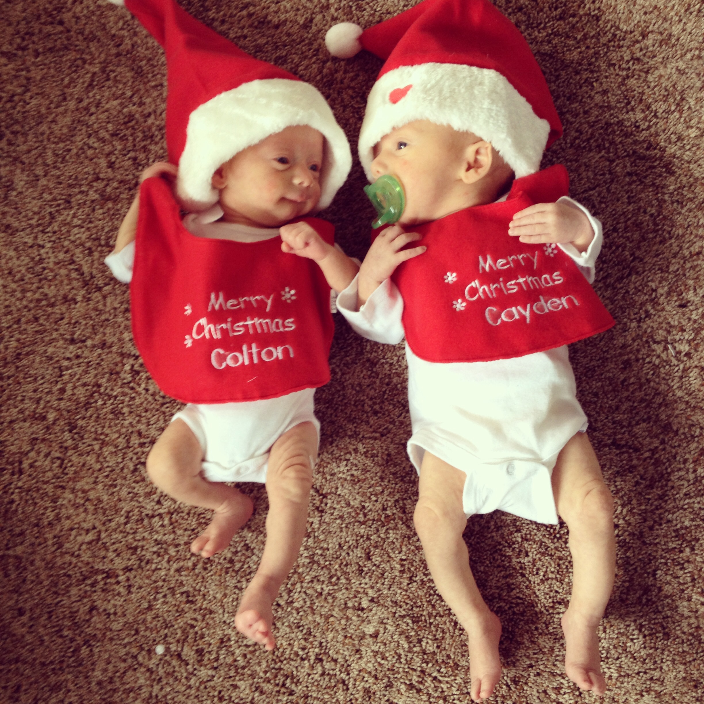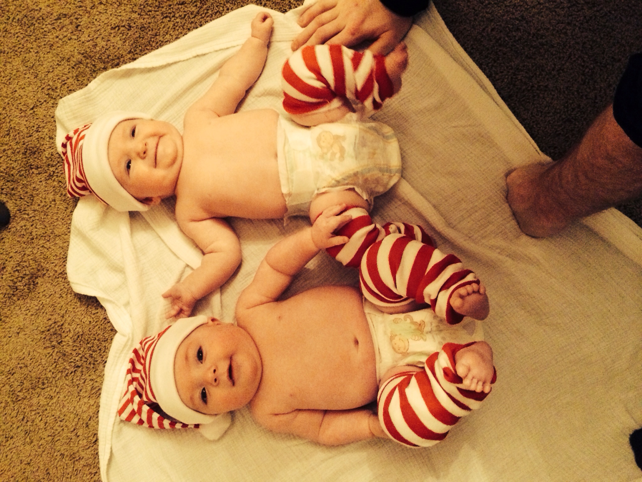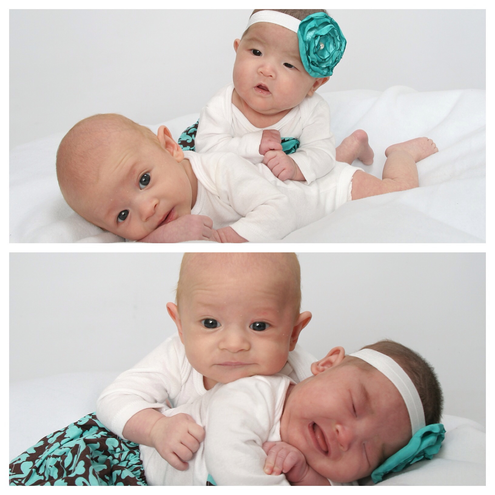 The Christmas pics are on my husband's phone, but here are some from our photo session on Monday. E weighs about 2 pounds less than H; she did not like having H on top of her.