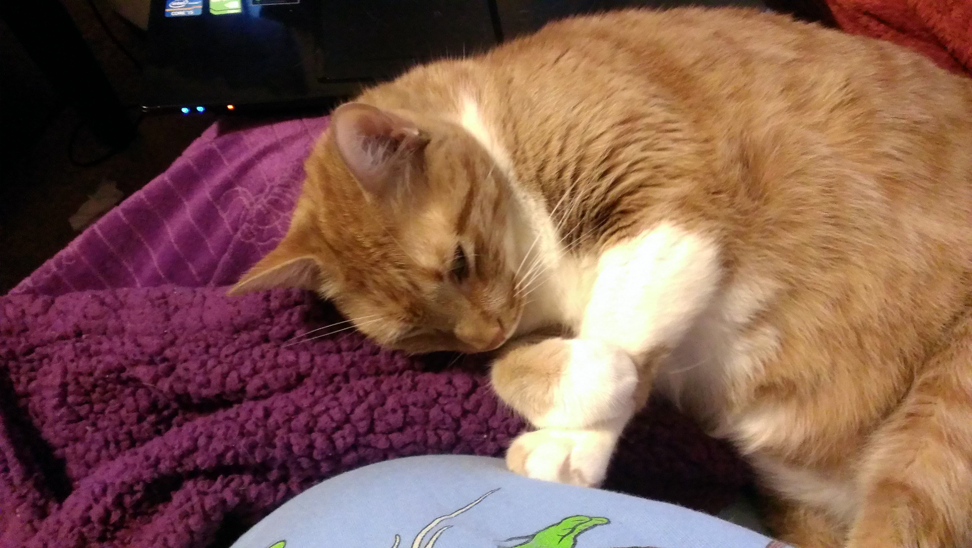 He's not just "cuddly," he's velcroed to me. Since early in first tri when I would sleep from the time I got home from work, he would snuggle in behind my knees and purr while I slept. The few times I vomited, he ran to the bathroom with me and sat beside the toilet until I was done.