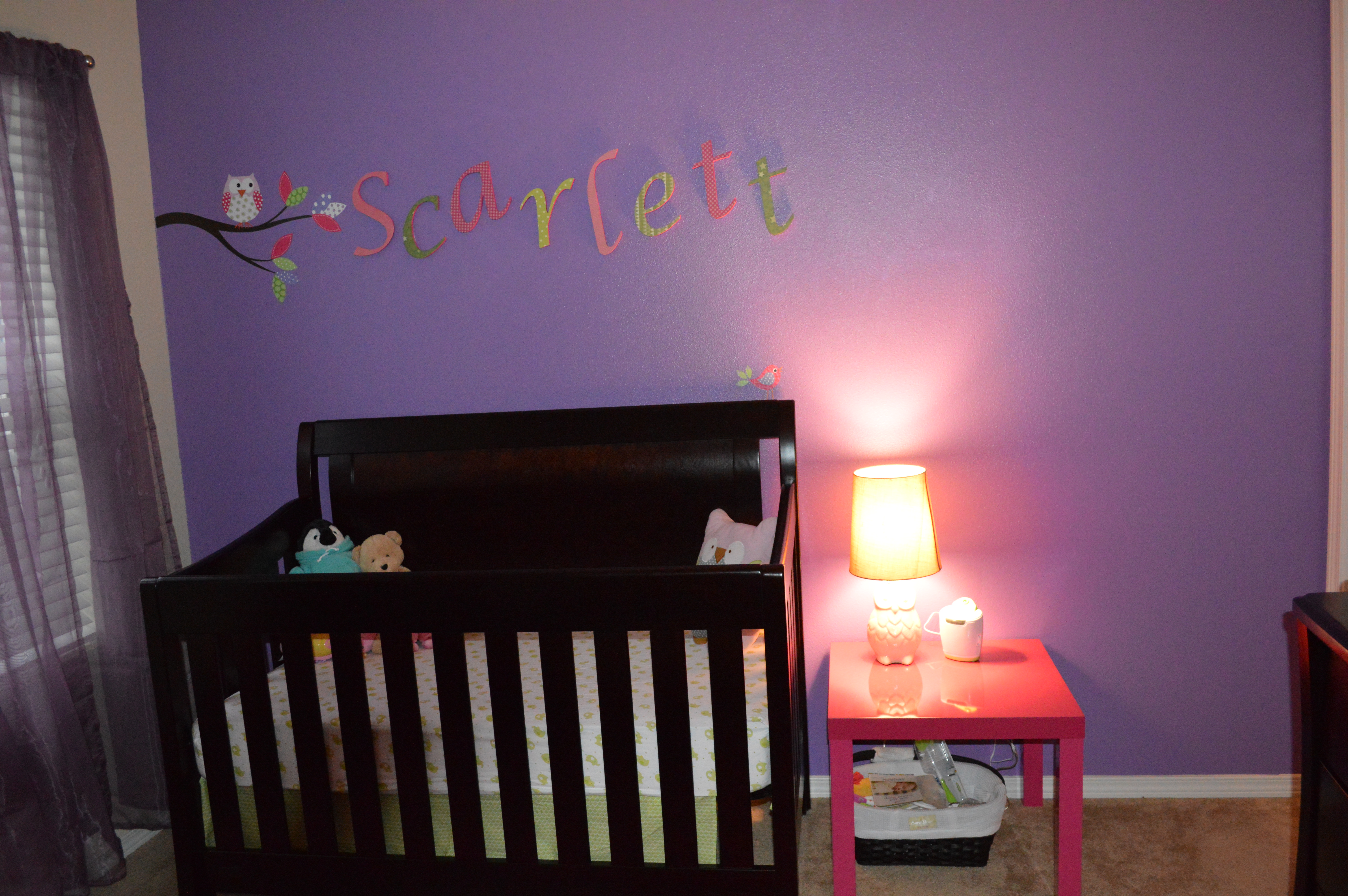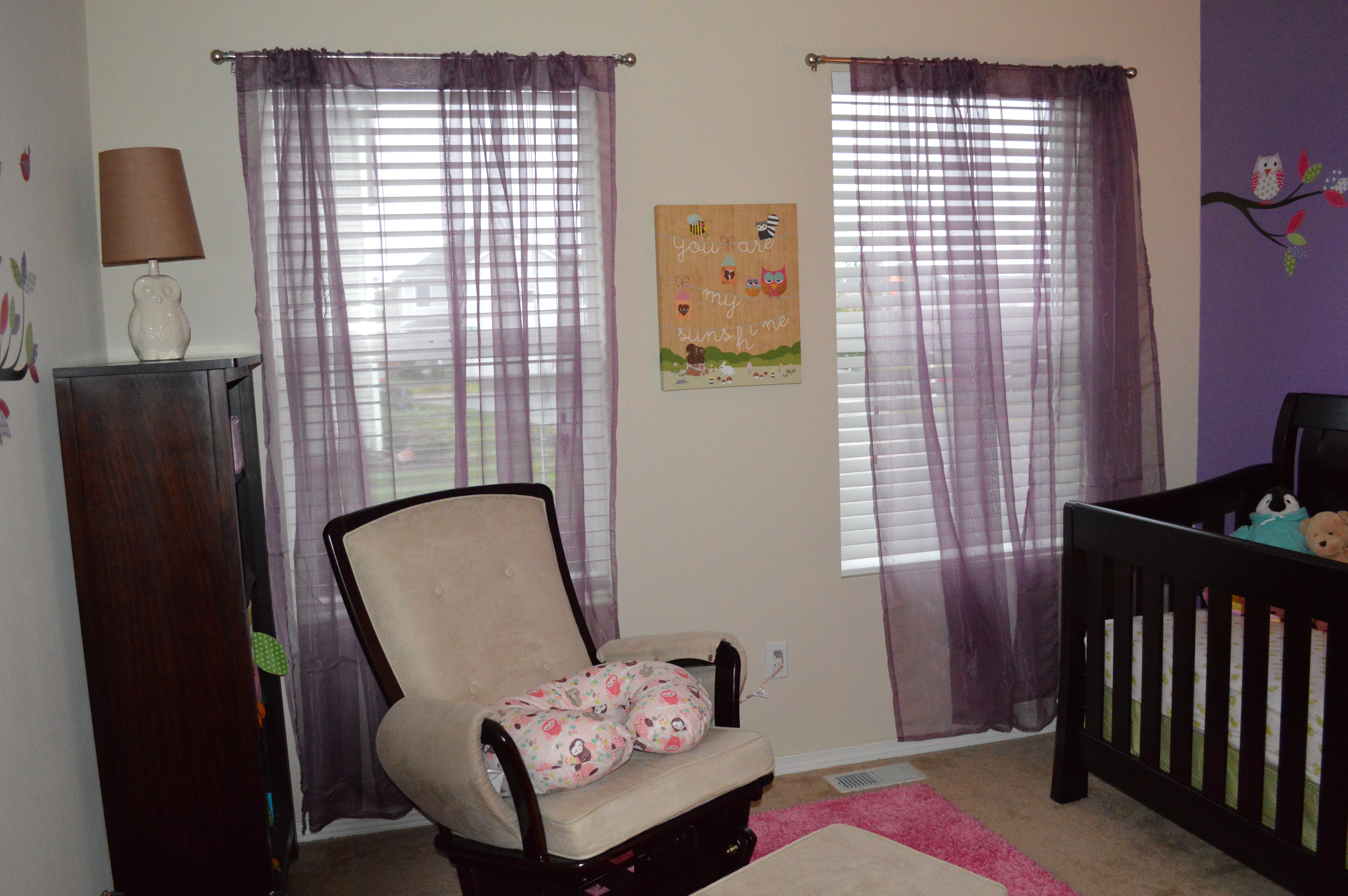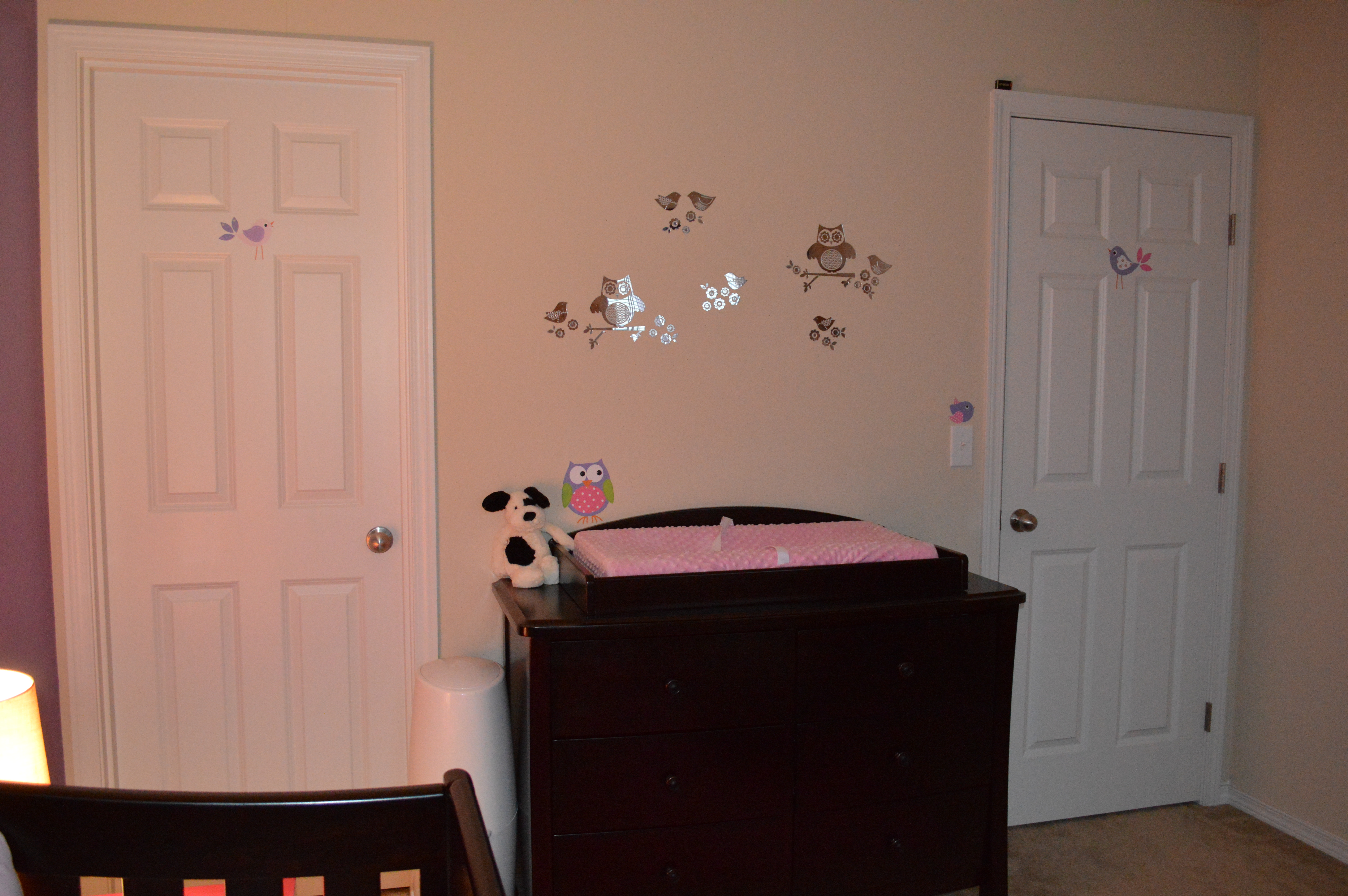 I just had to share pictures of the nursery and I am pretty sure we don't have a nursery post each week, but if we do sorry for the extra post! I am pretty proud of how everything turned out and I don't think the pictures really do it justice. If you can't tell it is an owl theme and even the lamps are owls. I had decided on owls before we ever got our BFP and now they are everywhere which made it easy to find stuff but sadly extremely trendy. I still love it though! It's hard to tell but the owls above the changing table are mirrors and there is a bright pink shag-like rug in the center of the room.