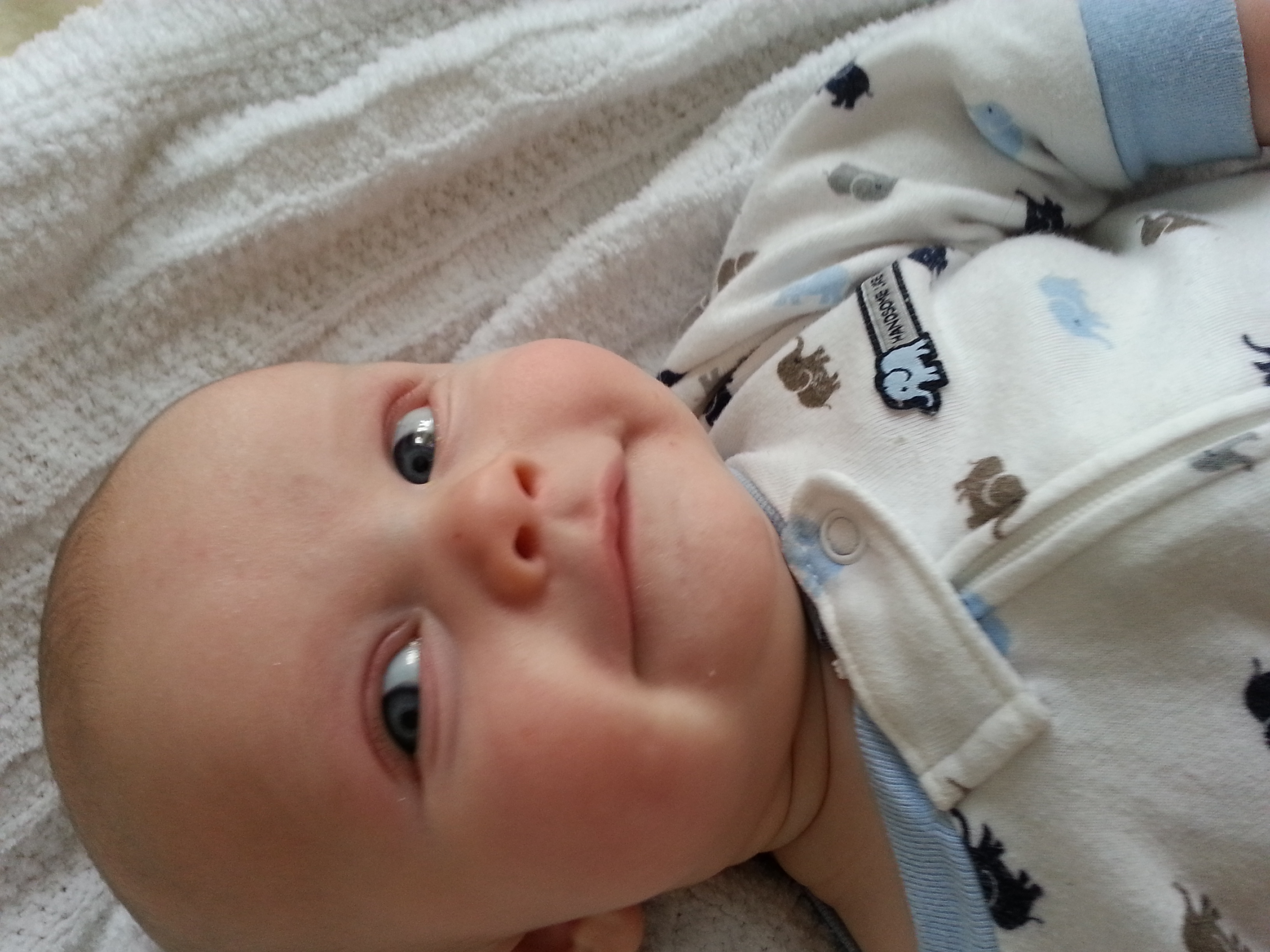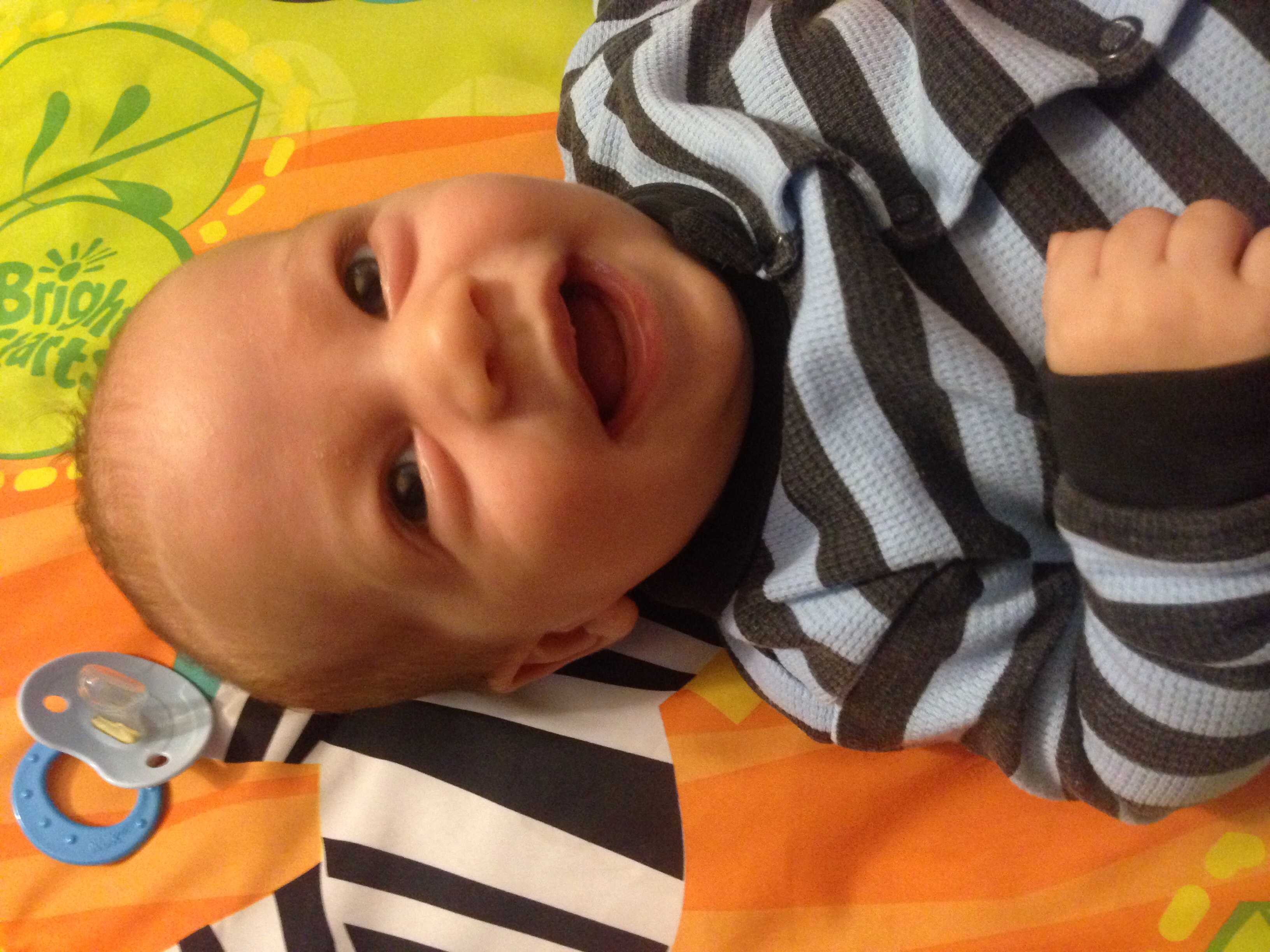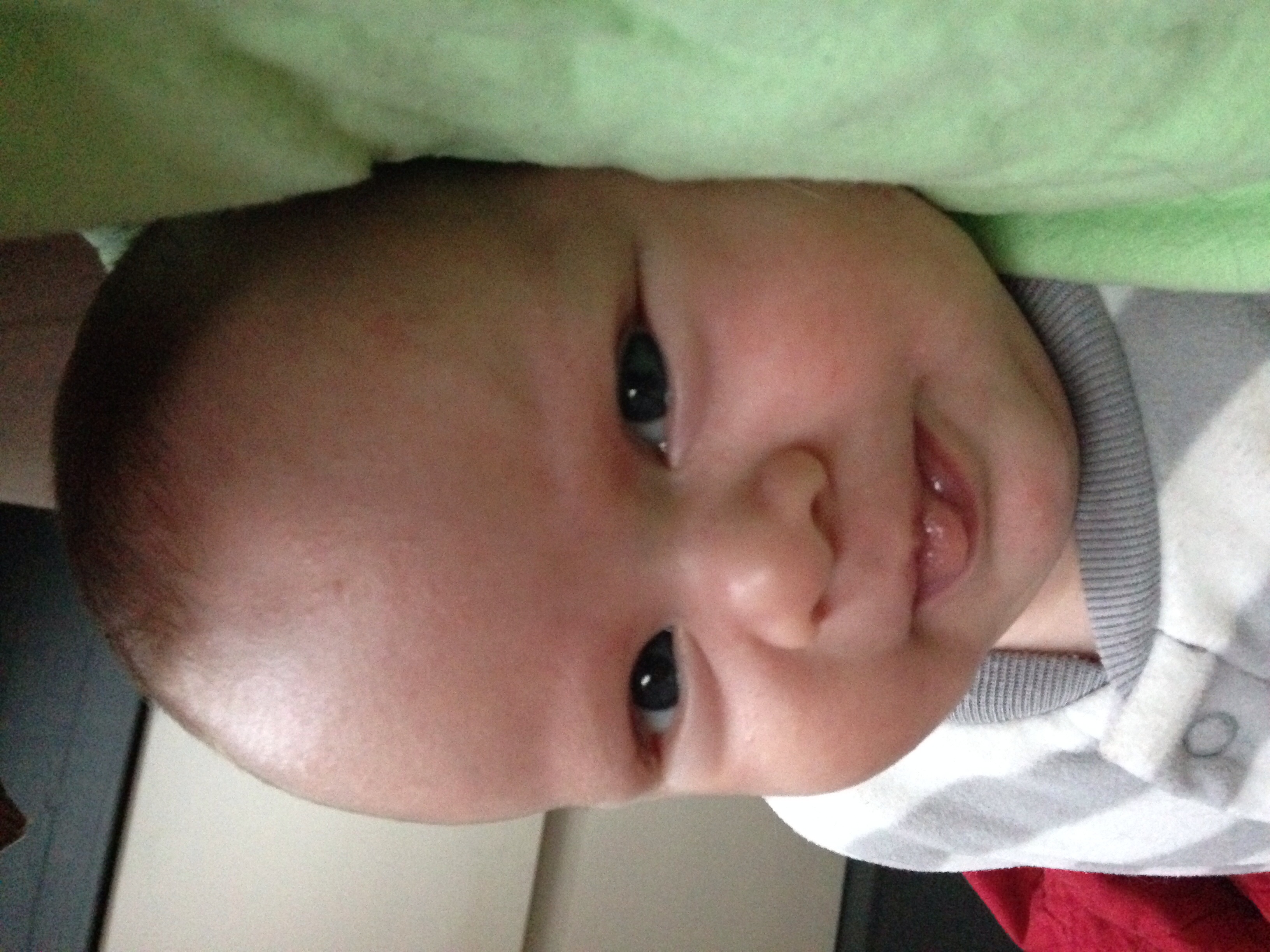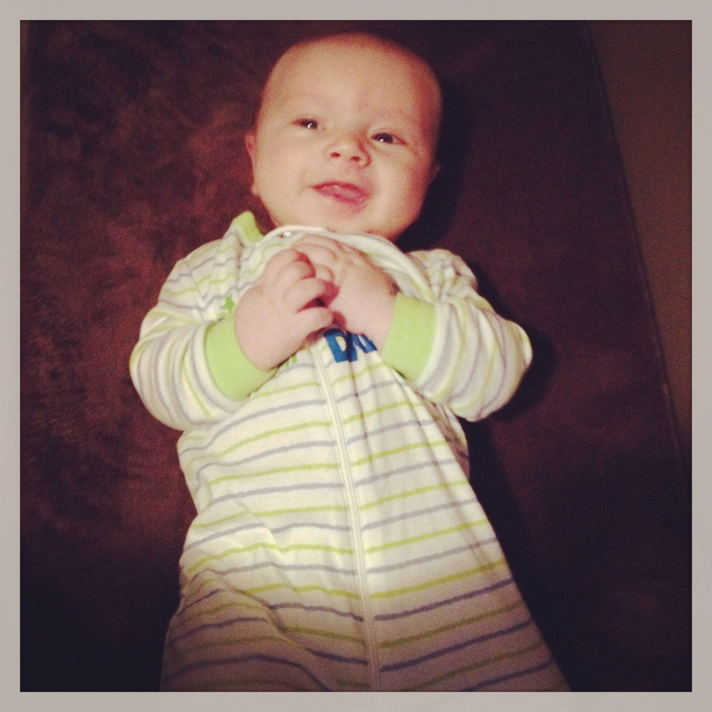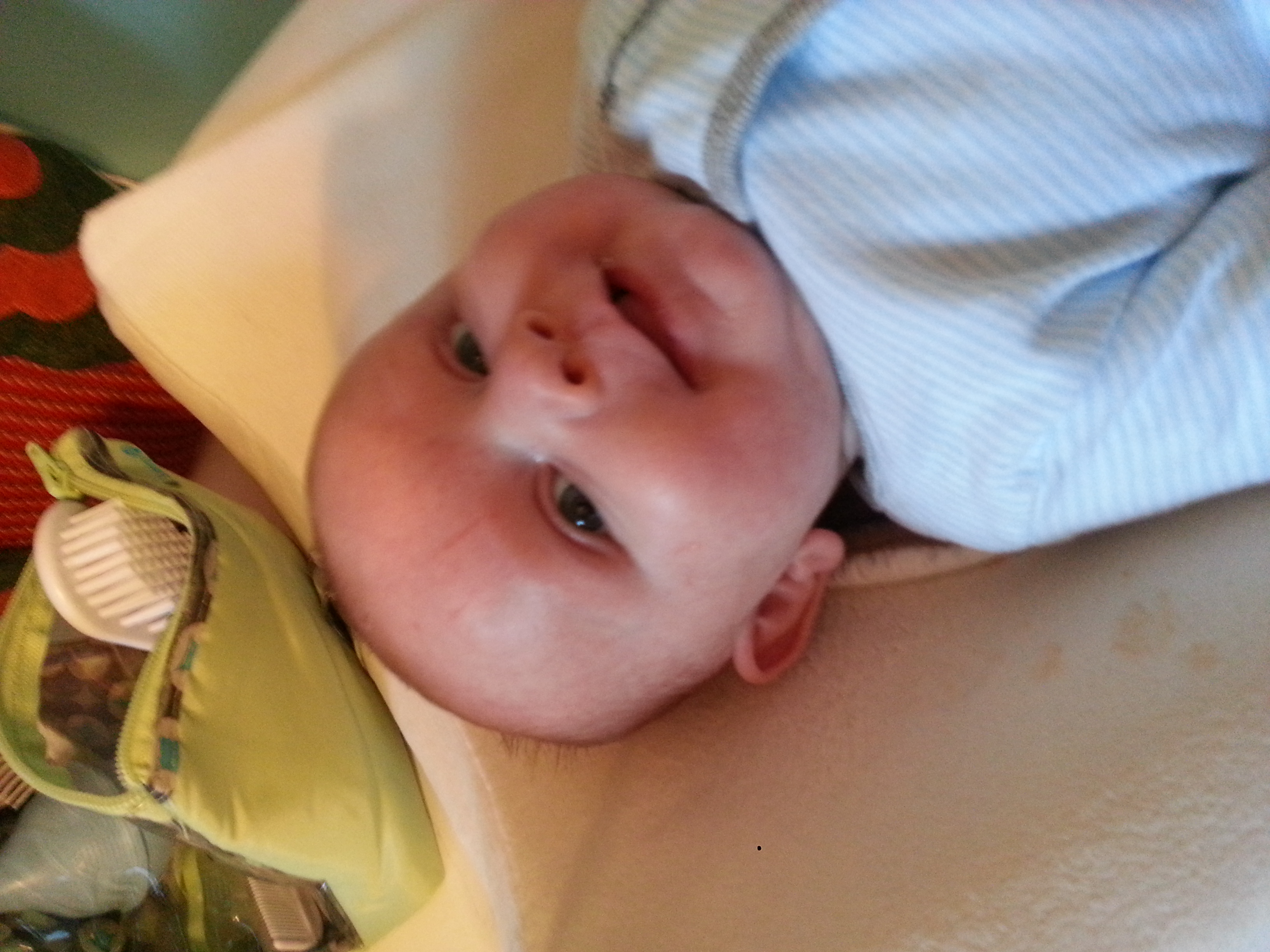 He - obviously - needed to make sure I take a nice picture this morning. I'm impressed that the mirror is actually clean! He's a little rocket and never sits still. He coos and babbles his heart out when he's being talked to (most of the time).