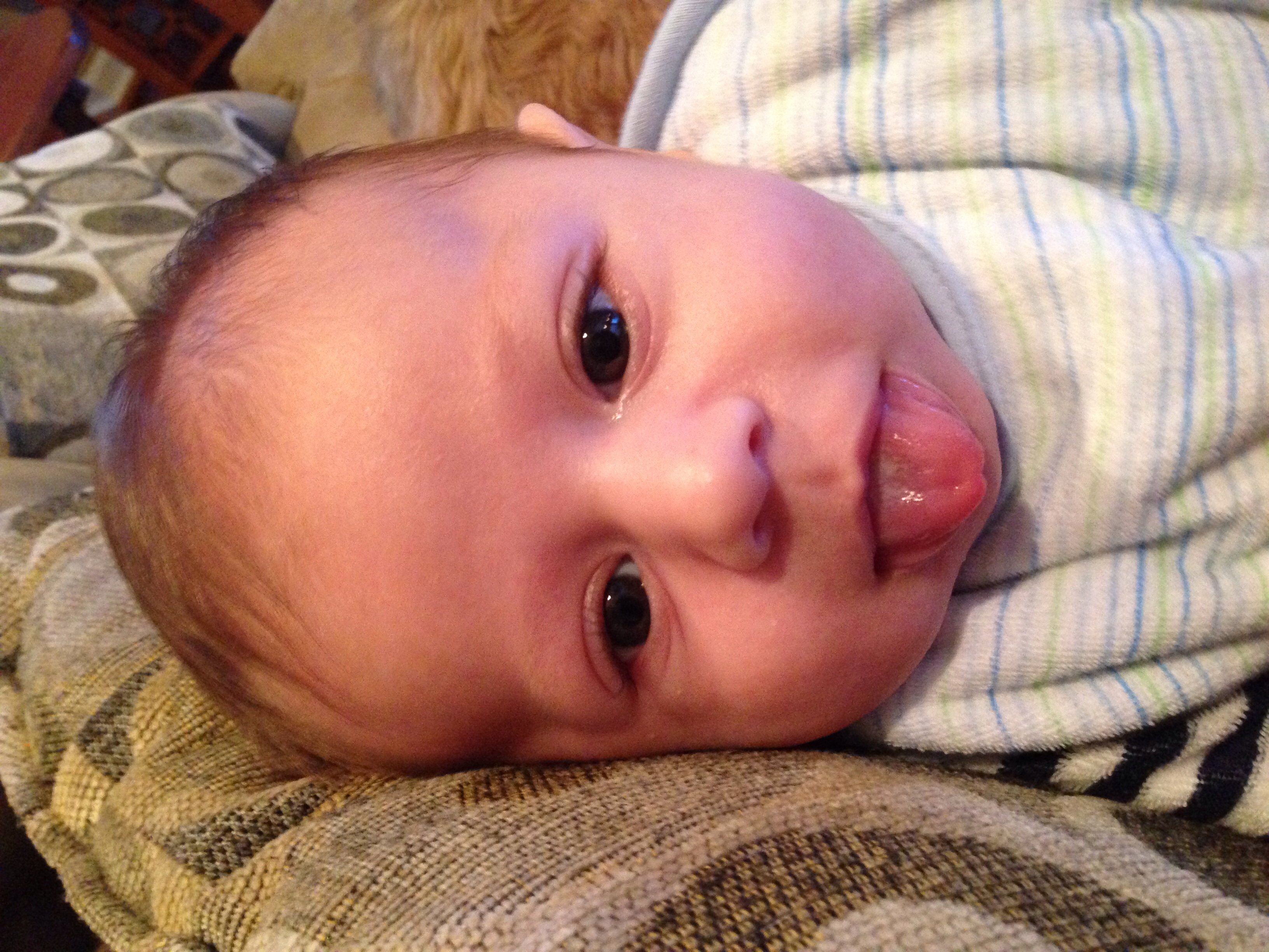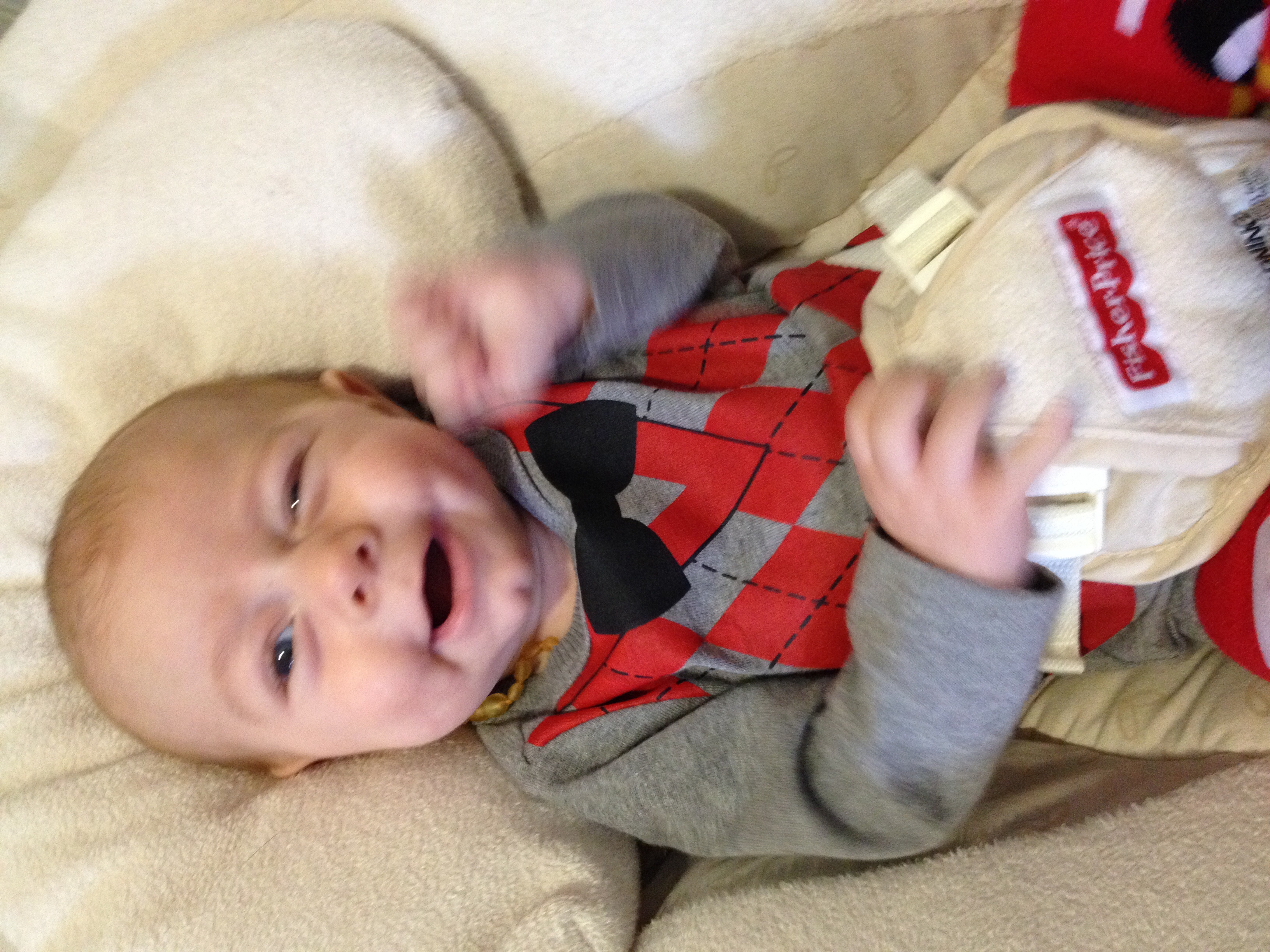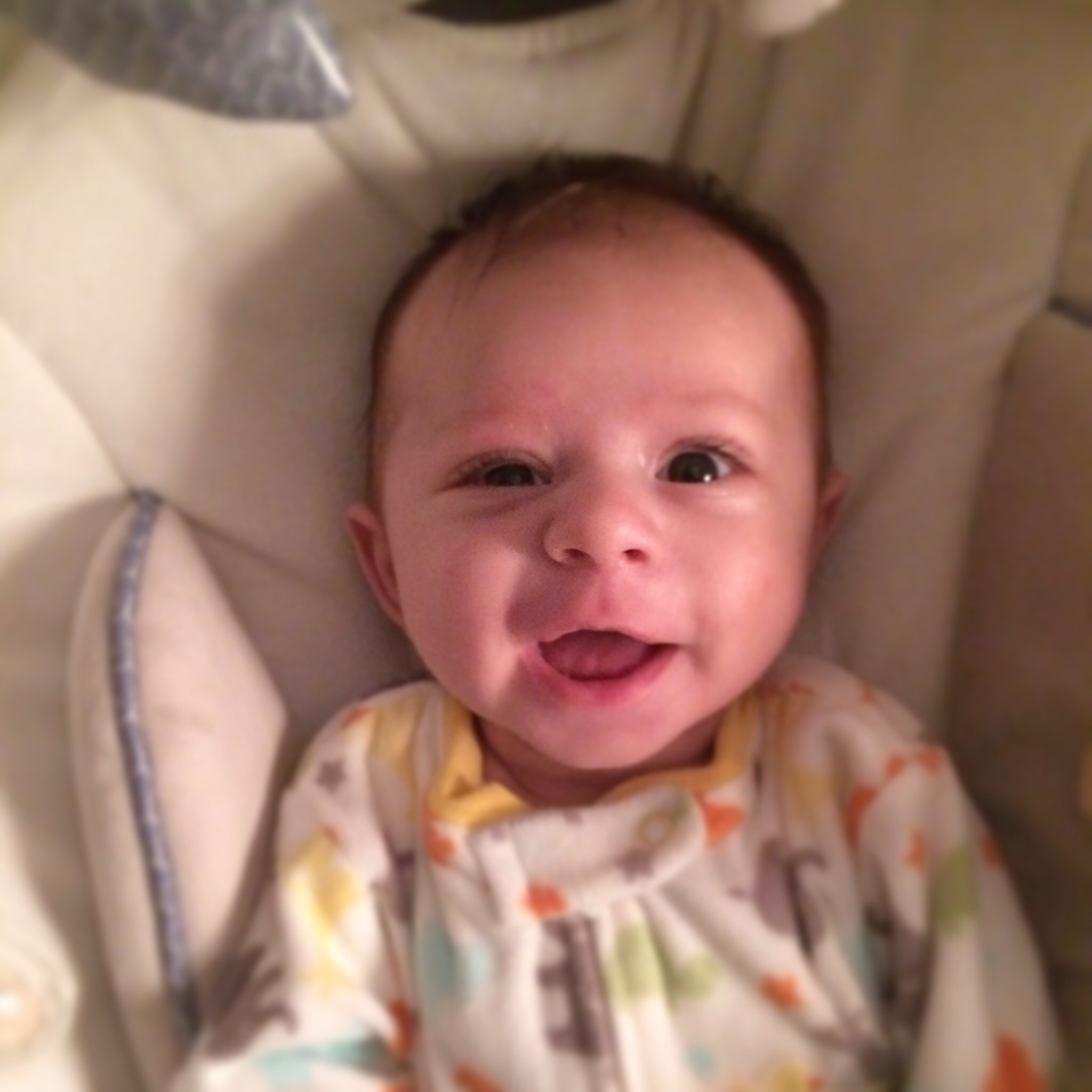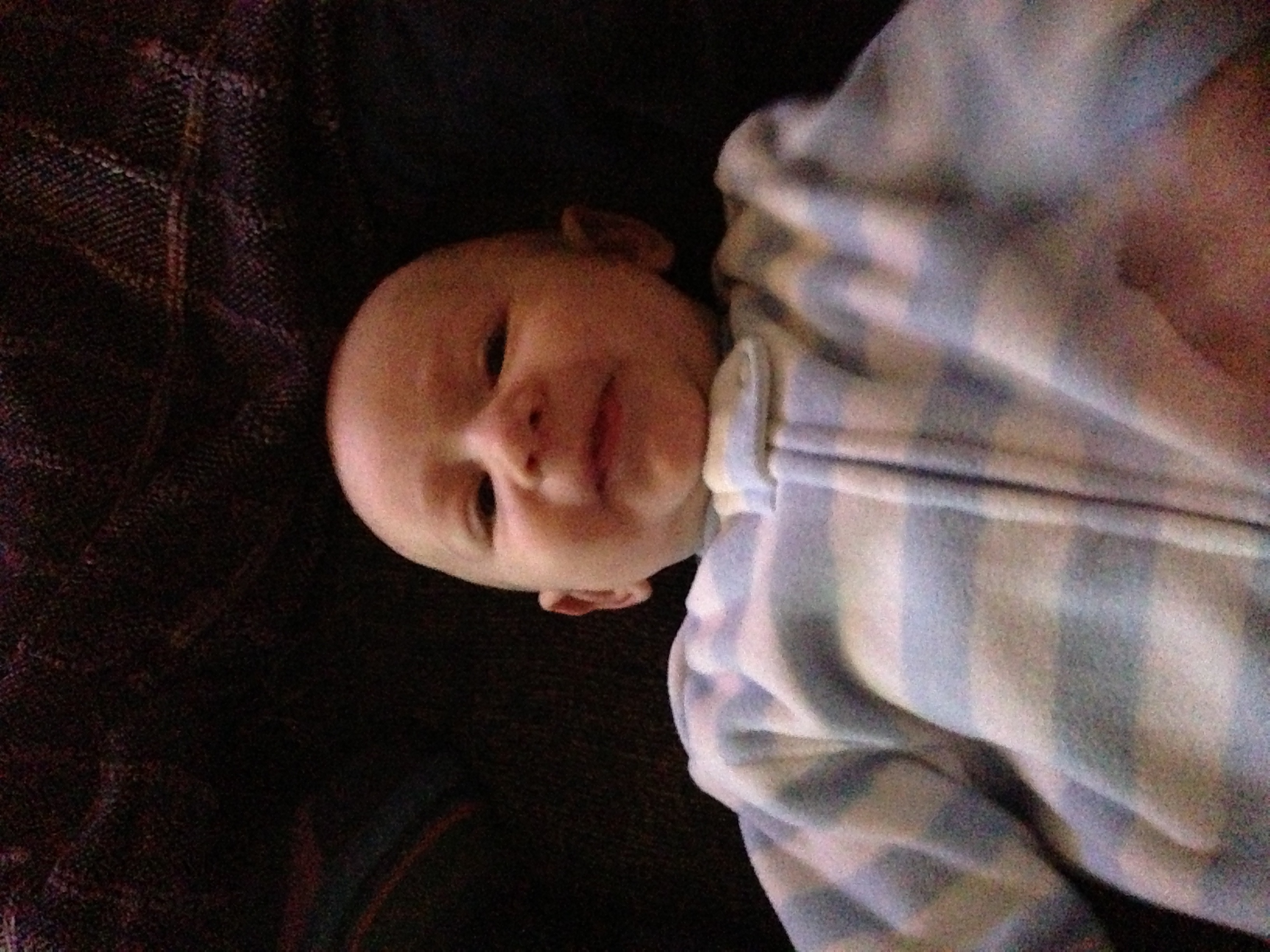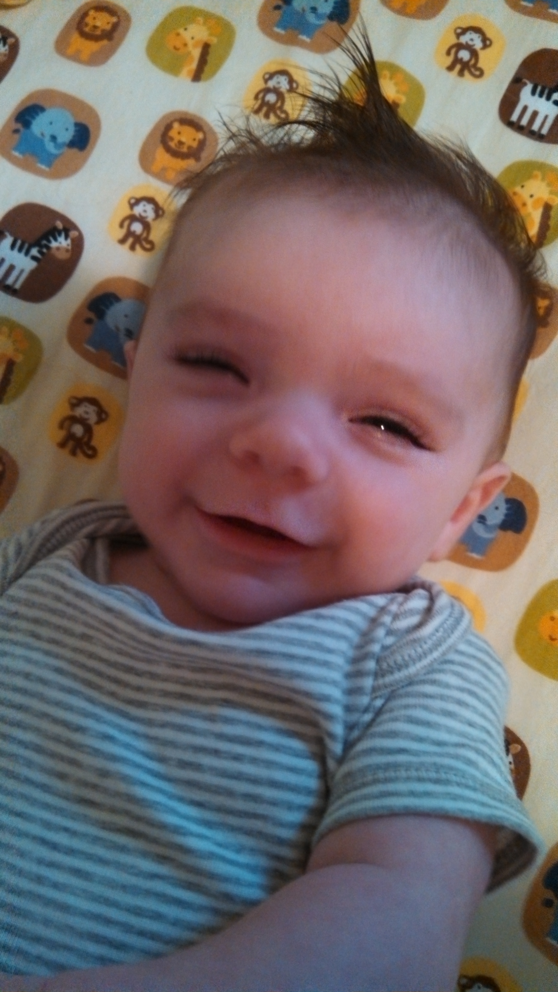 He - obviously - needed to make sure I take a nice picture this morning. I'm impressed that the mirror is actually clean! He's a little rocket and never sits still. He coos and babbles his heart out when he's being talked to (most of the time).