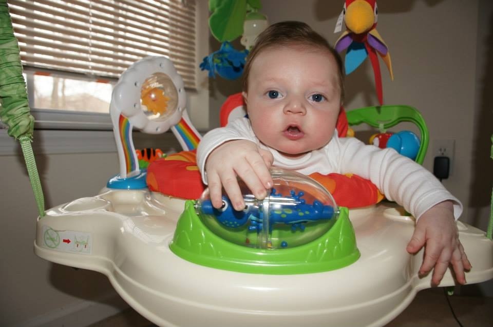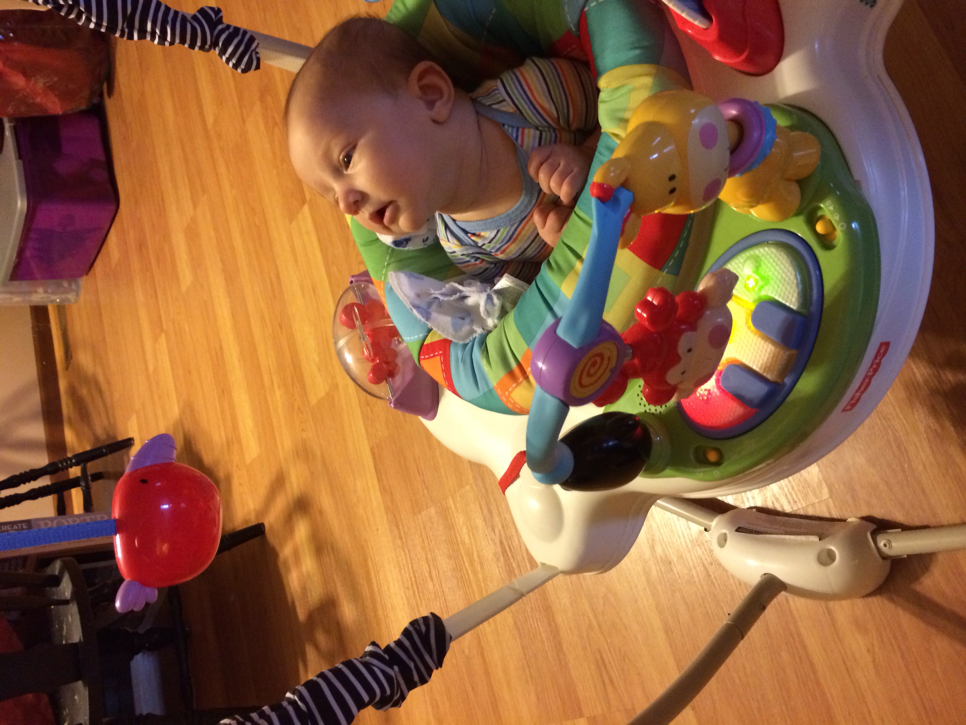 Andrew is 9 weeks old (can't believe he's that old already)! He can now roll from tummy to back and this is a picture of his first time in the jumperoo!