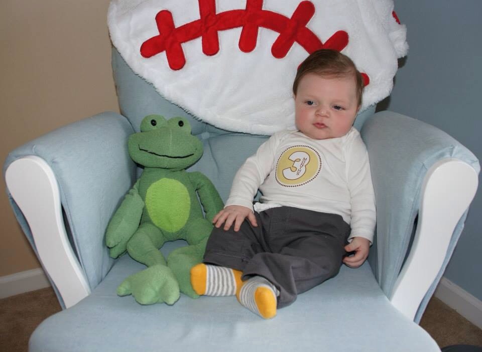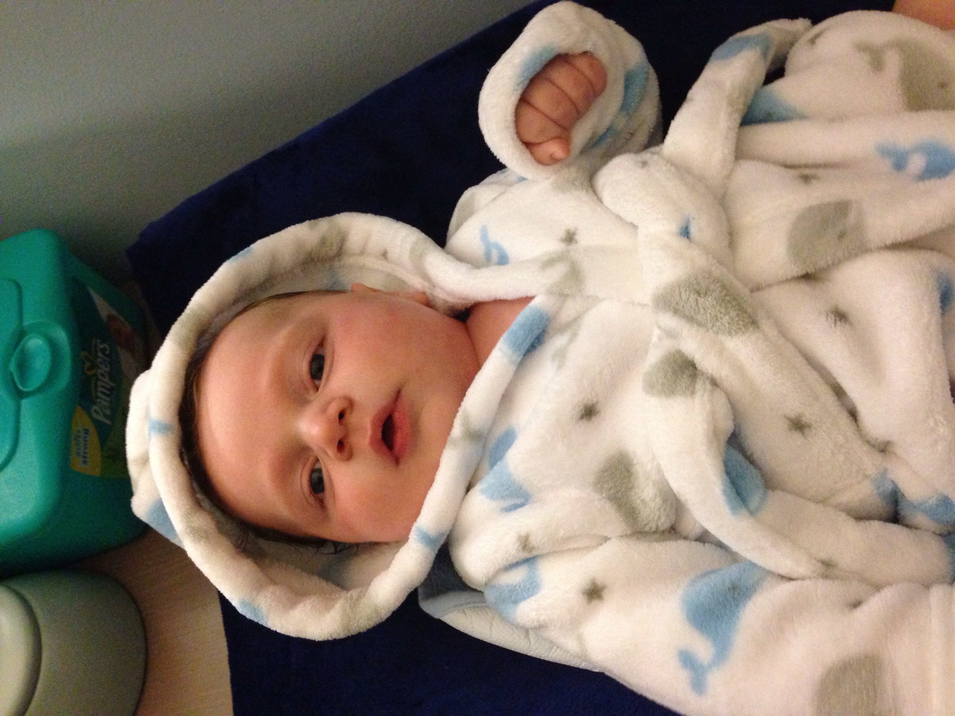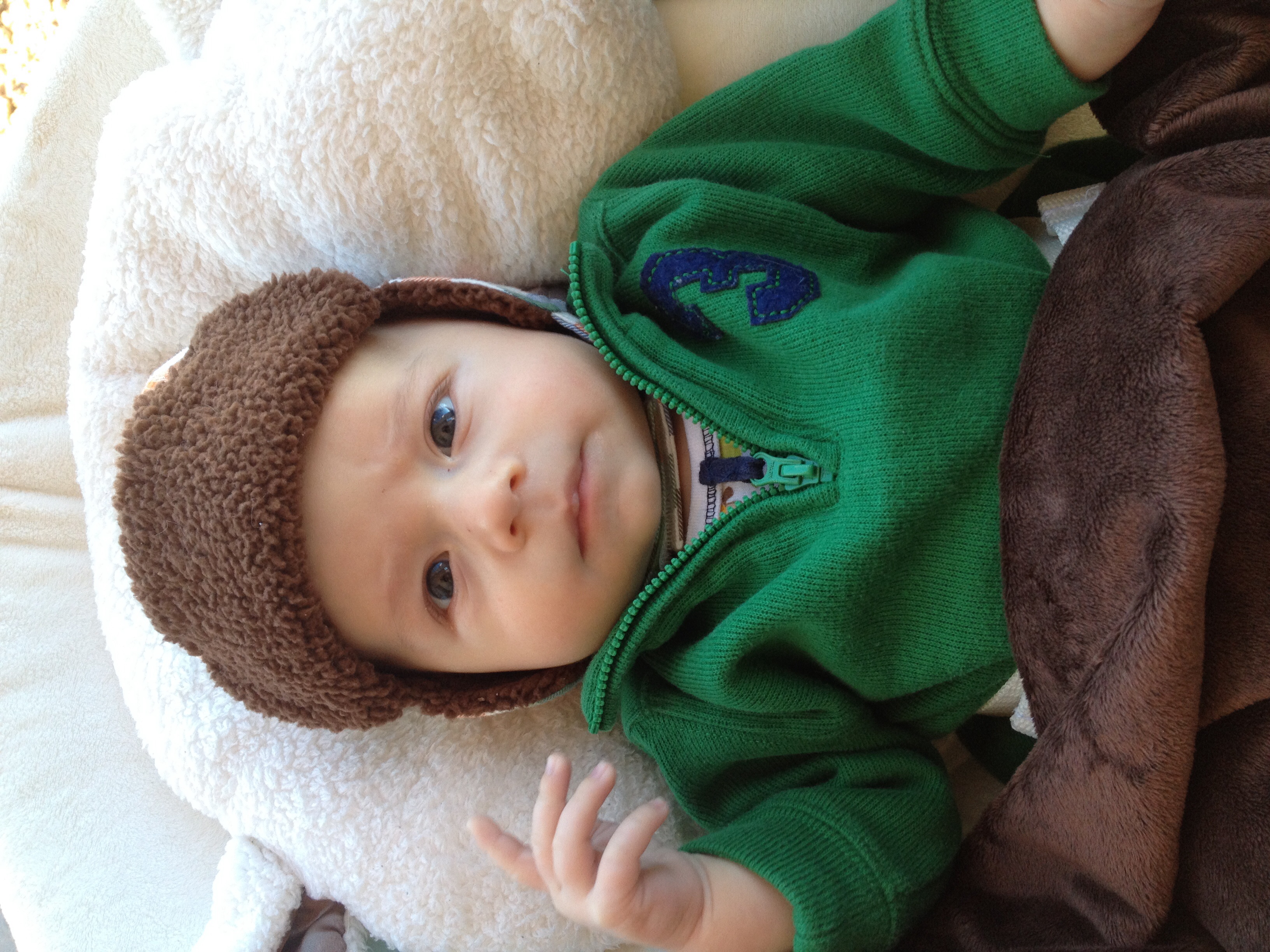 Matthew turned 3 months old on Monday...he's starting to like his jumperoo (in short spurts) and spins the lizard toy in the front, and one of him in his cozy robe after a bath
