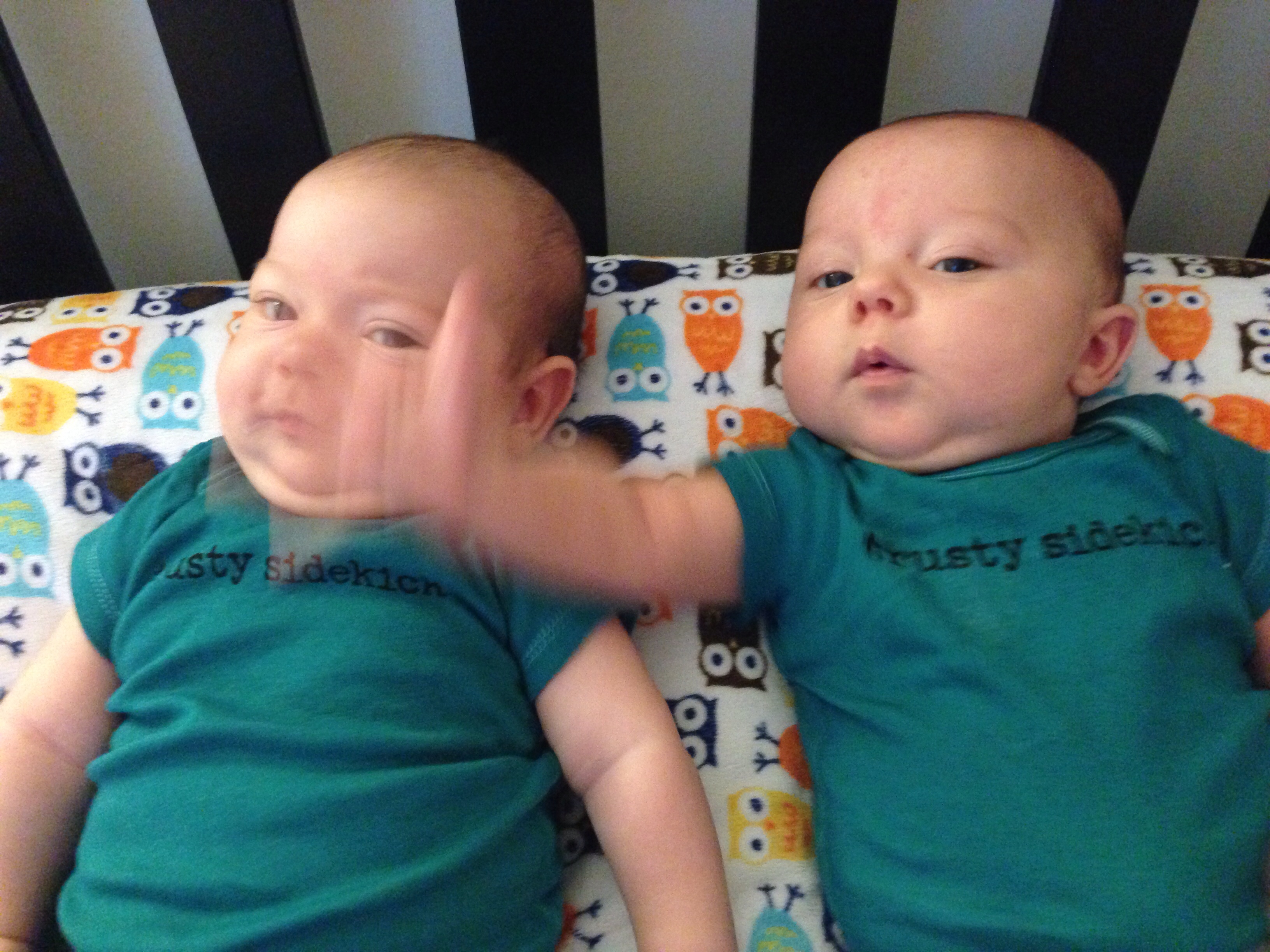 I know someone with triplets that has onesies for them that says "I was planned" the other says "I wasn't" and "me either" lol. Your boys matching outfits reminded me of it lol.