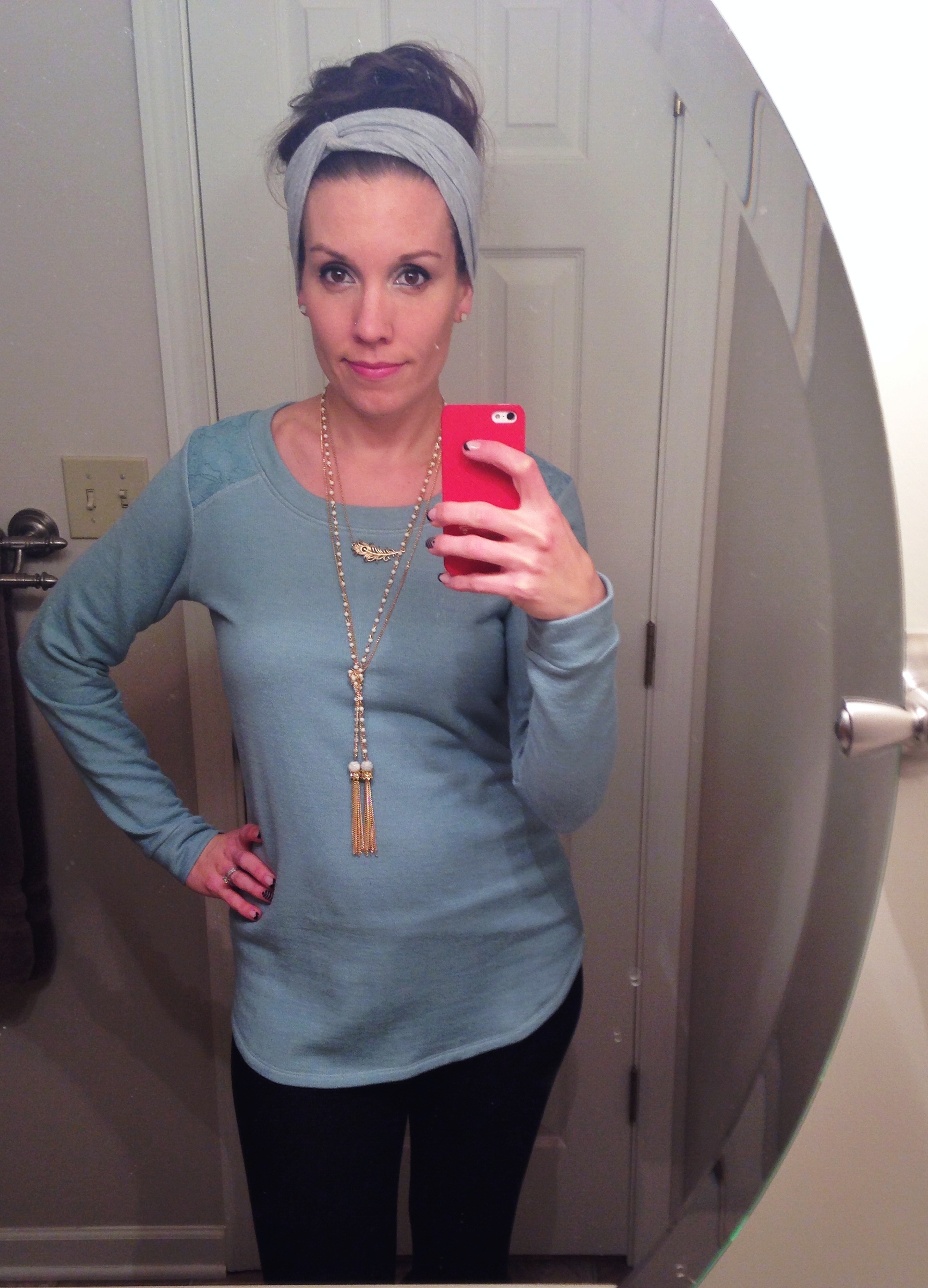 Found this top at Macy's clearance, and it's maternity, but still looks somewhat cool. And this turban. I haven't washed my hair in 4 days (just dry shampoo), and I've been wearing this thing all the time.