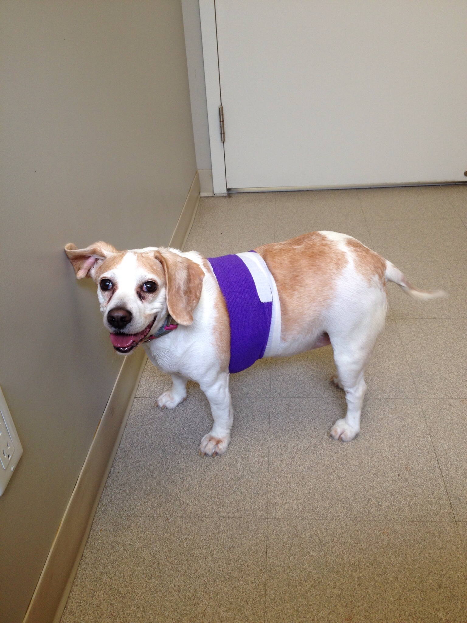My poor girl at the vet on Wednesday. Turns out a 'fat deposit' WAS a tumour and it burst. Here she s all bandaged up while I waited for the blood work to come back to find out if she was a candidate for surgery...thankfully she is! She goes on Monday to remove the tumour. Oh also the blood work confirmed she most likely has Cushing disease...poor Beagle...but she is so ridiculously happy & cute