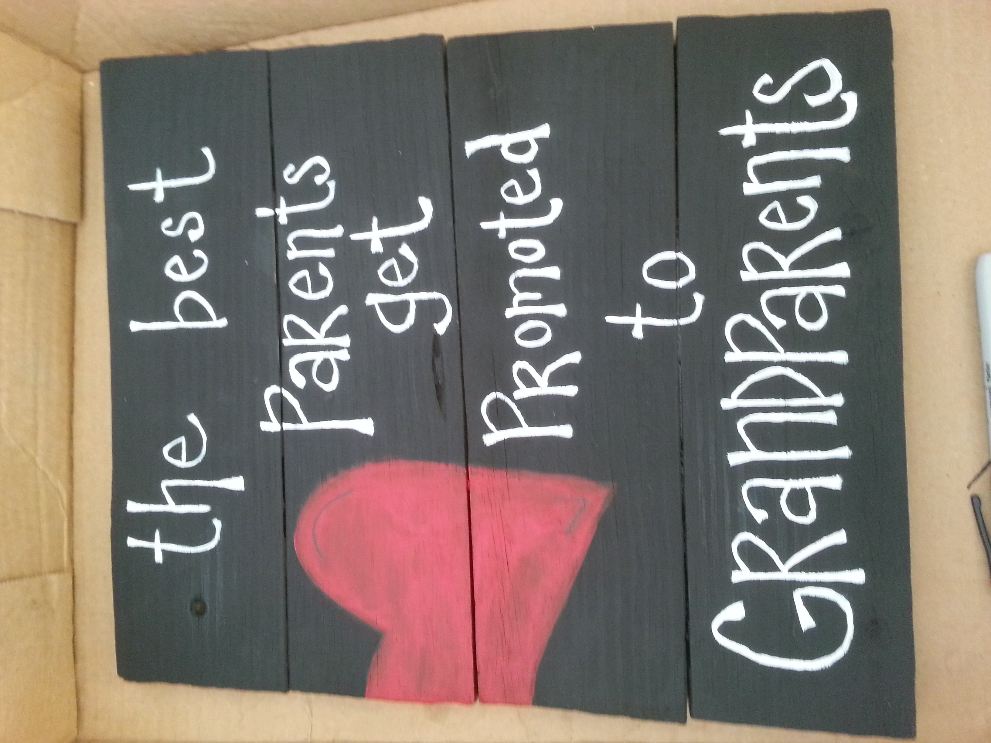 This will be their first grandbaby. I already had a trip planned to see them after the holidays.  I found out nye we were expecting so we decided to tell them while visiting because I wanted to do it in person. I salvaged some old fence boards and painted this (got idea off etsy). My mom cried my dad was beyond excited!