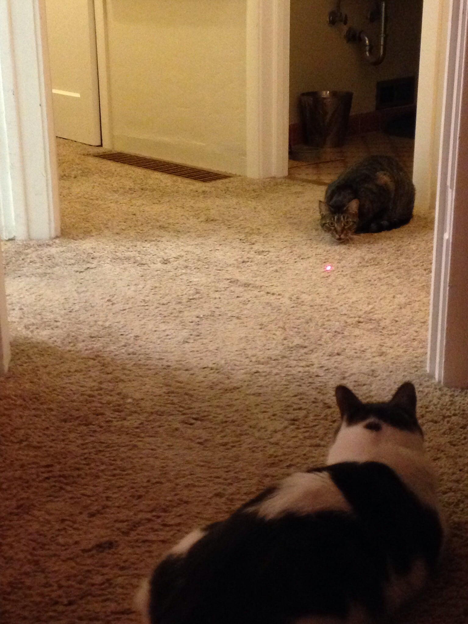 And here's Rocco and Reggie playing with the laser pointer. It was actually Reggie chasing it and Rocco keeping an eye on Reggie.