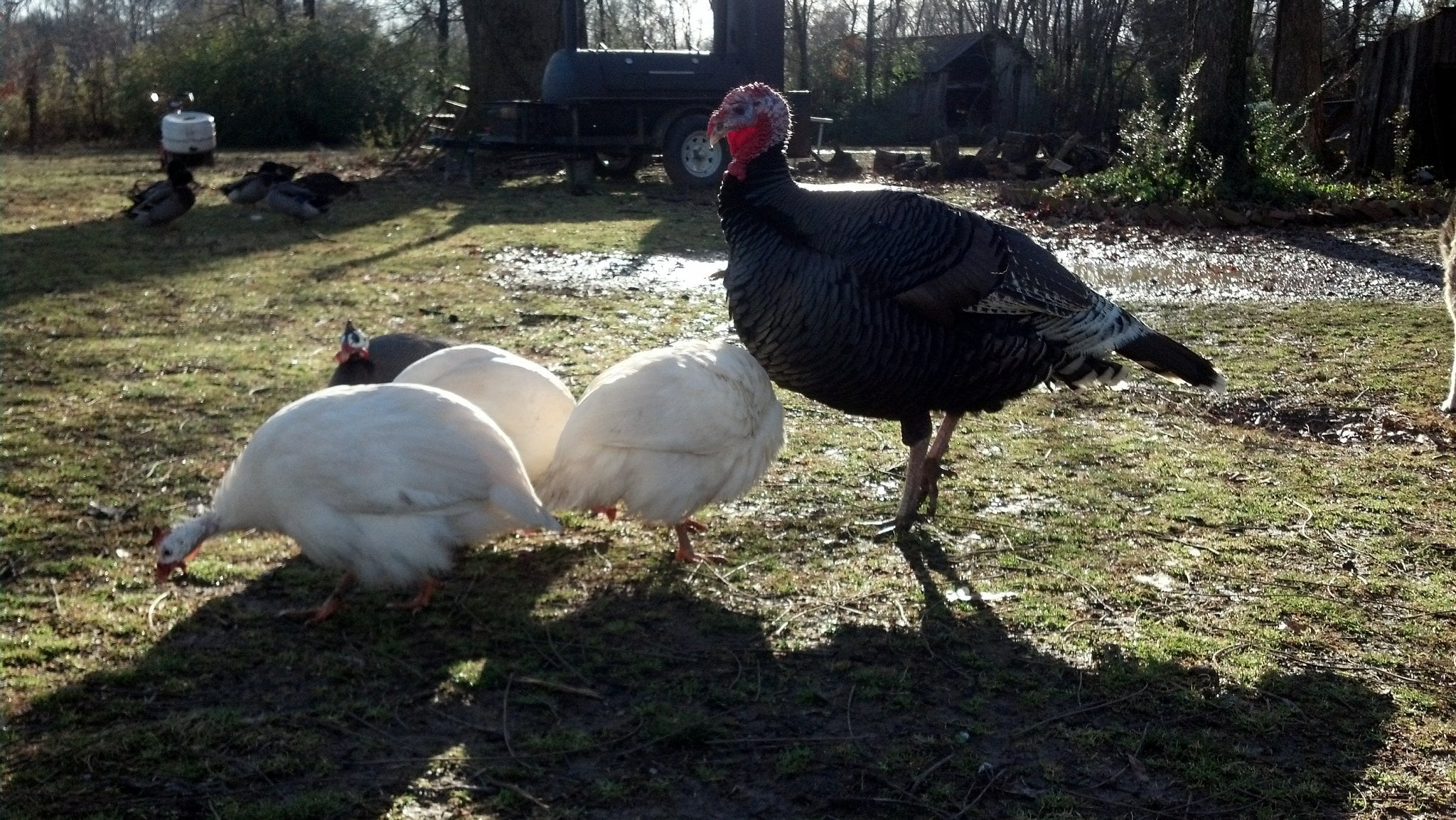 Also, here's a pic of one of the turkeys and our guineas. They are so stinking loud.