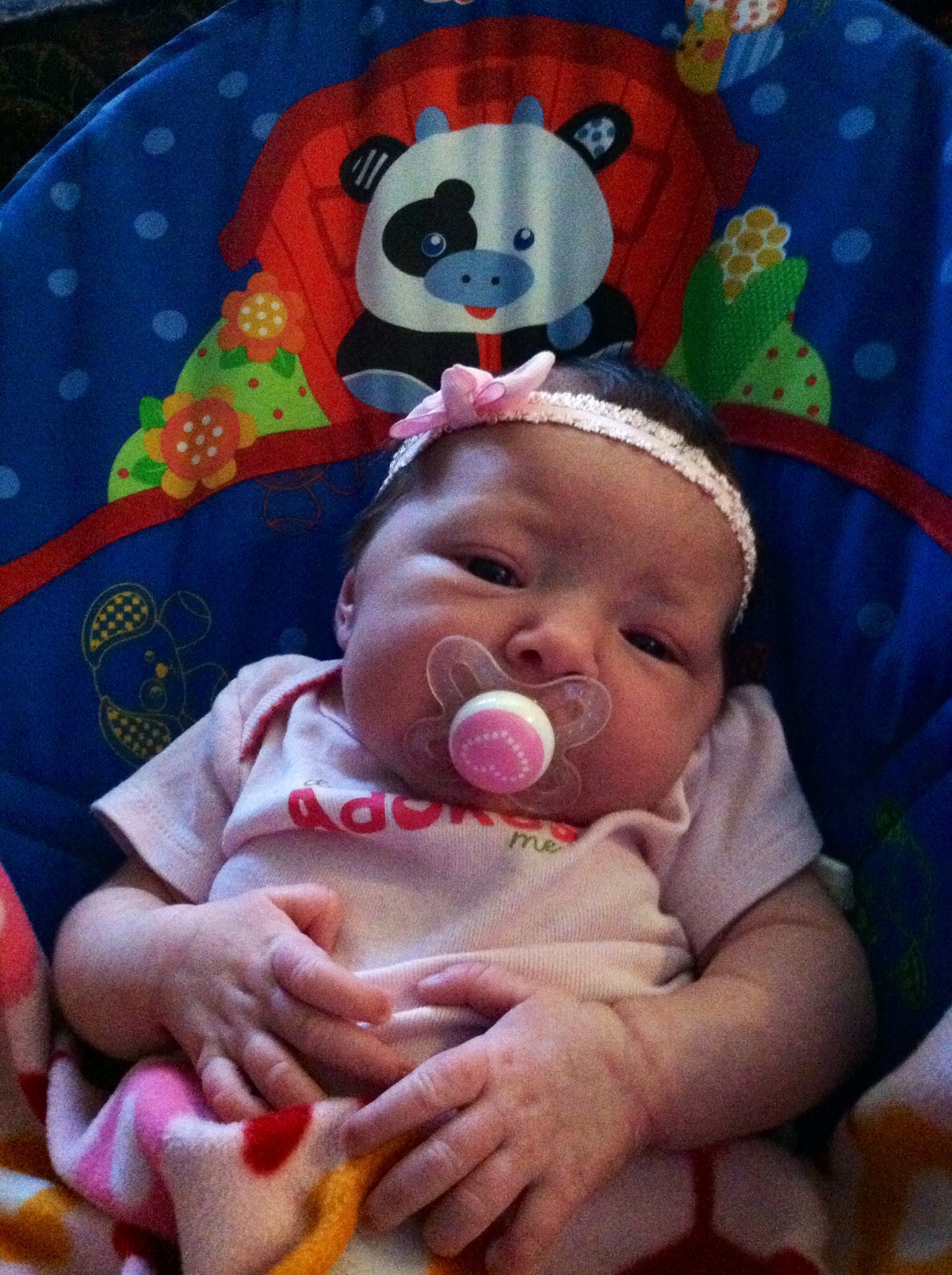 holding my hand for the first time, about a month old