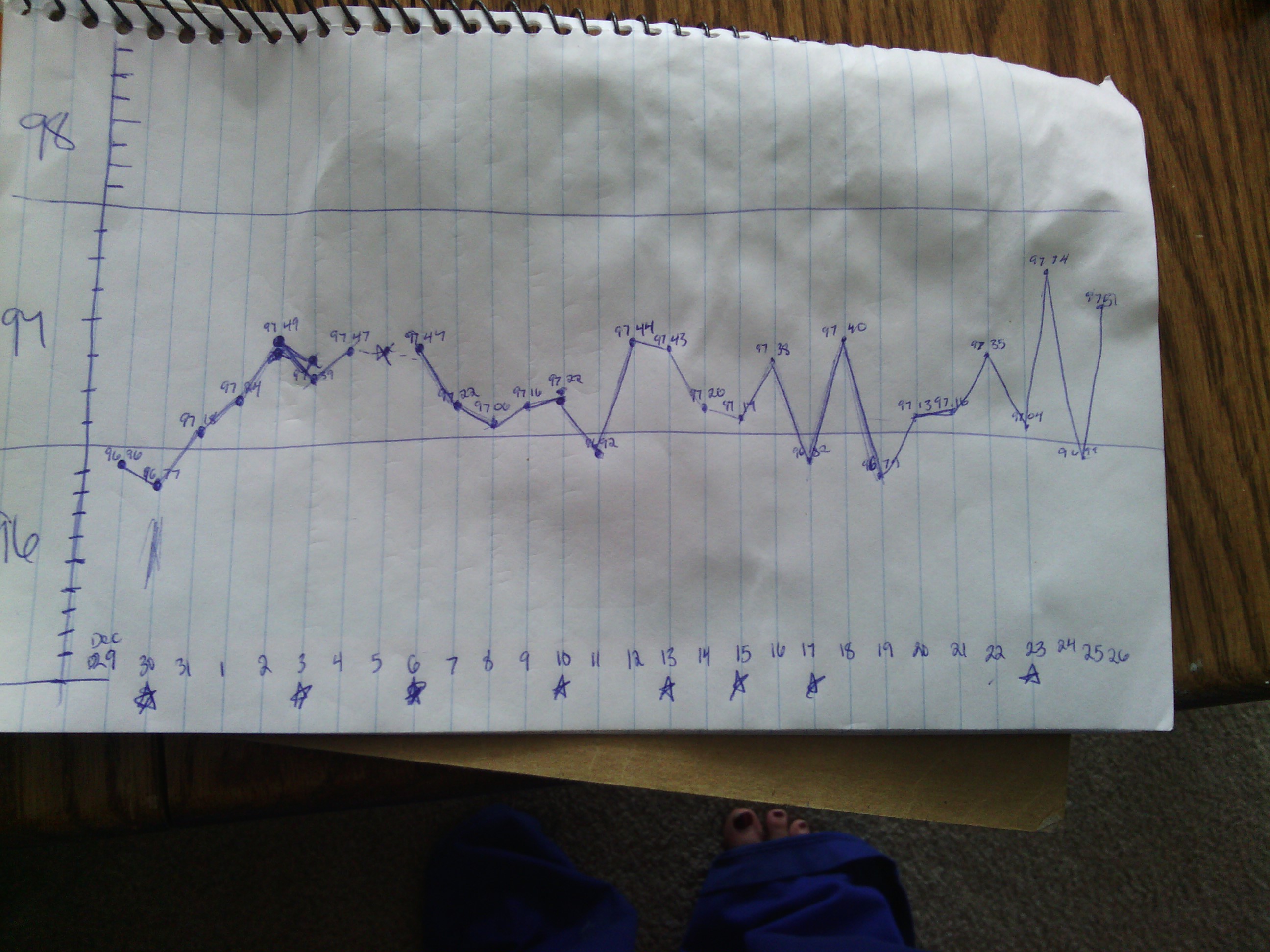 Can someone please help me with my messed up chart? I have no clue what's going on. I've been temping with ff but it doesn't show my whole chart since I'm on cd 225. I made a crappy paper chart just so I could see a picture. I was thinking I may have O'd on Dec 30. But then my chart kind of looks like I didn't O at all.