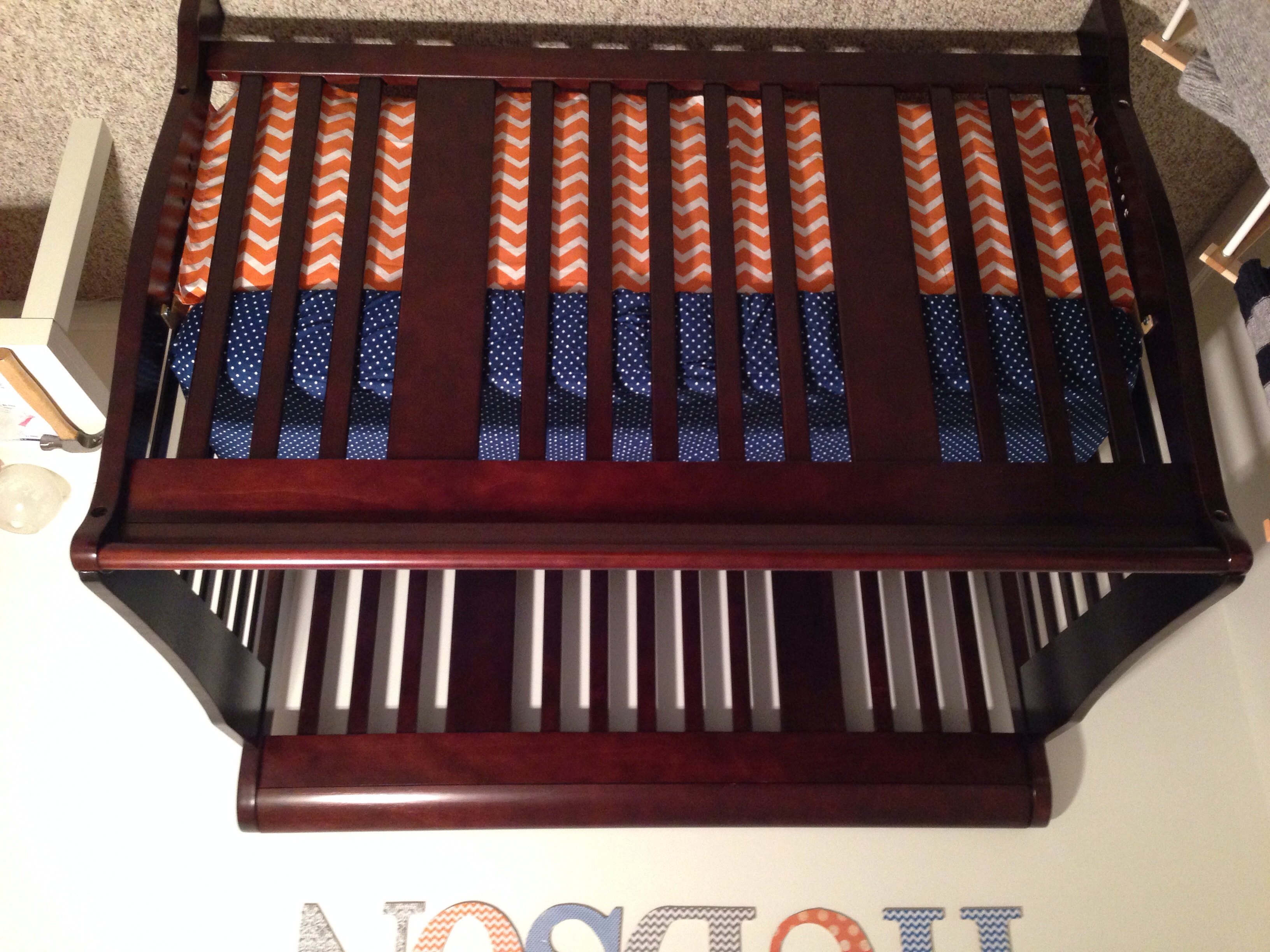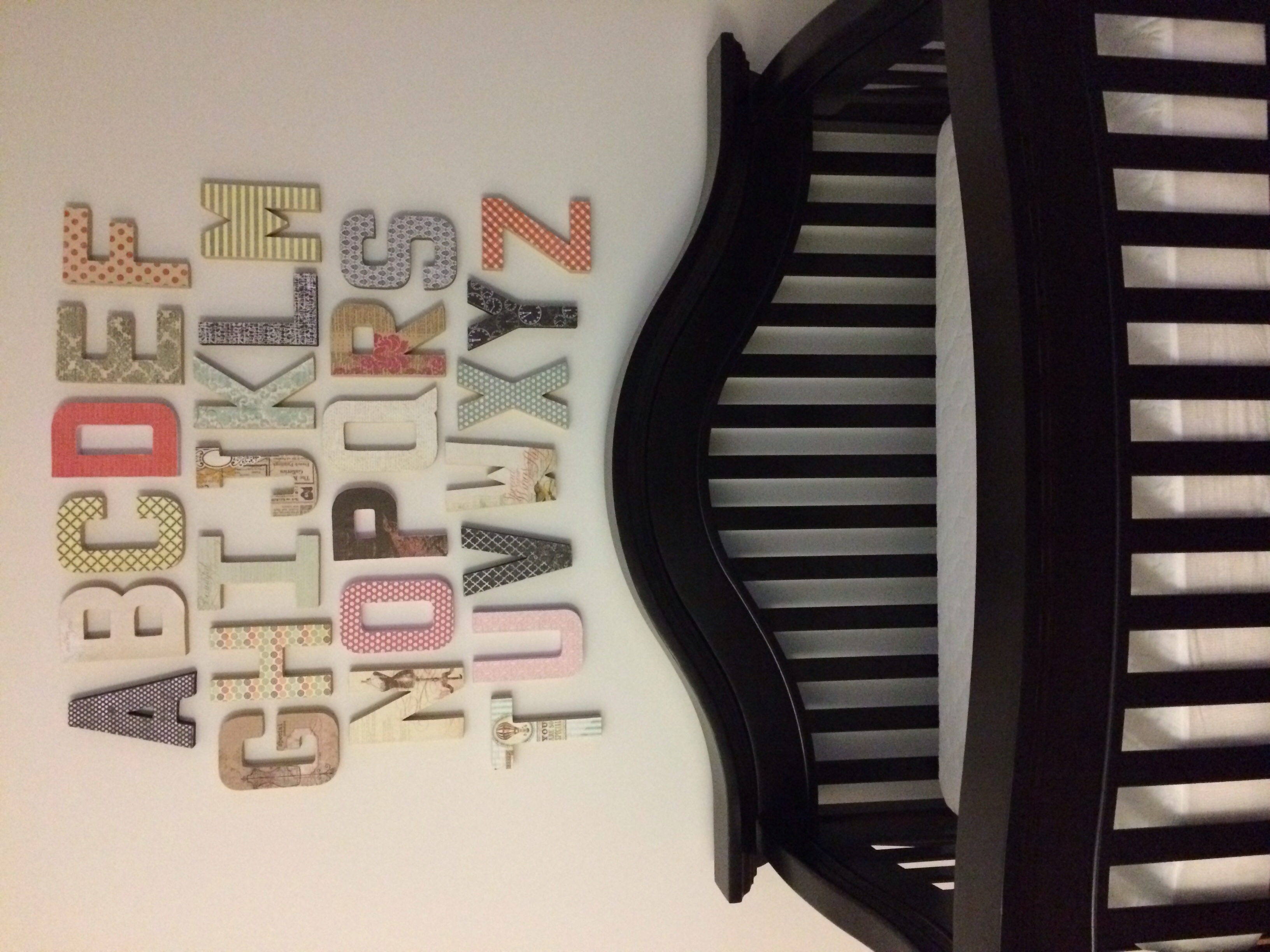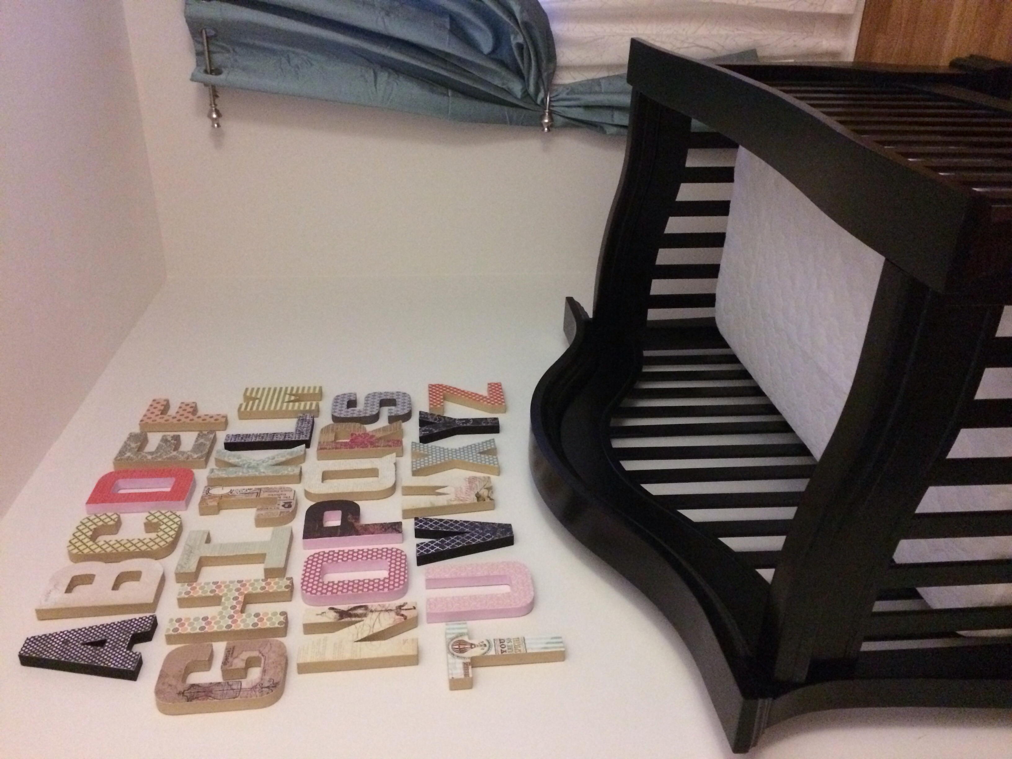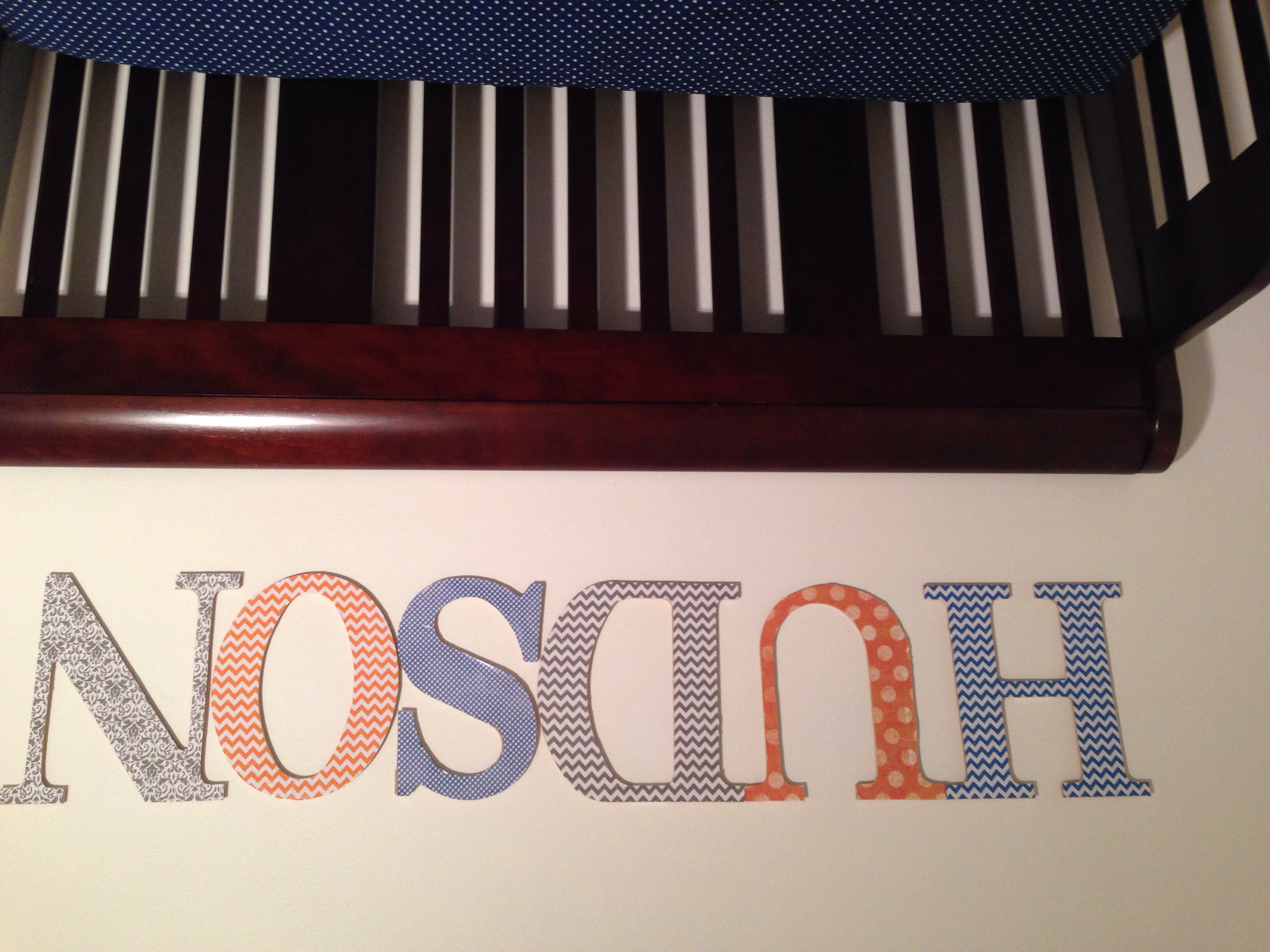 Here is his name with deco paged letters, I also sewed the crib skirt. The Chinese lanterns I bought, but then had to find a crafty way to hang them. Last things are the burp cloths I sewed.