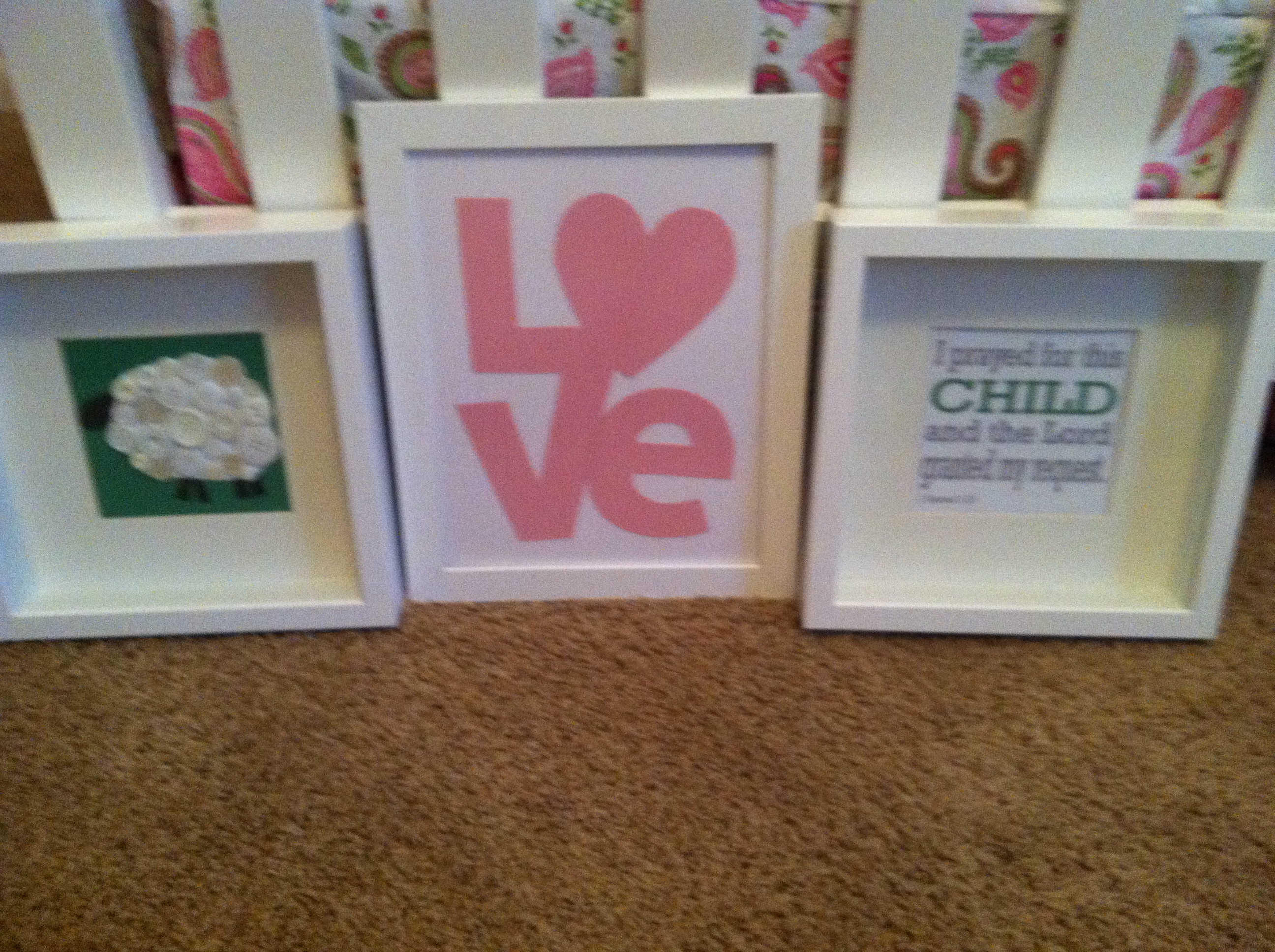 Second pic is some more paper crafts I did. I'm doing a frame collage so I had several frames to fill. The lamb is just a bunch of buttons hot glued into the shape (not sure how well you can see it), the LOVE is hand-cut, and the Bible verse I just typed on MS Word.