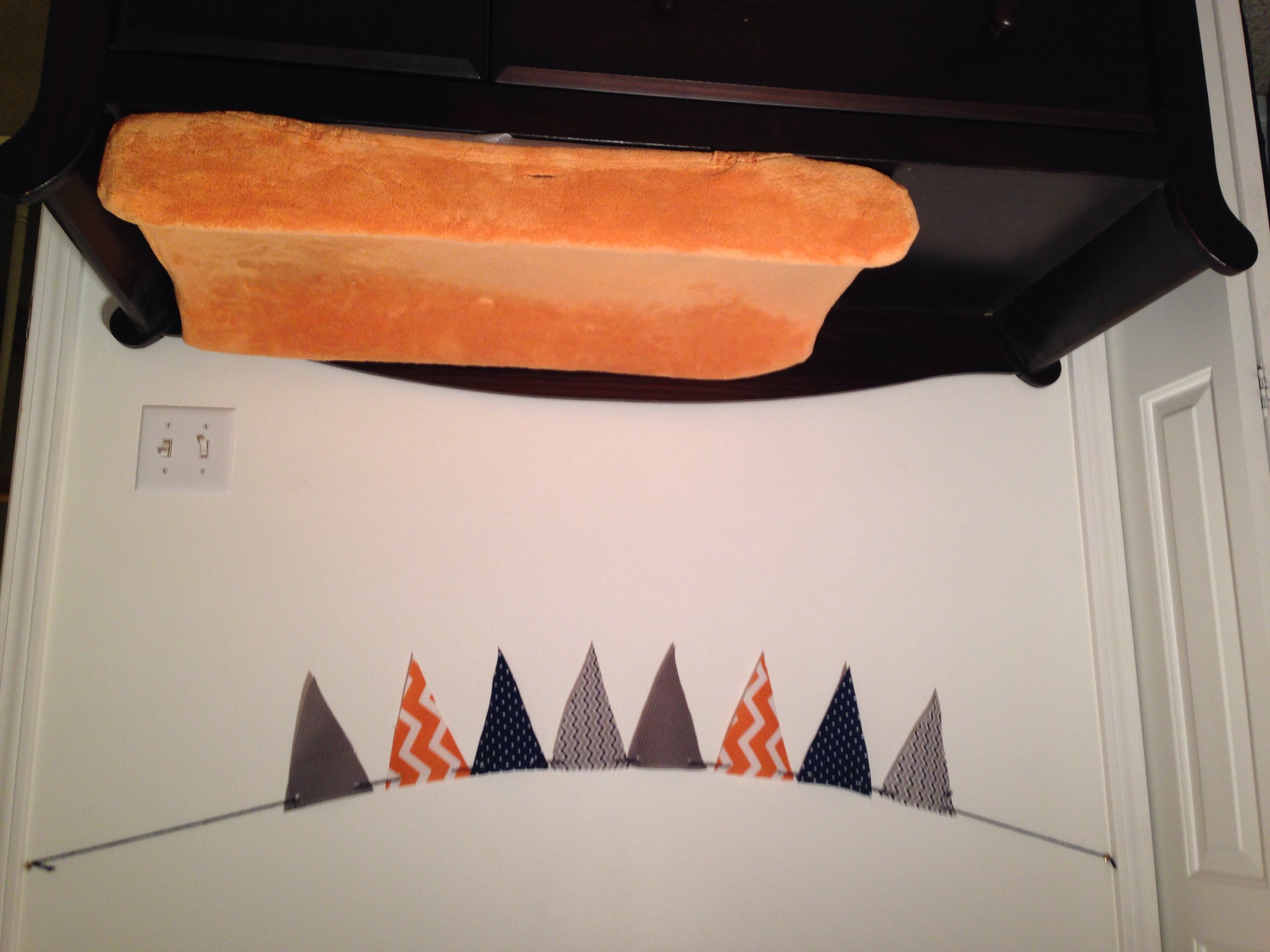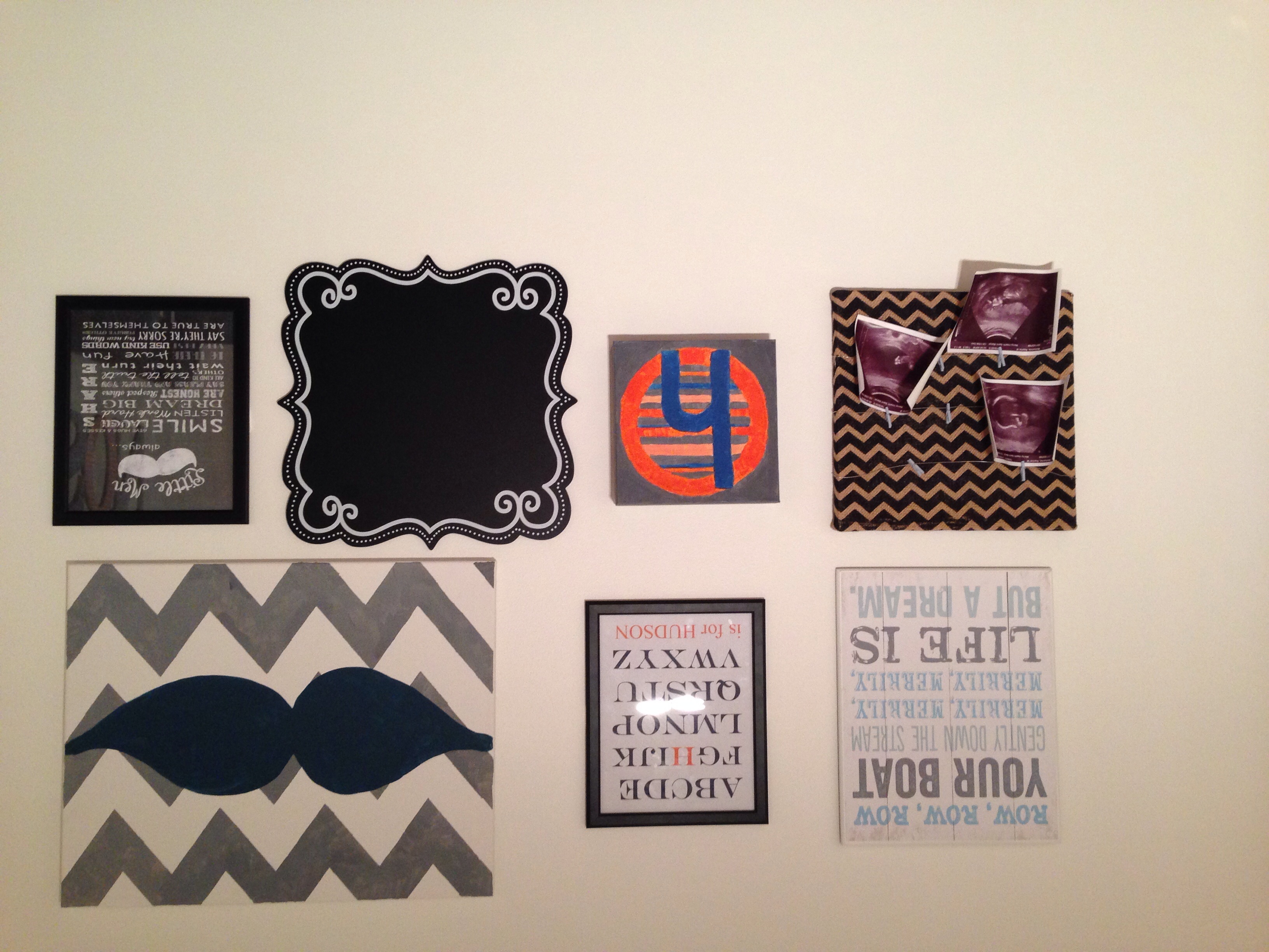 These are the latest I've done. Fabric bunting with leftover fabric, I painted the mustache chevron painting and did the alphabet picture in ms word, the Black and Tan chevron just had wire added with clips so I could clip pictures. I'll post the other pictures in a second.