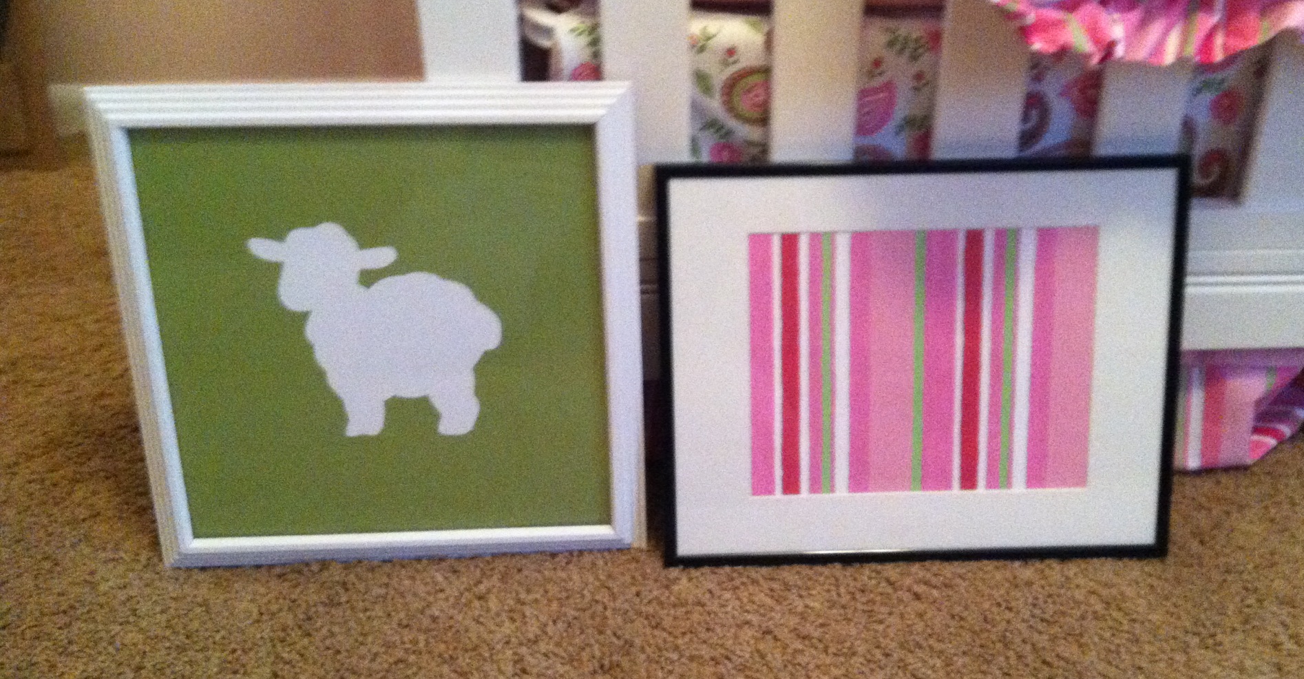 First pic is a lamb silhouette I hand-cut and the stripes I painted. The stripes are the same as the stripes on the bedding (as you can see).